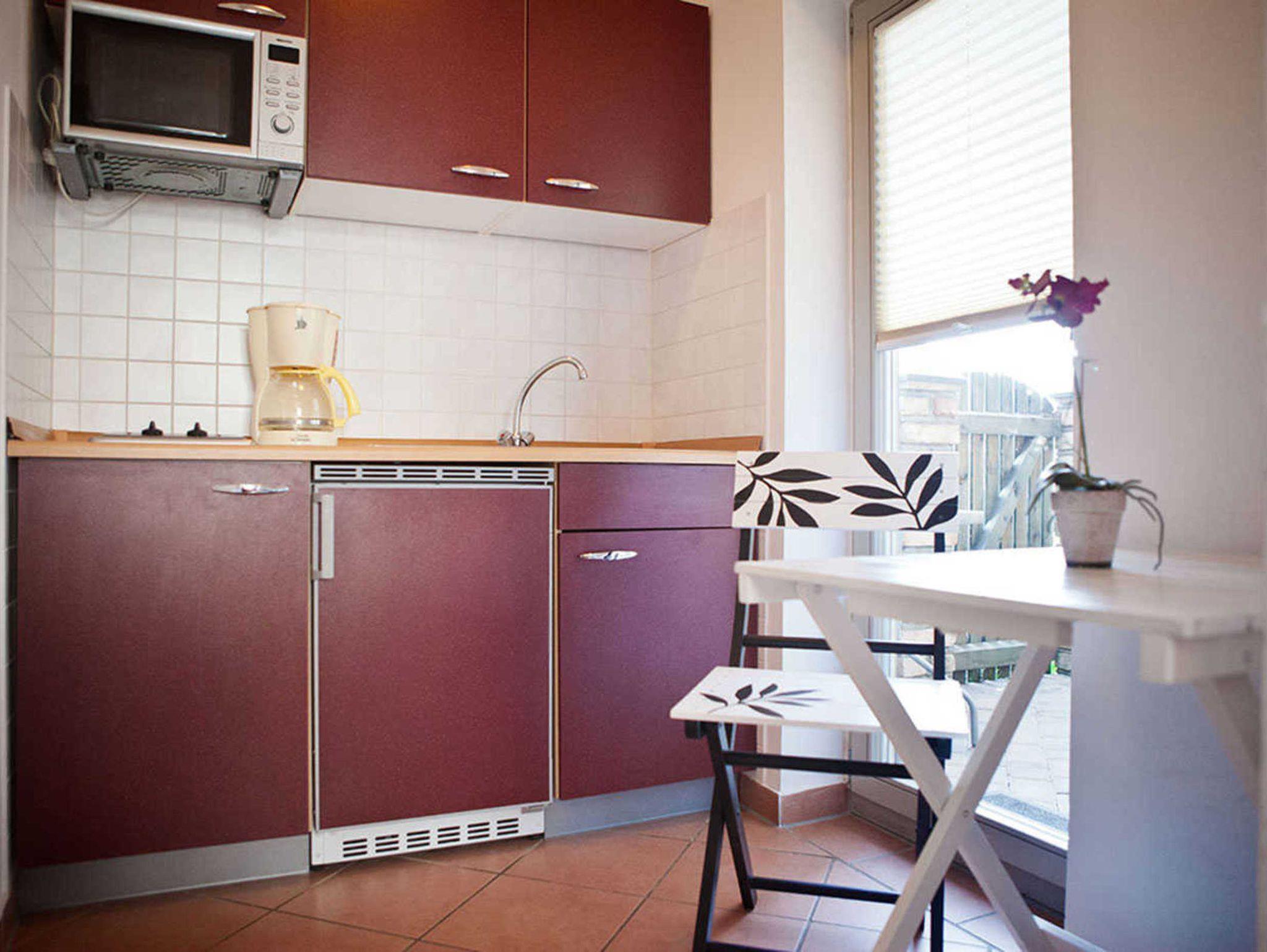 Unsere Ferienwohnung (ca. 27 m²) befindet sich in der Langenstr. 41a im Erdgeschoss und ist über 2 Stufen erreichbar. Sie verfügt über einen kombinierten Wohn-/ Schlafraum, mit kl. Couch und offener Küche. Das Bad ist gefliest, mit Dusche und Fenster. Die kleine Terrasse ist über die Küche erreichbar und wird mit einer weiteren Ferienwohnung geteilt. Von dort aus haben sie einen schönen Blick zum Hafen und dem Ozeaneum Stralsund.