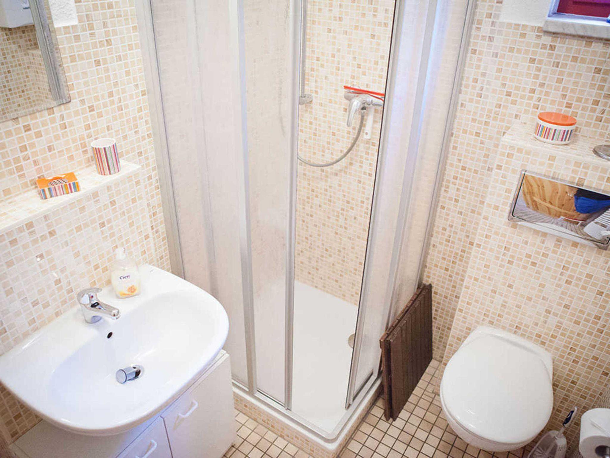 Das Bad ist gefliest, mit Dusche und Fenster.