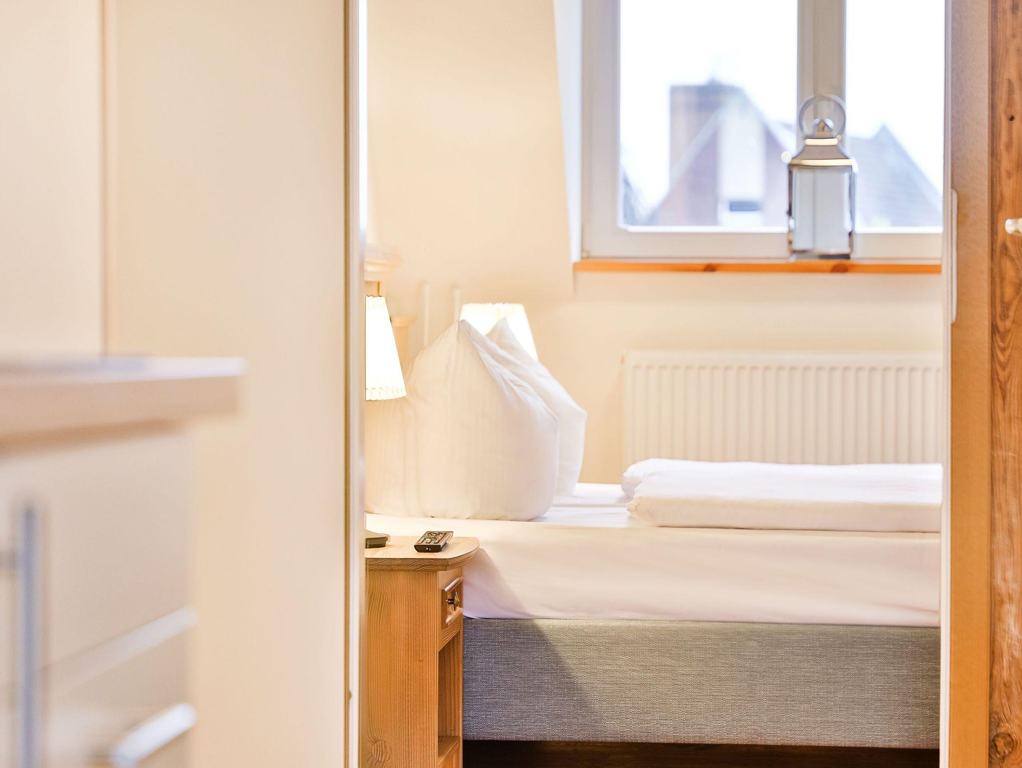 Unsere Zwei-Raum-Apartments Deluxe befinden sich im 3. Obergeschoss und verfügen über ein separates Schlafzimmer mit einem gemütlichen Boxspringbett. Zur Ausstattung gehören eine Sitzecke, TV/Radio, eine praktische Küchenzeile, ein Badezimmer mit Dusche und teilweise ein Balkon zum Innenhof.