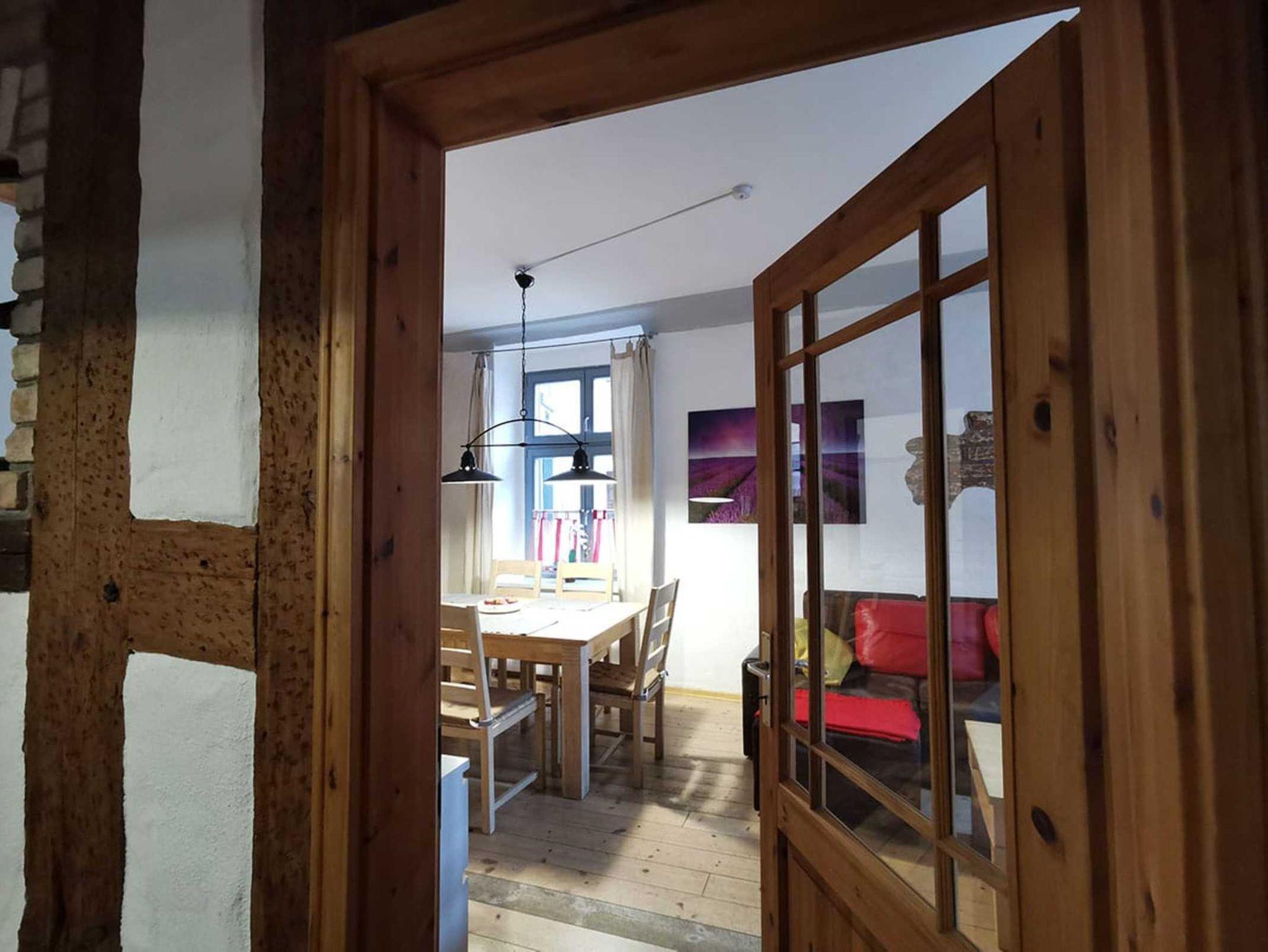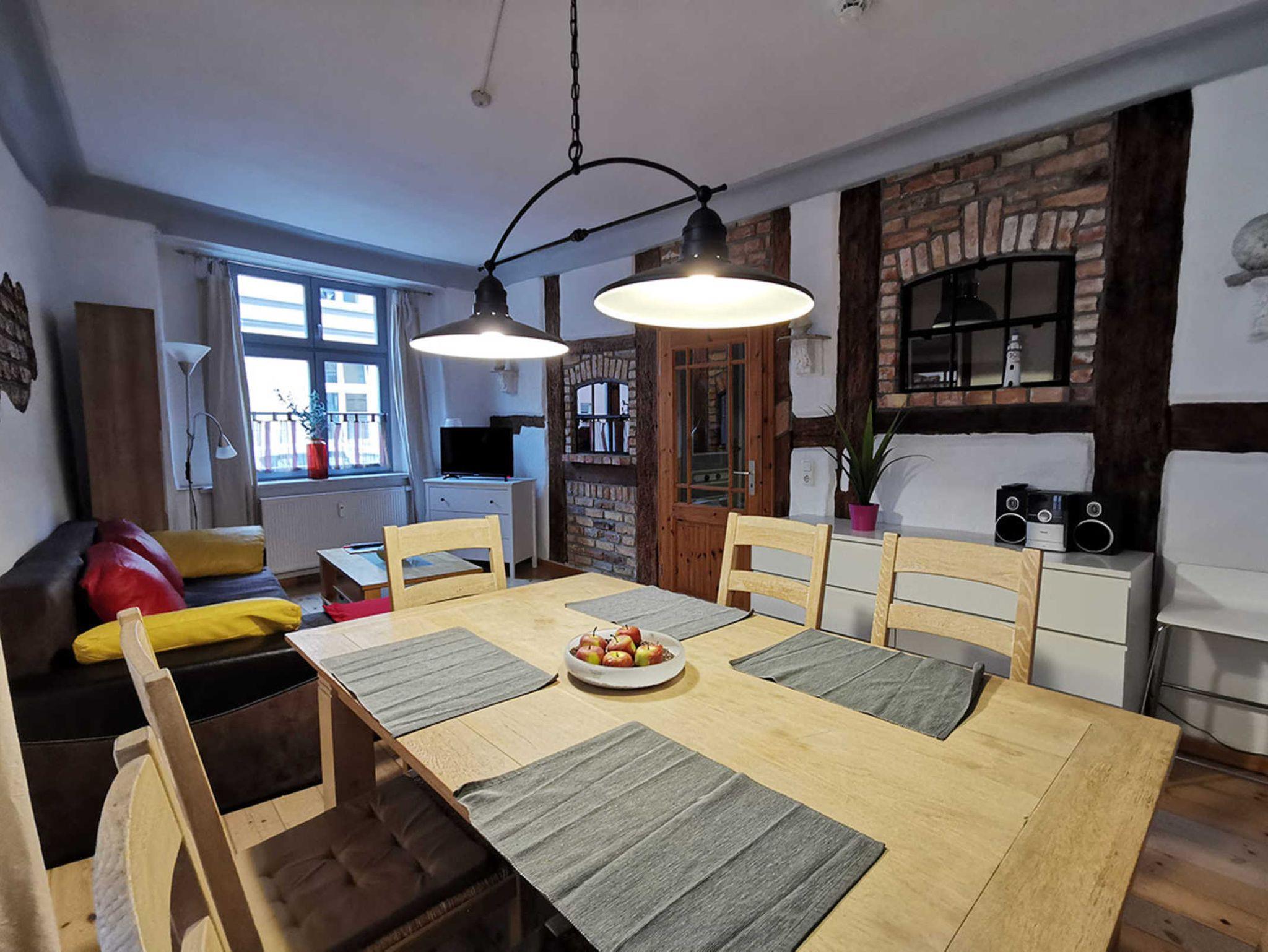 Unsere Ferienwohnung (ca 70 m²) befindet sich in der Frankenstr. 49 im Erdgeschoss, direkt in der Altstadt in Hafennähe. Sie verfügt über ein Wohnzimmer mit großem Esstisch für 6 Personen und 2 Schlafzimmer. Die Aufbettung für die 5. und 6. Person befindet sich auf der Schlafcouch im Wohnzimmer. Die Küche mit Einbauküche und großem Esstisch hat Zugang zur Terrasse, mit Blick zum historischen Innenhof. Das Bad ist gefliest mit WC und Dusche.