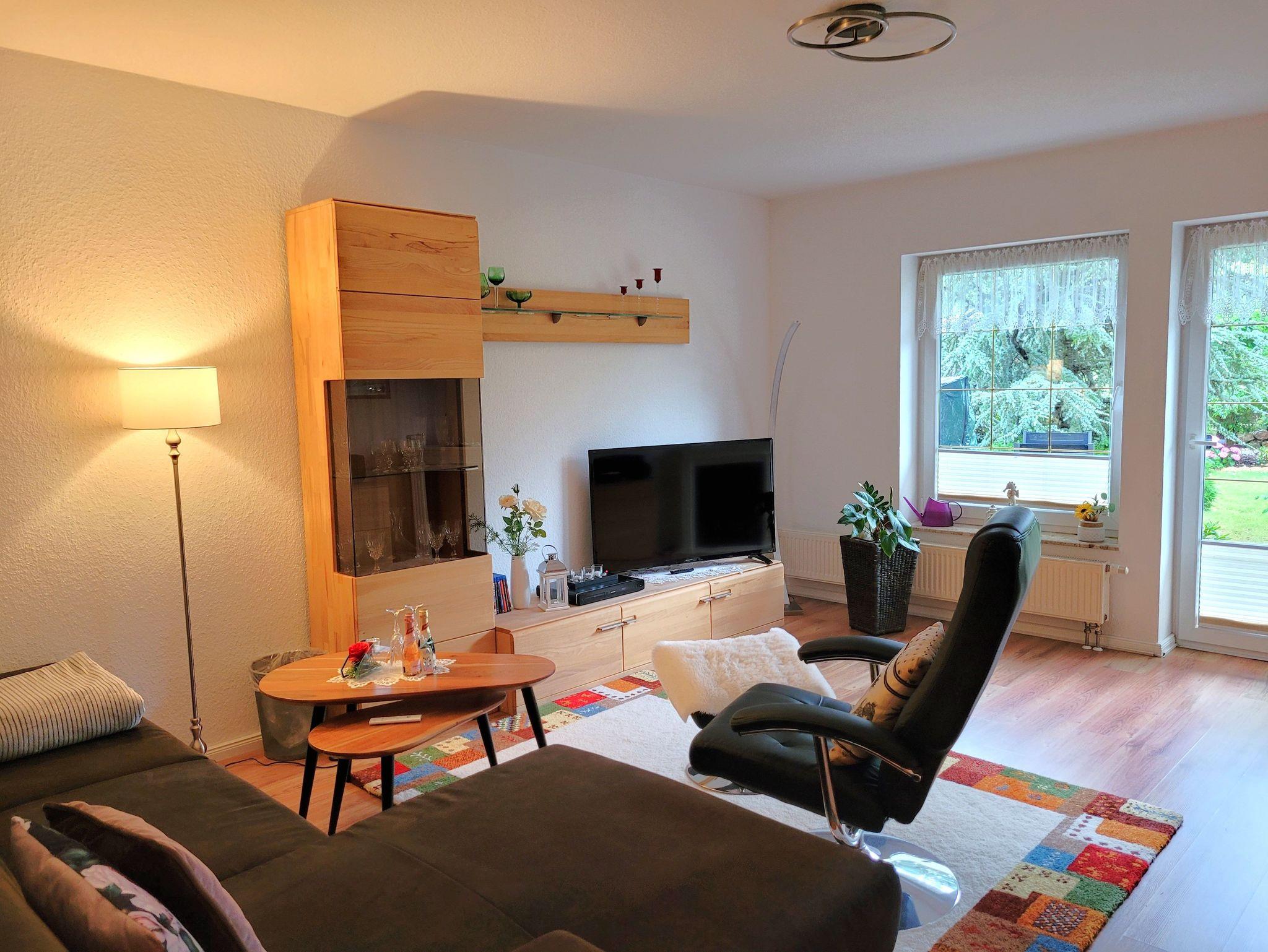 Die Ferienwohnung mit 56m² besteht aus einem Wohnzimmer mit gemütlicher Couch (Aufbettung für 2 Personen), TV und E-Kamin für gemütliche Stunden.