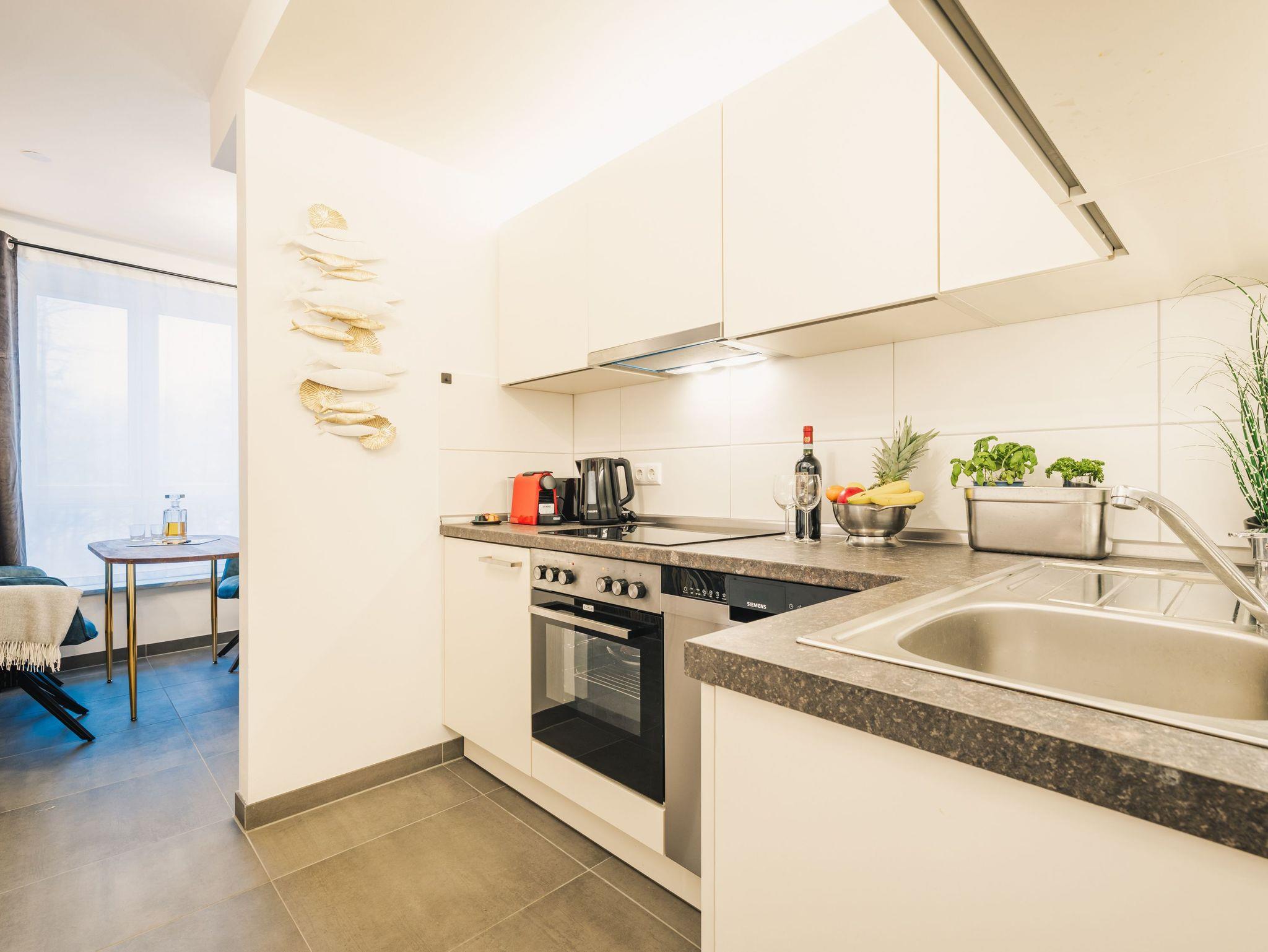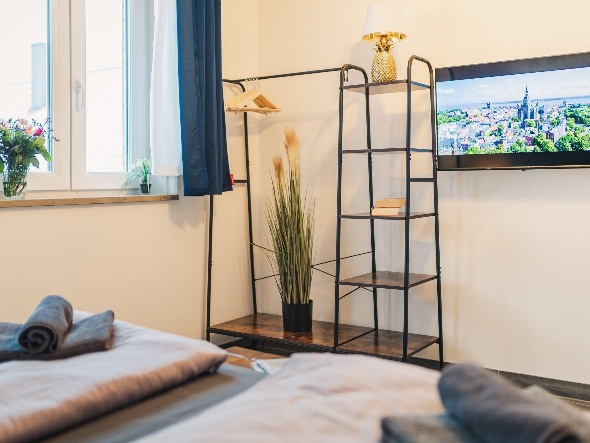 Das Altstadt-Studio 9 liegt im 1. Obergeschoss mitten in der Hansestadt Stralsund und bietet auf ca. 55 m² Platz für bis zu 4 Personen. Die Ferienwohnung ist ideal für Paare, Freunde oder kleine Familien, die das besondere Flair der Altstadt genießen und dennoch komfortabel wohnen möchten. Das Studio verfügt über ein separates Schlafzimmer mit einem komfortablen Doppelbett (180x200) und Zugang zu einem kleinen Balkon. Ein weiteres Doppelbett (160x200) befindet sich in einer gemütlichen Schlafnische, die sich mit einem Vorhang abtrennen lässt und so zusätzliche Privatsphäre bietet. Der offene Wohn- und Essbereich ist hell und einladend gestaltet. Hier erwarten dich ein gemütliches Sofa, ein TV sowie ein Esstisch für gemeinsame Mahlzeiten oder entspannte Abende. Die offene Küche ist voll ausgestattet mit Backofen, Herd, Kühlschrank, Geschirrspüler, Nespresso-Kaffeemaschine und French Press - ideal für Frühstück, kleine Kochabende oder den ersten Kaffee vor dem Stadtbummel.