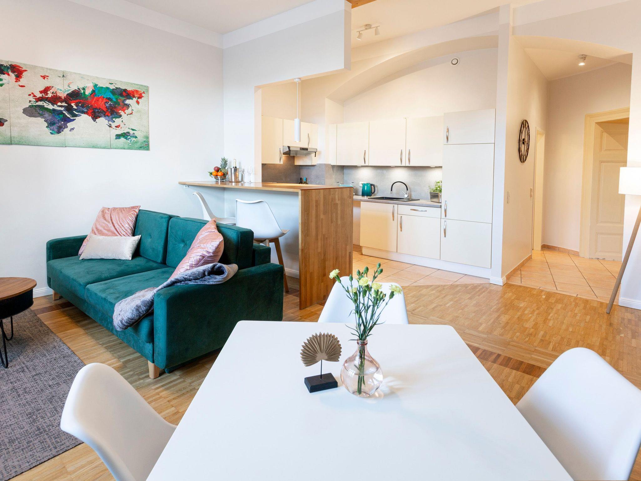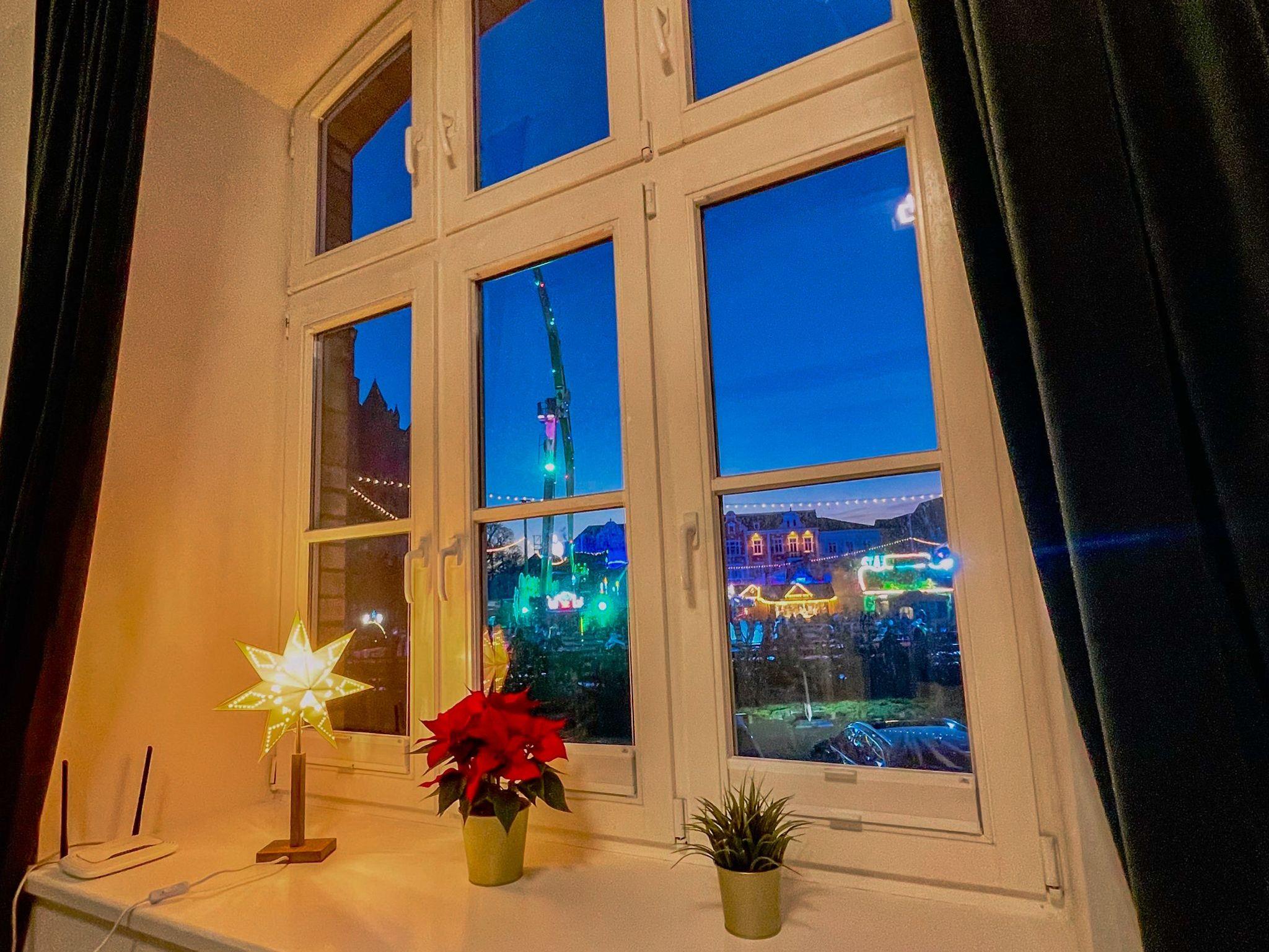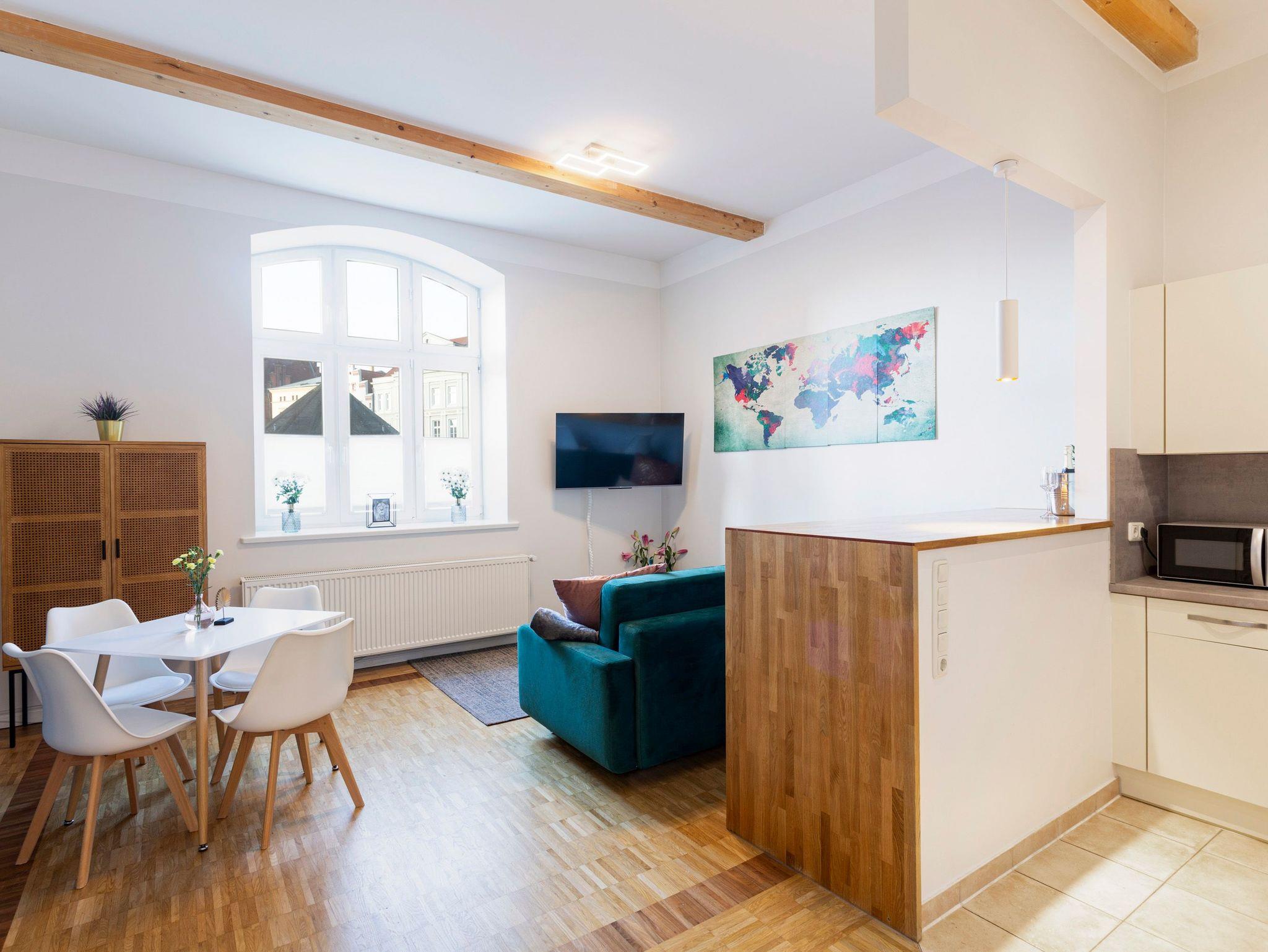 Das Altstadt-Studio 5 erreichen sie direkt über den Eingang am Neuen Markt und ist für bis zu 4 Personen geeignet. Die 56 m² große Ferienwohnung befindet sich im Erdgeschoss des Hauses und ist über eine Treppe zugänglich. Vom geräumigen Flur aus, gelangen die in das Schlafzimmer mit Doppelbett (180x200), das Bad mit Dusche, Waschbecken und WC, das Gäste-WC und das große Wohnzimmer mit offener Küche. Die Küche ist mit einem Kühlschrank, Herd, Backofen und Geschirrspüler ausgestattet. Küchenhelfer, wie Wasserkocher, Toaster und Kaffeemaschine sind ebenfalls vorhanden. Des Weiteren befinden sich ebenfalls ein Tresen und Esstisch direkt an der Küche. Auf dem Schlafsofa (140x200) können sie bequem Fernsehen oder entspannen. Das Wohnzimmer und Schlafzimmer sind zum Neuen Markt ausgerichtet und lassen viel Licht in die hellen Zimmer.