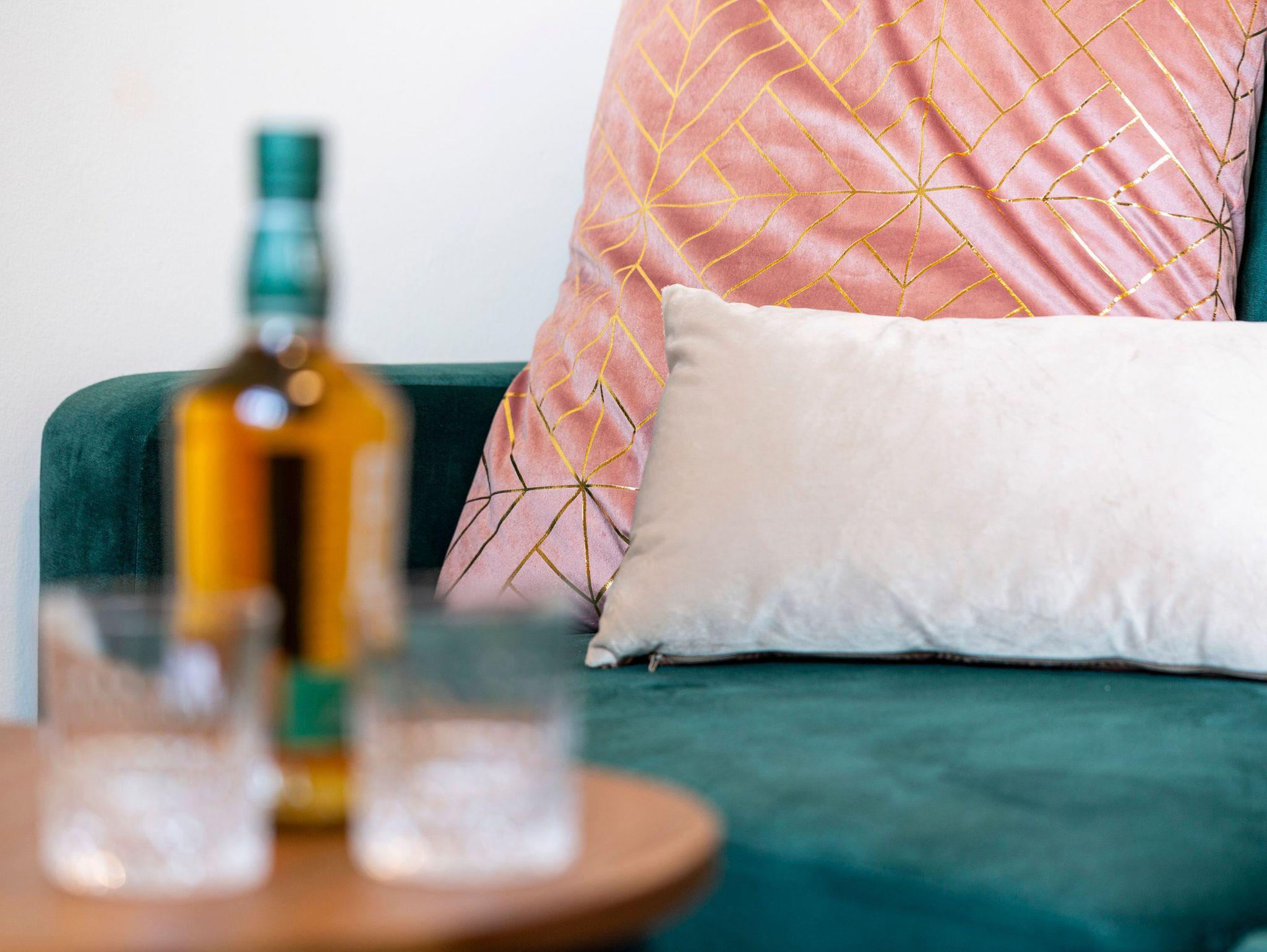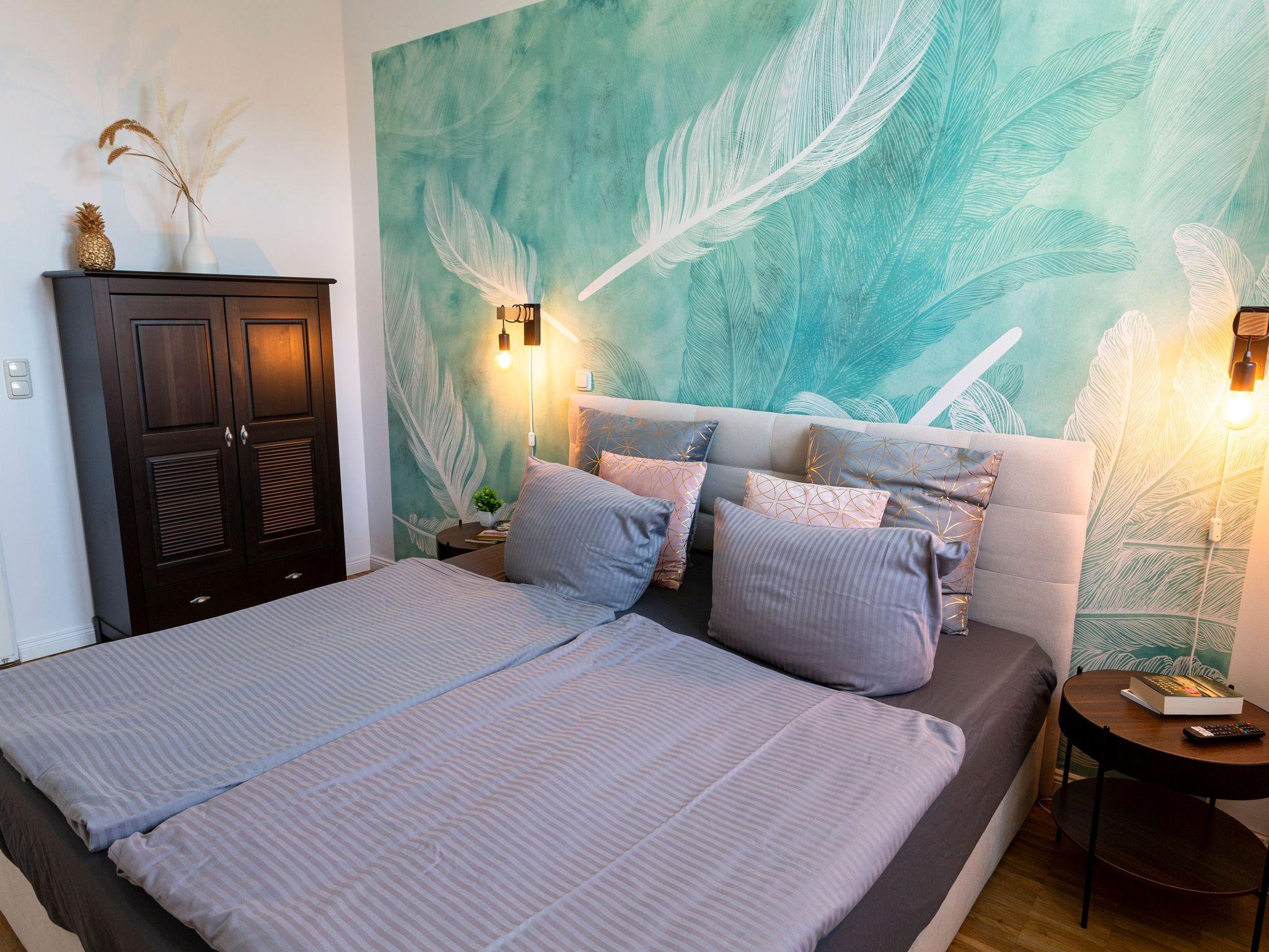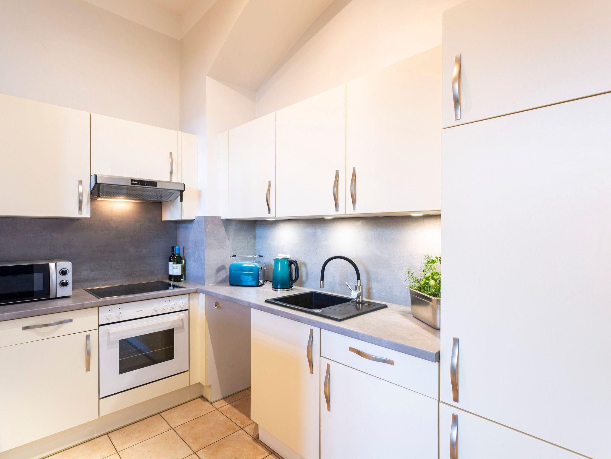 Das Altstadt-Studio 5 erreichen sie direkt über den Eingang am Neuen Markt und ist für bis zu 4 Personen geeignet. Die 56 m² große Ferienwohnung befindet sich im Erdgeschoss des Hauses und ist über eine Treppe zugänglich. Vom geräumigen Flur aus, gelangen die in das Schlafzimmer mit Doppelbett (180x200), das Bad mit Dusche, Waschbecken und WC, das Gäste-WC und das große Wohnzimmer mit offener Küche. Die Küche ist mit einem Kühlschrank, Herd, Backofen und Geschirrspüler ausgestattet. Küchenhelfer, wie Wasserkocher, Toaster und Kaffeemaschine sind ebenfalls vorhanden. Des Weiteren befinden sich ebenfalls ein Tresen und Esstisch direkt an der Küche. Auf dem Schlafsofa (140x200) können sie bequem Fernsehen oder entspannen. Das Wohnzimmer und Schlafzimmer sind zum Neuen Markt ausgerichtet und lassen viel Licht in die hellen Zimmer.