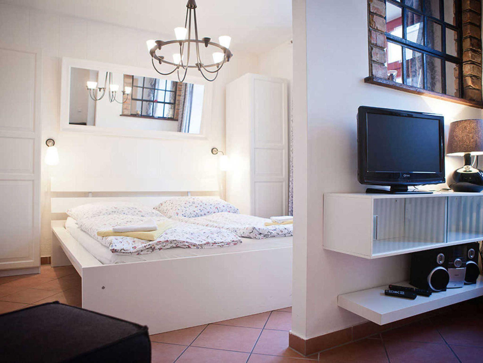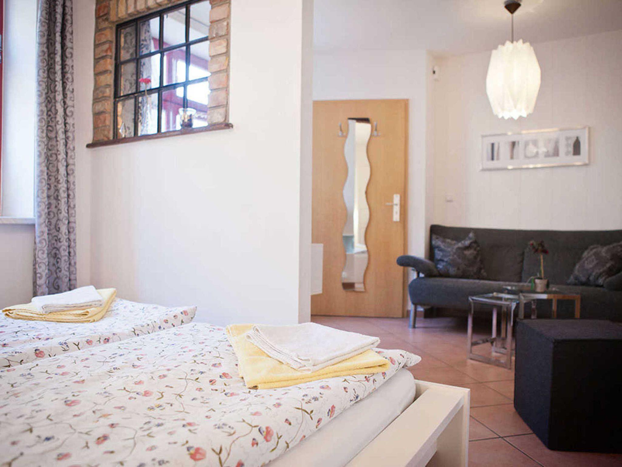 Die kleine Ferienwohnung verfügt über einen kombinierten Wohn-/ Schlafraum mit kleiner Couch und offener Küche.