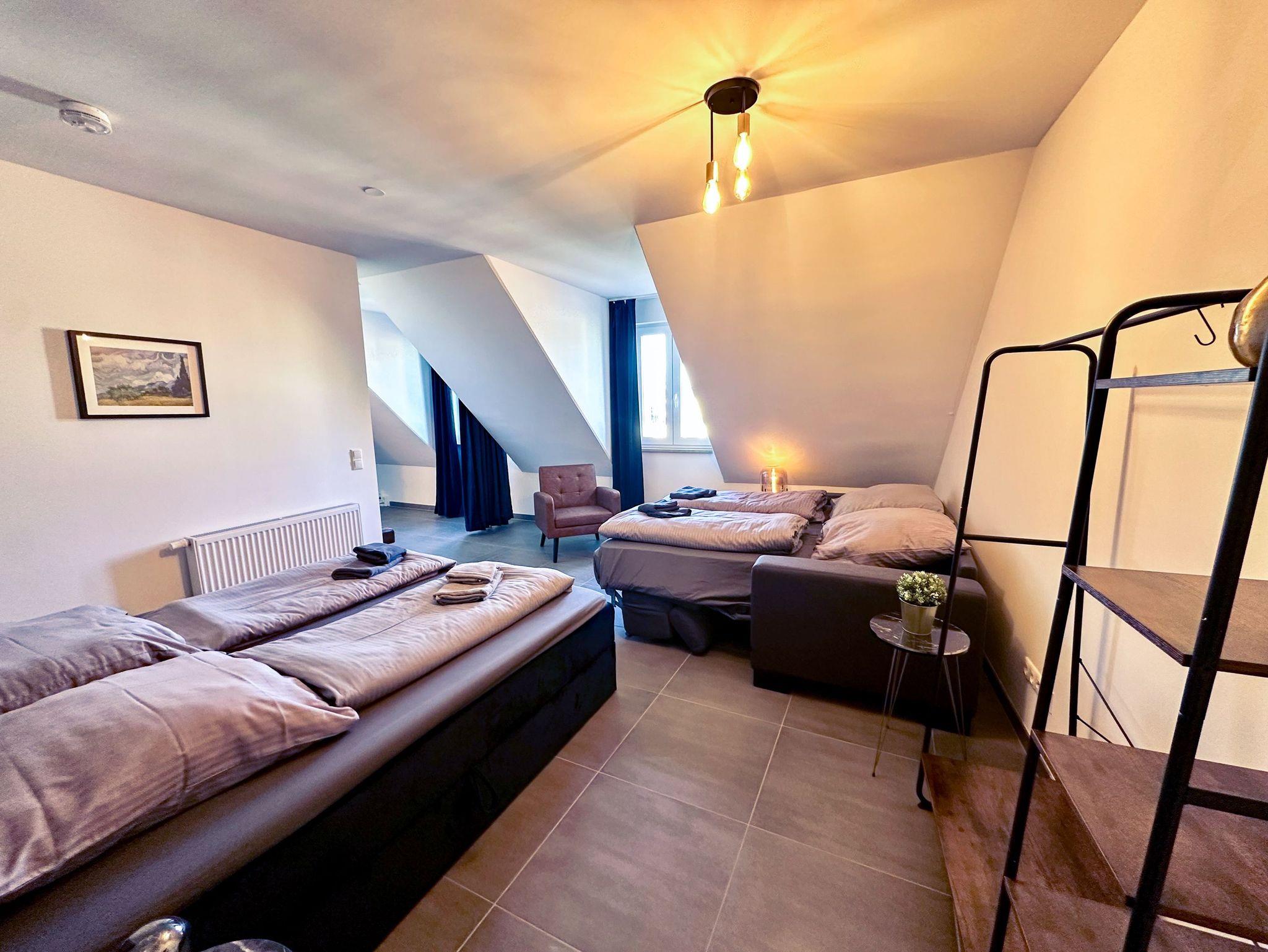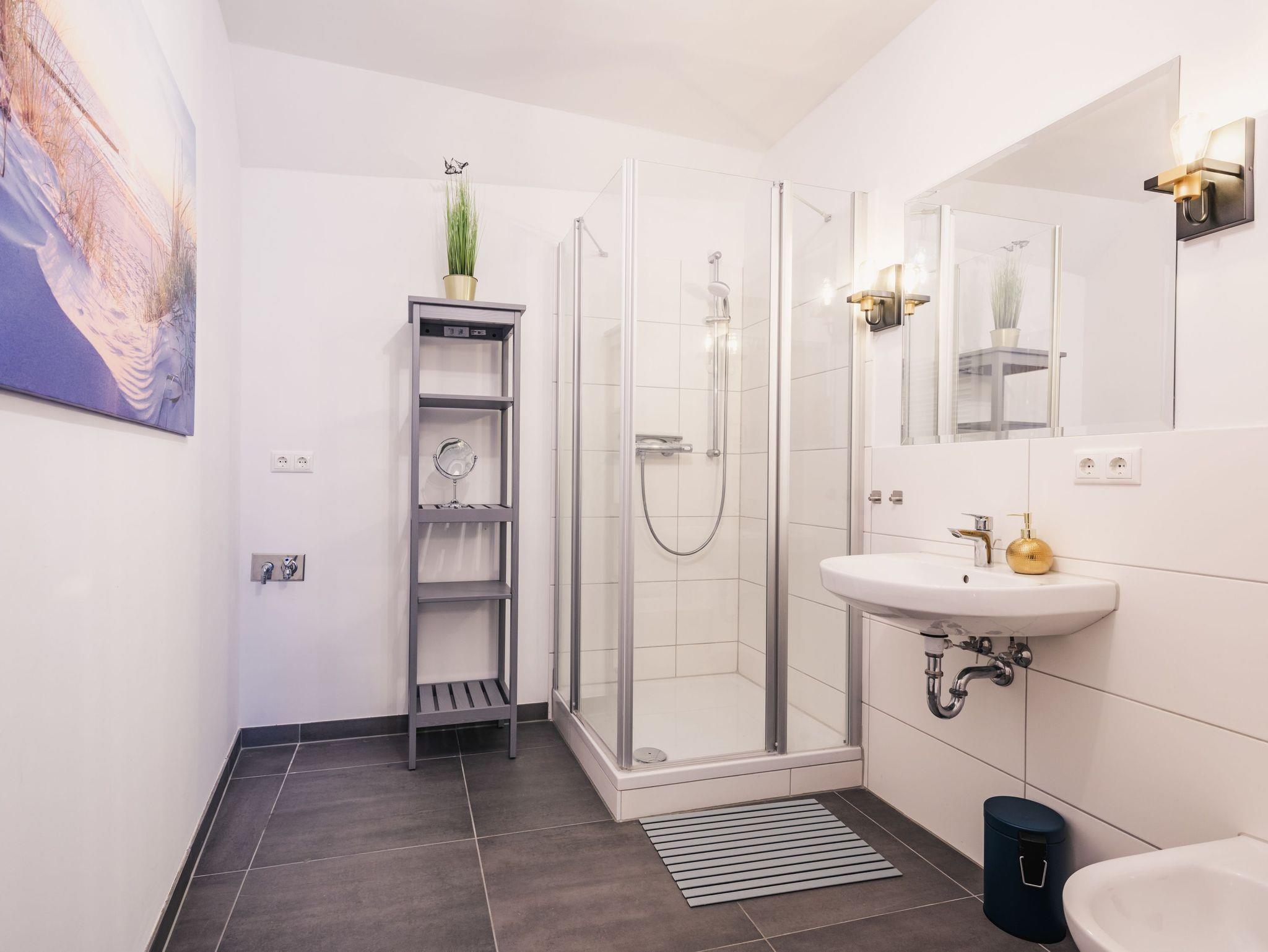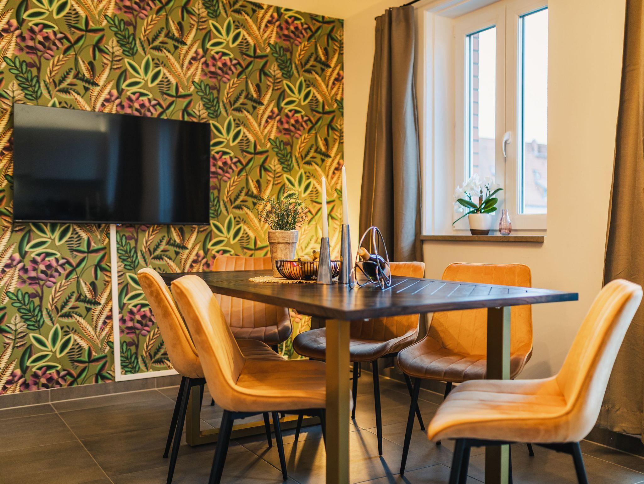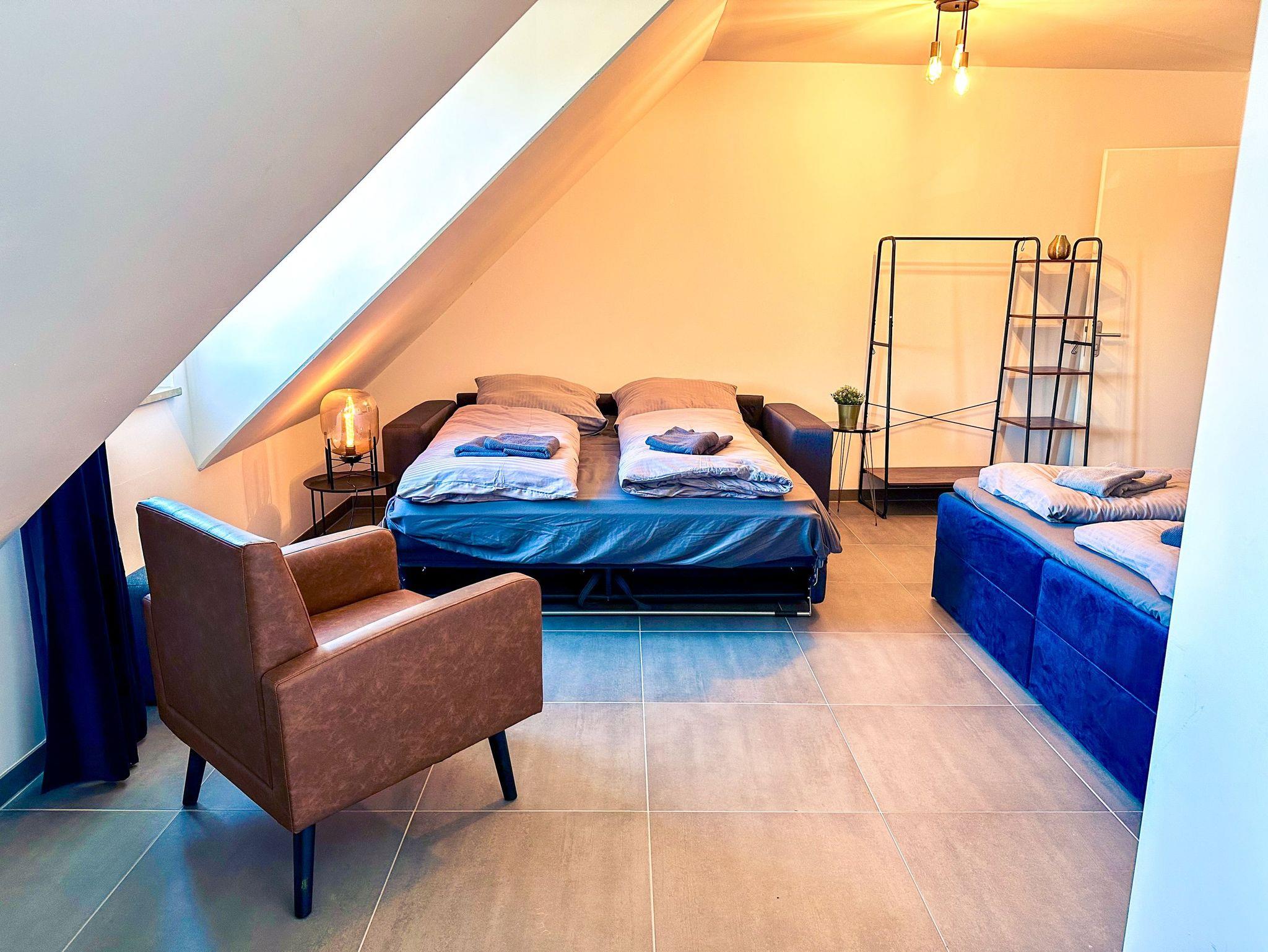 Das Altstadt-Studio 8 erstreckt sich über zwei Etagen, die durch einen privaten Hausflur verbunden sind und bietet mit 100 m² viel Platz für bis zu 8 Personen. Zwei Schlafzimmer mit bequemen Doppelbetten und zwei moderne Bäder mit Dusche sorgen für zusätzlichen Komfort. Der Wohnbereich mit offener Küche lädt zu gemeinsamen Mahlzeiten oder entspannten Abenden ein.