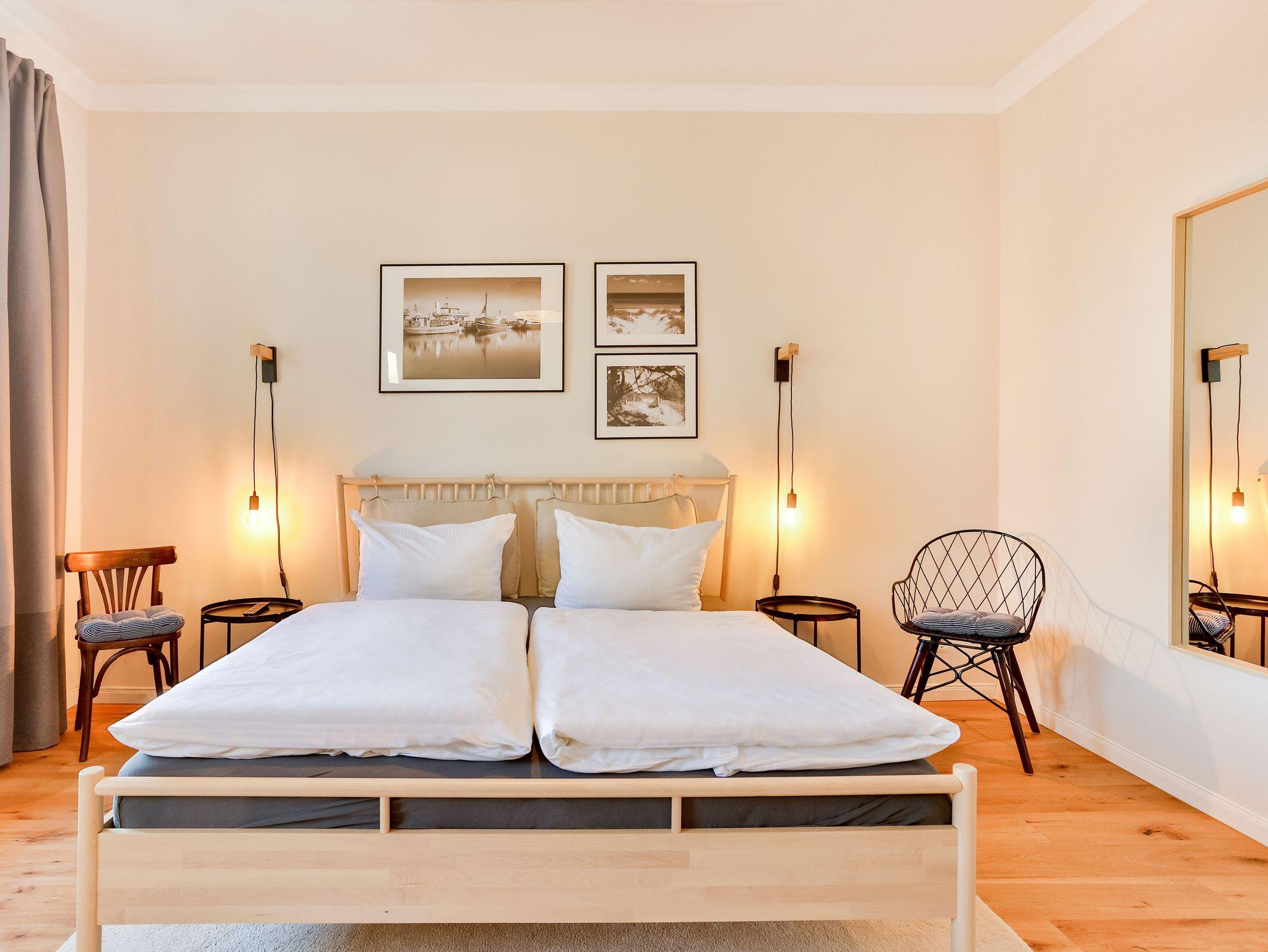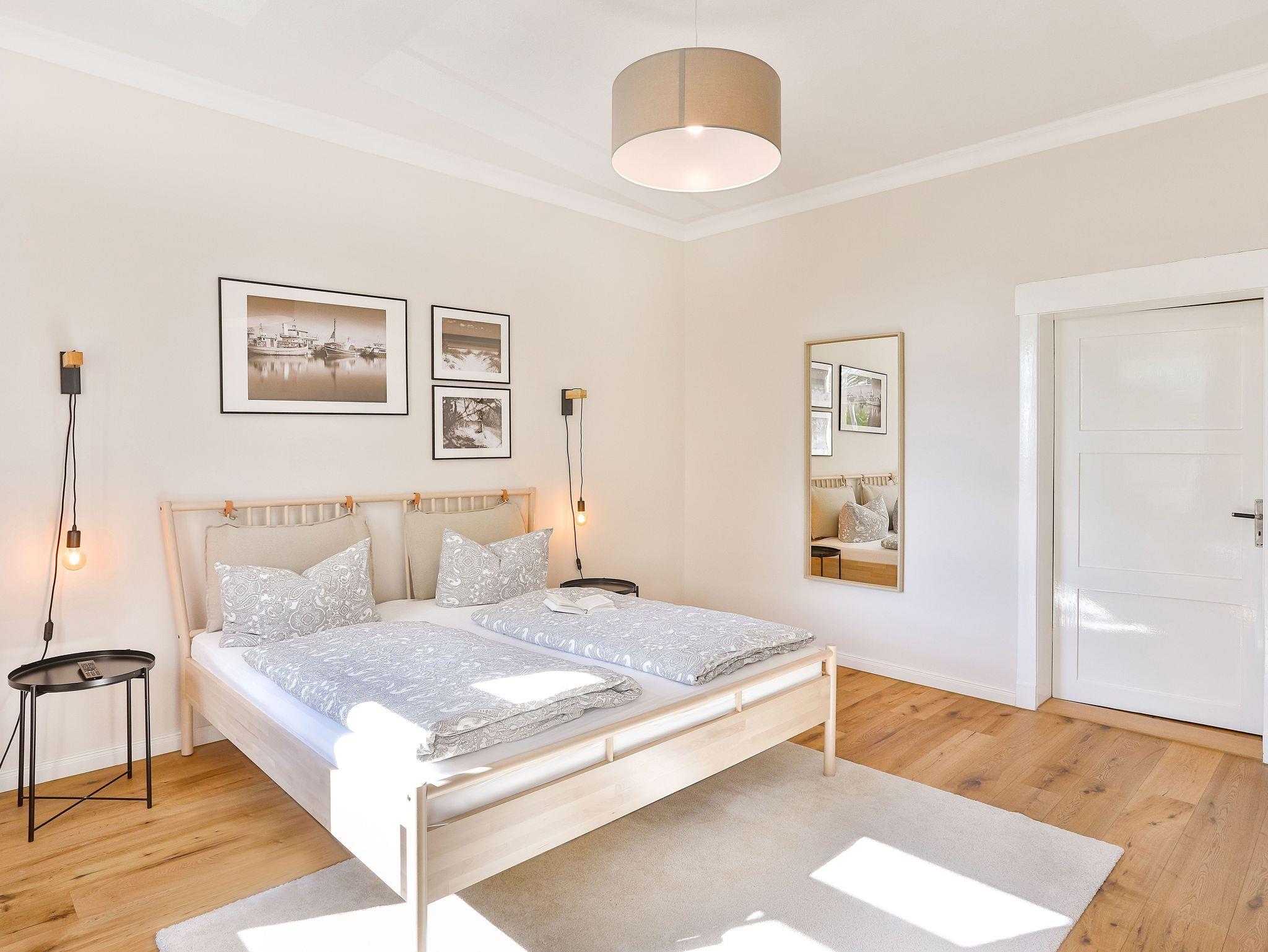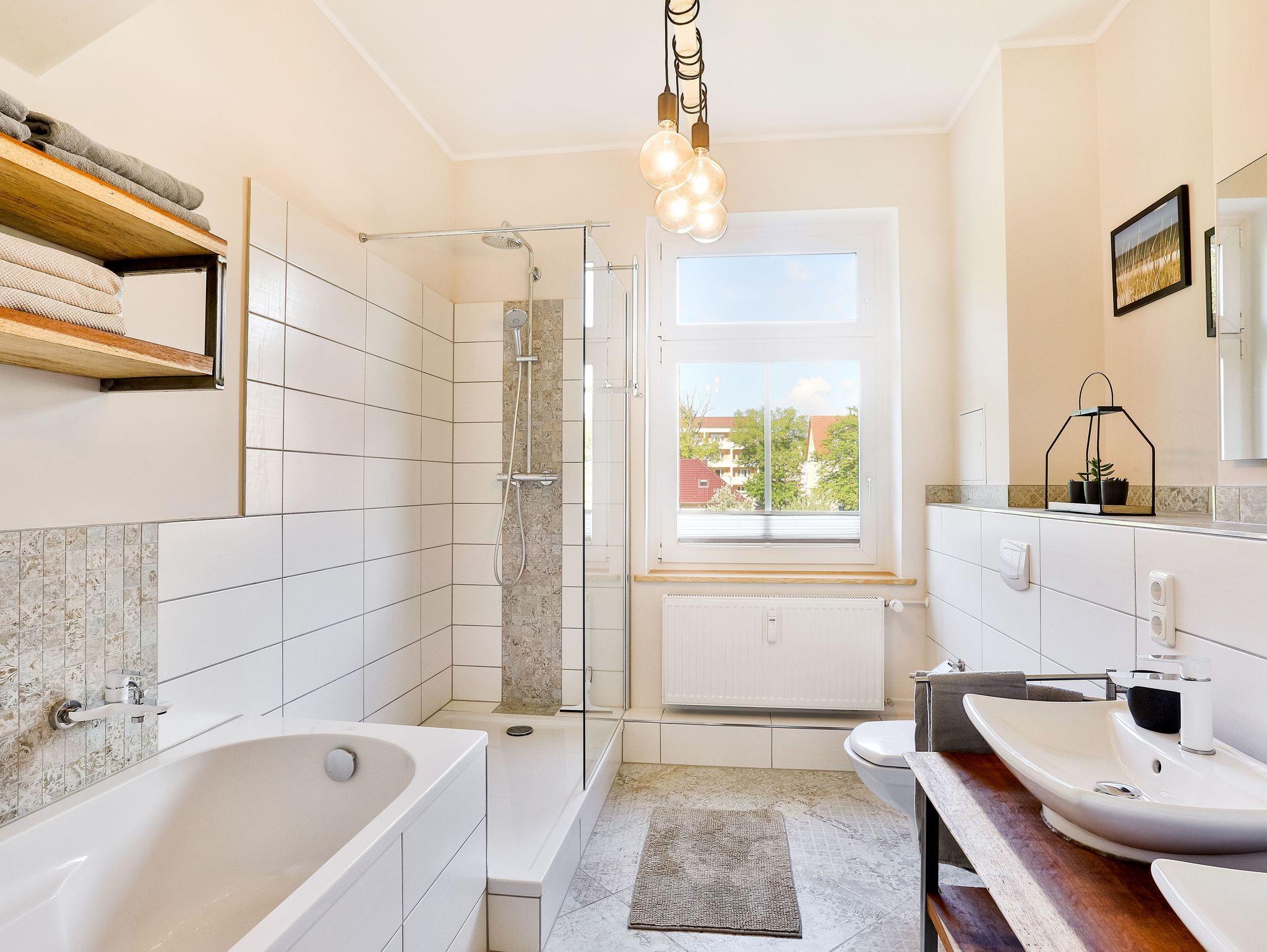 Einkaufsmöglichkeiten (Supermarkt) und Bushaltestelle sind 2 Gehminuten entfernt. Bis in das Zentrum (Markt) benötigt man 5 Gehminuten. Die Wohnung liegt im 1.OG eines komplett sanierten Apartmenthauses und besteht aus einem großen Wohnbereich mit offener Küche und Essbereich, drei Schlafräumen mit Doppelbetten und einem Bad/Dusche mit Badewanne sowie einem Bad mit Toilette und Waschbecken.