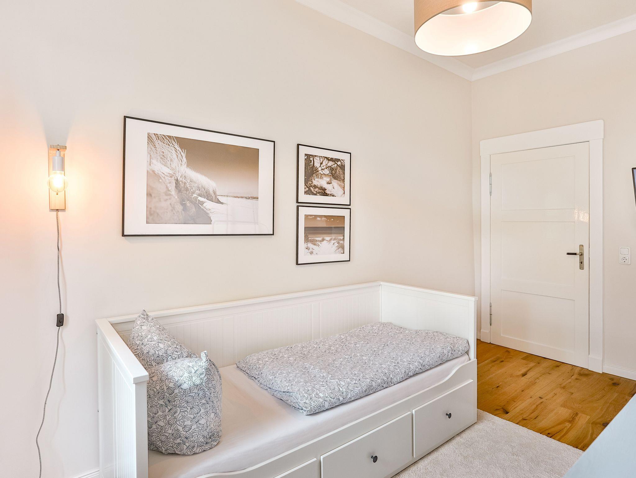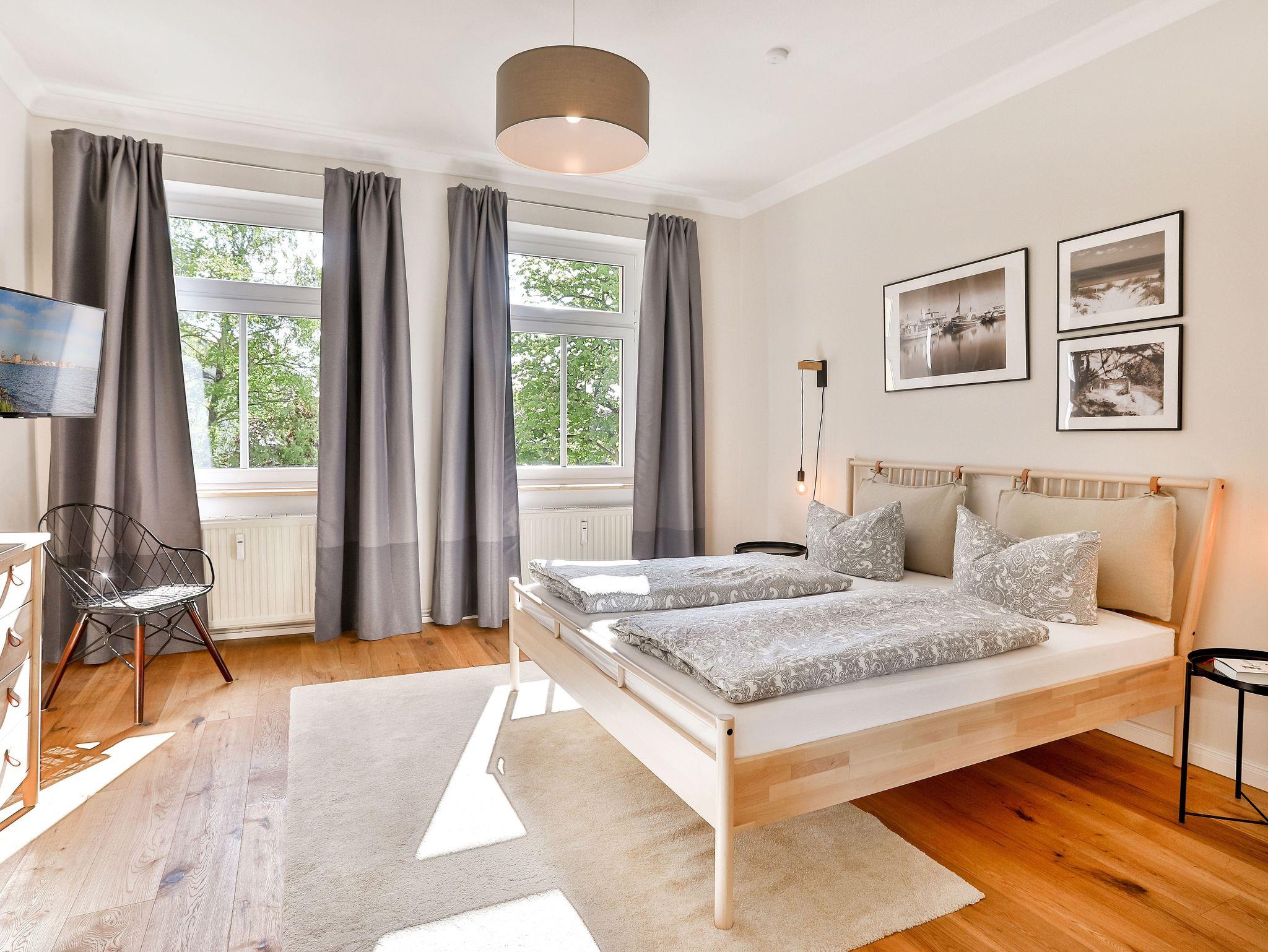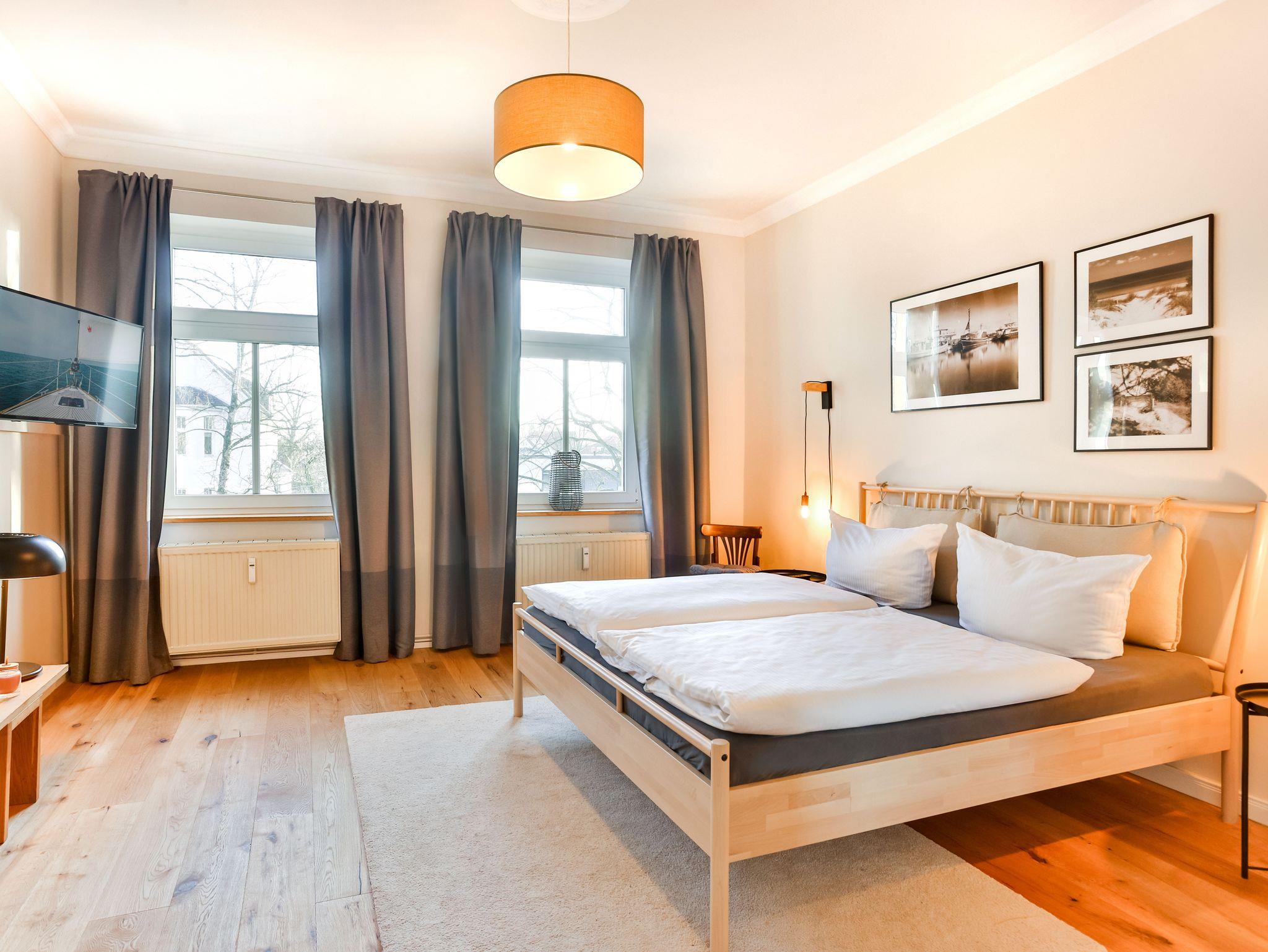 Einkaufsmöglichkeiten (Supermarkt) und Bushaltestelle sind 2 Gehminuten entfernt. Bis in das Zentrum (Markt) benötigt man 5 Gehminuten. Die Wohnung liegt im 1.OG eines komplett sanierten Apartmenthauses und besteht aus einem großen Wohnbereich mit offener Küche und Essbereich, drei Schlafräumen mit Doppelbetten und einem Bad/Dusche mit Badewanne sowie einem Bad mit Toilette und Waschbecken.