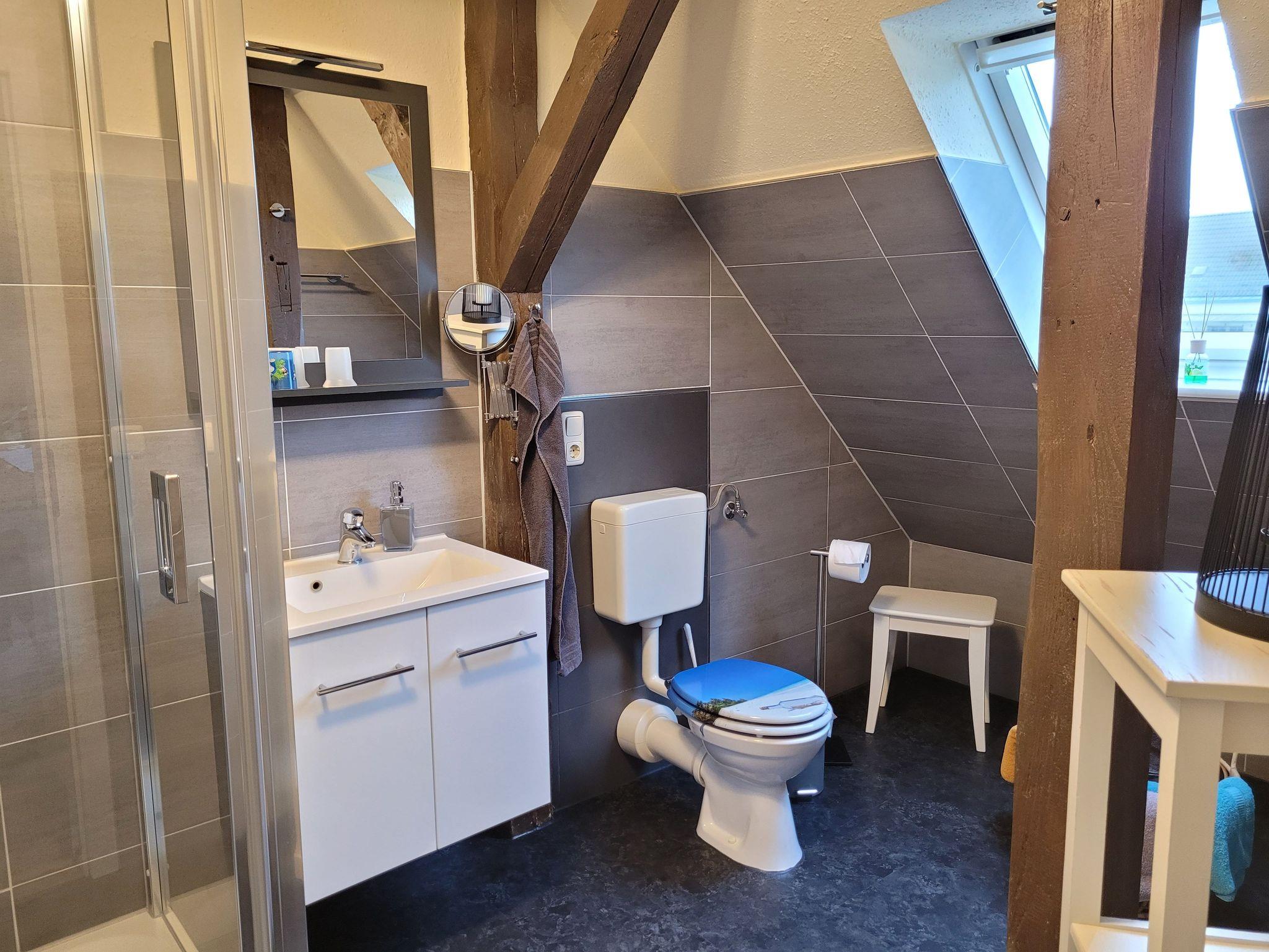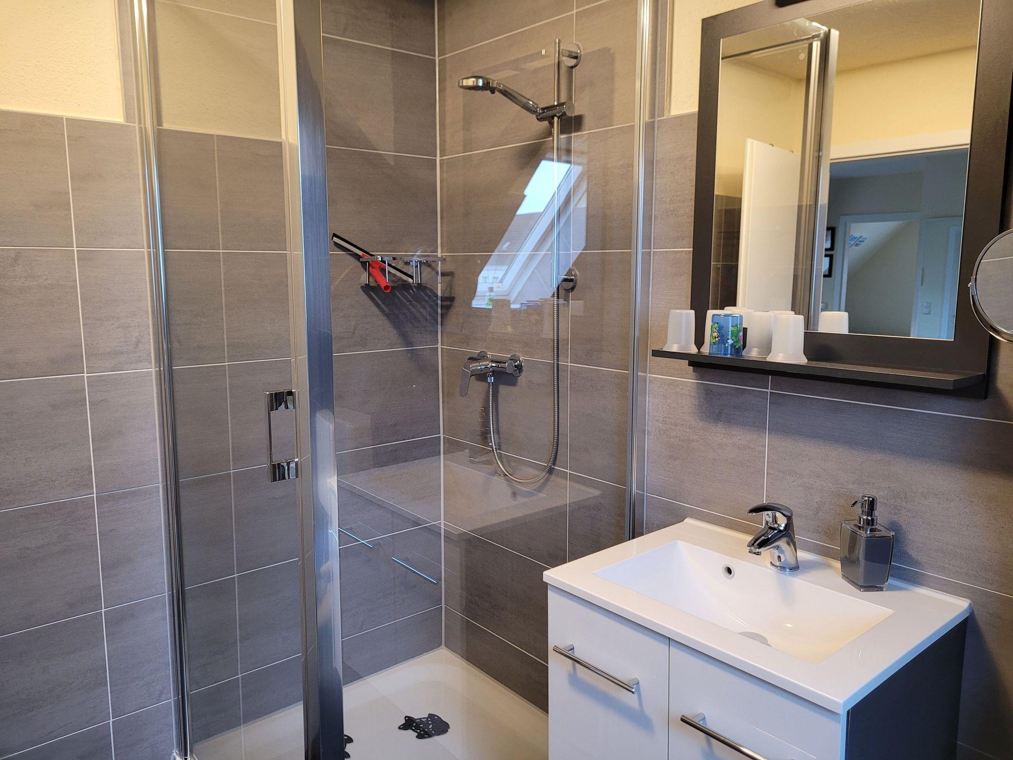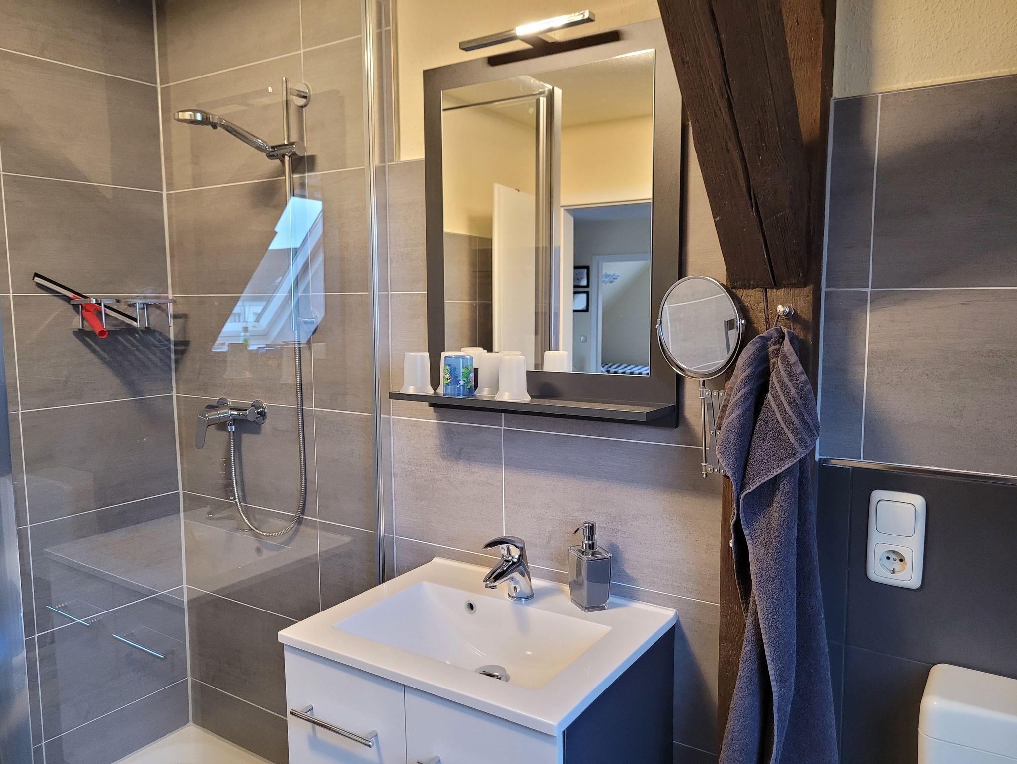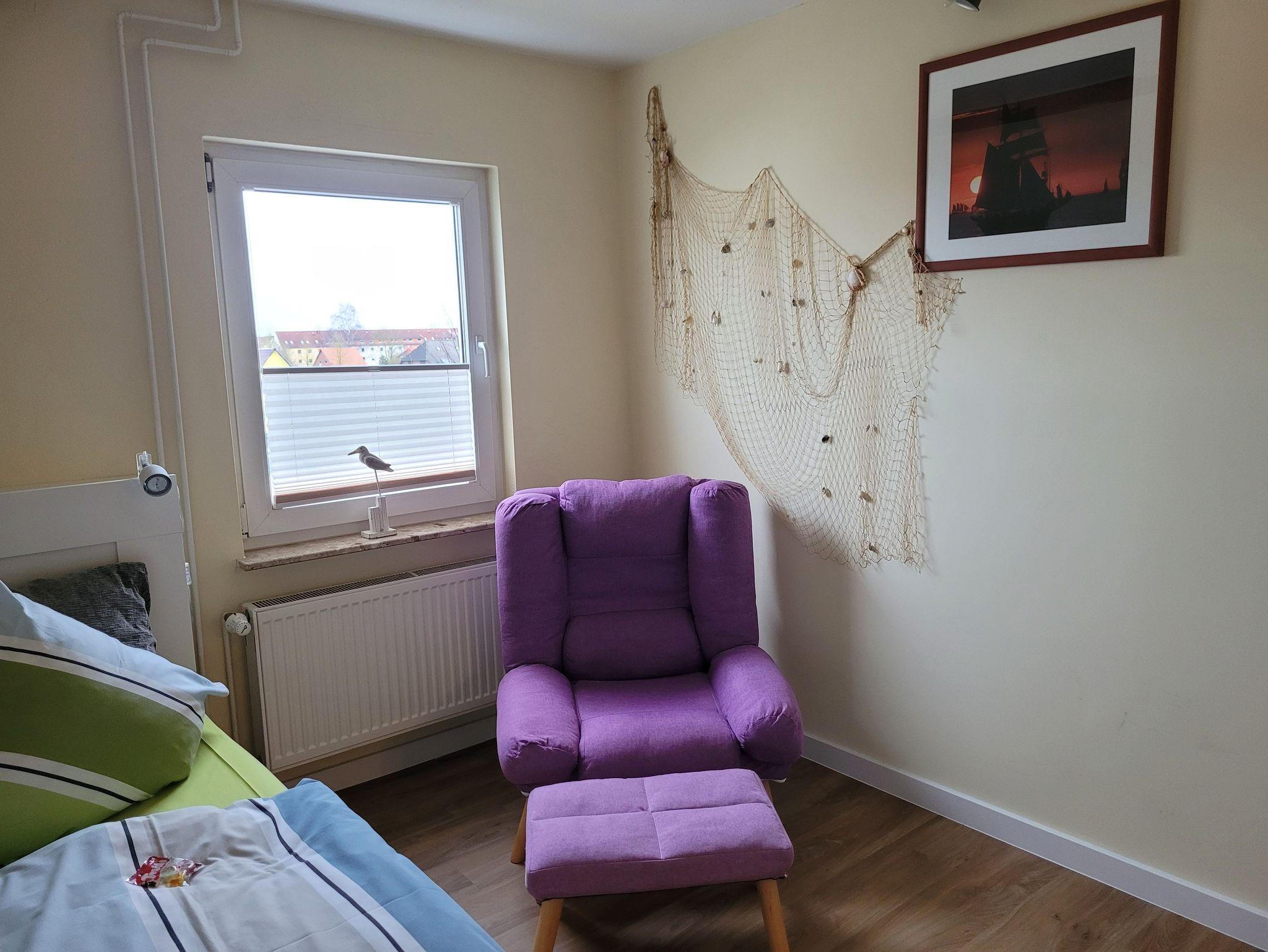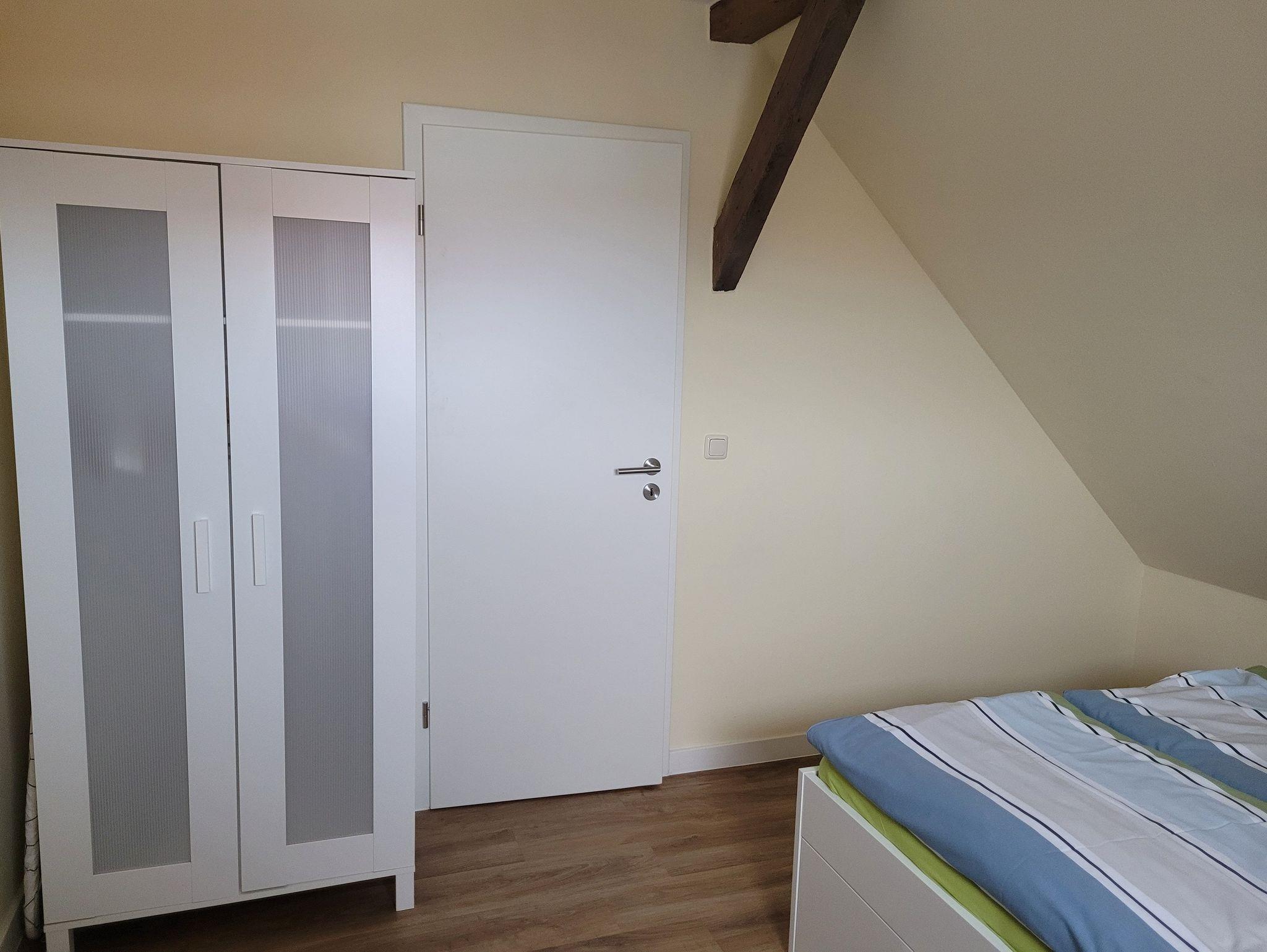Unsere Ferienwohnung ist 56 qm groß und liegt im Dachgeschoss unseres Hauses. Sie verfügt über einen kombinierten Wohn-/Schlafraum (ausziehbare Couch für 2 Personen) mit Smart-TV, Internet, ein Schlafzimmer mit Doppelbett (1,40 Meter Breite), ein Schlafzimmer mit zwei Einzelbetten, einer offenen Küche mit alltäglichen elektrischen Geräten und einem großen Esstisch, einem Badezimmer mit Dusche und WC. Auf dem Hof besteht die Möglichkeit zu grillen. Dort ist eine gemütliche Chill-Ecke vorhanden.
