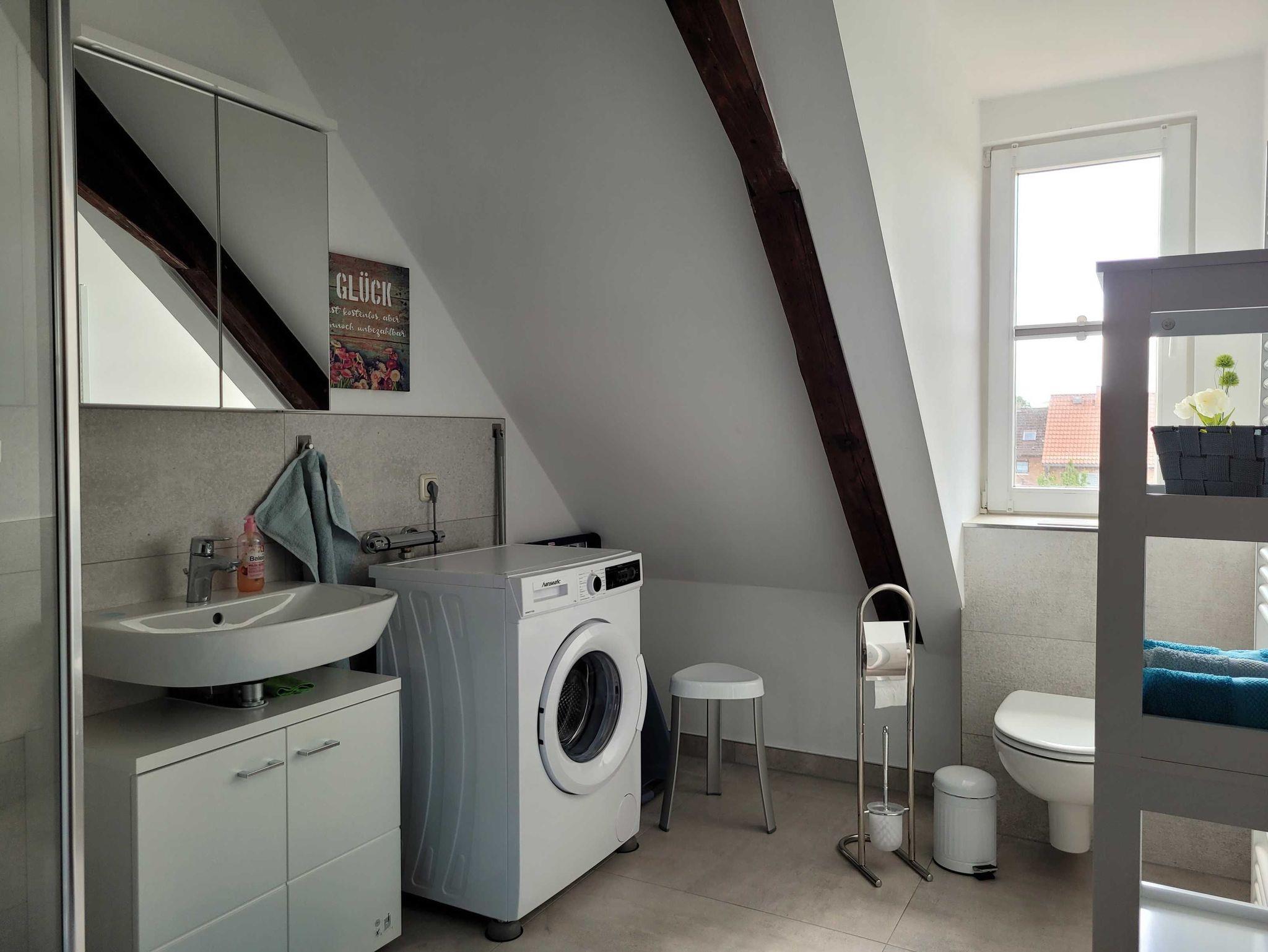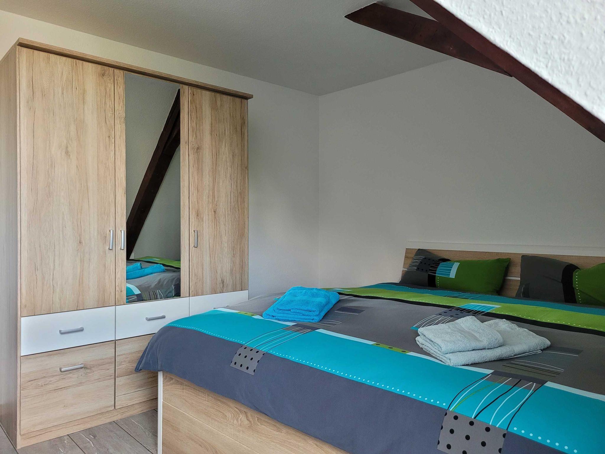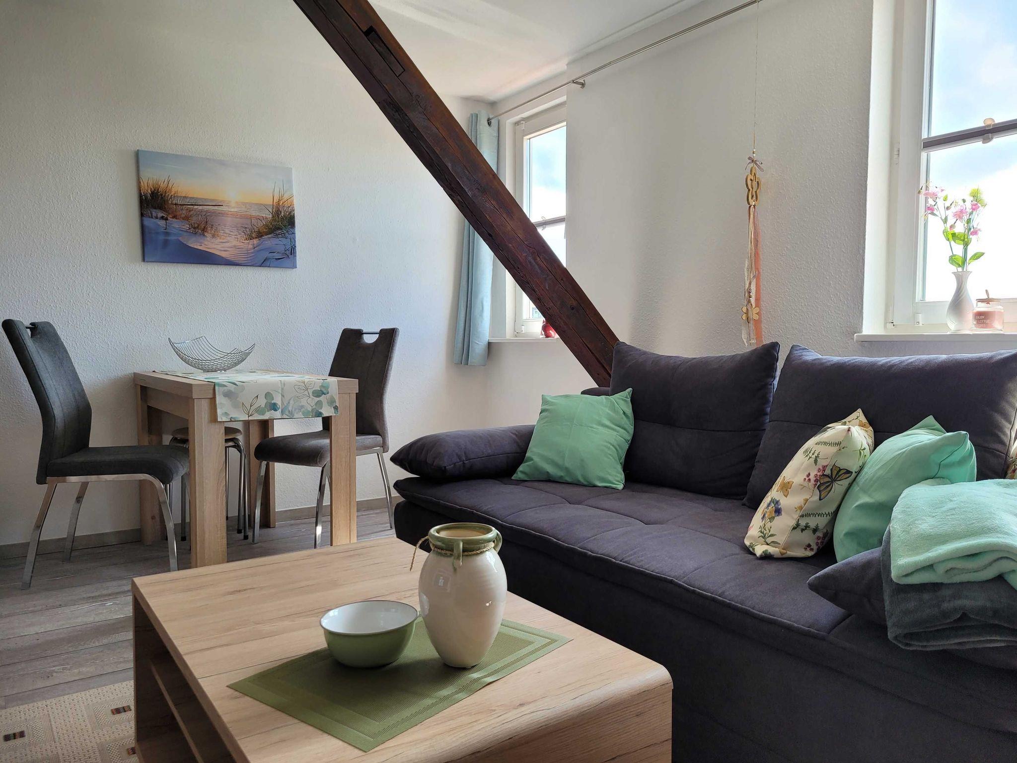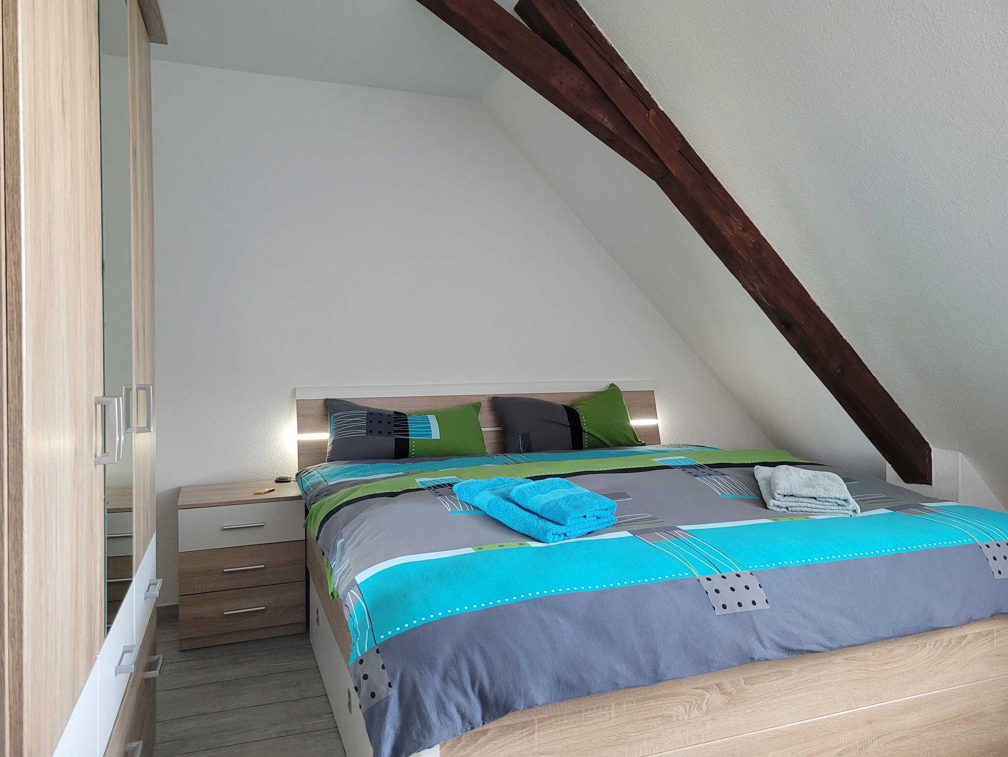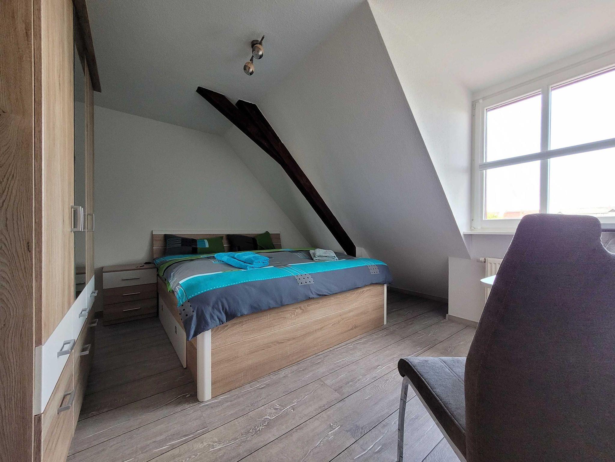 Die 40 qm große Dachgeschoss-Ferienwohnung befindet sich im 2. Obergeschoss eines Reihenhauses. Sie verfügt über eine voll ausgestattete Küche (z.B. Geschirrspüler, Mikrowelle, Herd), ein Bad mit Dusche/ WC sowie Waschmaschine und ein Schlafzimmer (Bett 1,80x2,00 mit getrennten Matratzen) mit großzügigem Kleiderschrank und Sitzgelegenheit. Das Wohnzimmer mit Blick zur Marienkirche und Schlafcouch (1,60x2,00) verfügt über eine Essgarnitur. Die Ferienwohnung ist für Paare und Familien mit bis zu einem Kind bis 16 Jahre geeignet.