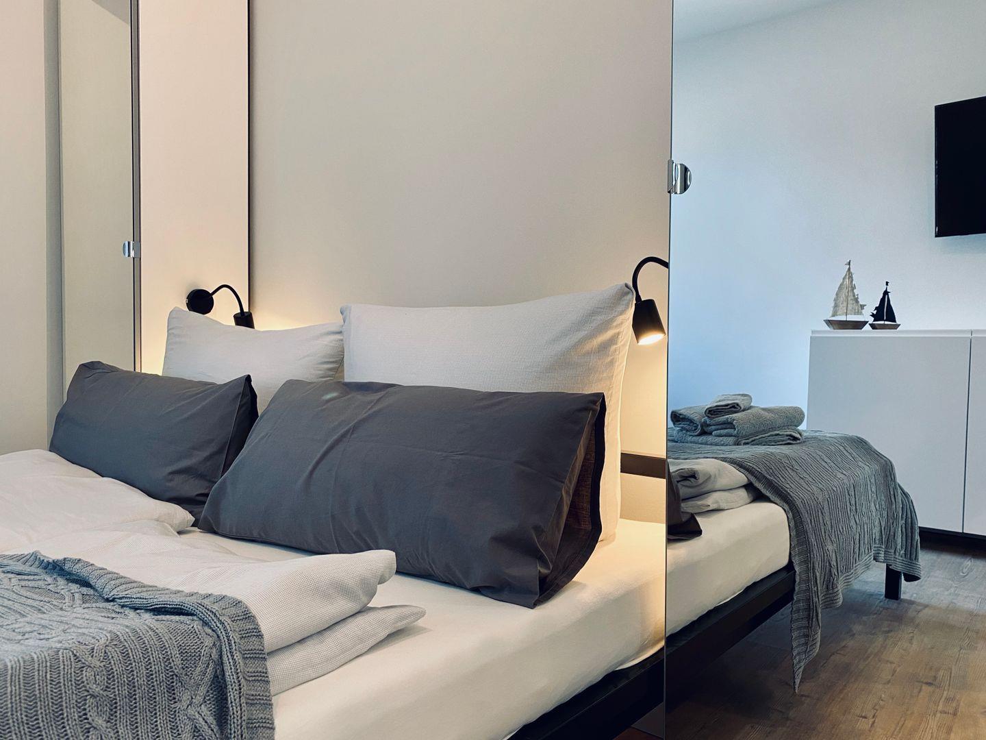 Das schicke Badezimmer verfügt neben ebenerdiger Regendusche, Waschtisch und WC über Föhn und Kosmetikspiegel. Im Wohn-/Schlafzimmer befinden sich zwei Kleiderschränke mit Kleiderstange und genügend Stauraum für das Gepäck von 2 Personen. Nachttischlampen und ein großer TV sind im Wohn-/Schlafzimmer neben einem komfortablen Doppelbett vorhanden. Bücher, kostenfreies Internet, ein großer Flachbild-TV, Sofadecke und tolle Dekoration sorgen für einen angenehmen Aufenthalt. Die Küche besticht mit einer sehr guten Ausstattung. Neben Nespresso-Kapselmaschine, Backofen, Geschirrspüler, 4-Feld-Induktionskochfeld, Kühlschrank mit Gefrierfach sind auch weitere Kleingeräte wie Wasserkocher, Toaster und Kaffeefiltermaschine vorhanden. Für einen tollen Kochabend oder ein entspanntes Frühstück vor einem schönen Tagesausflug ist alles vorhanden.