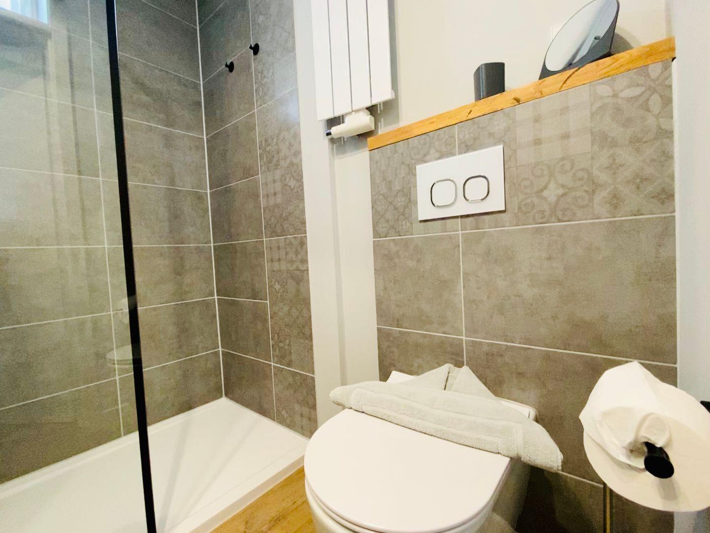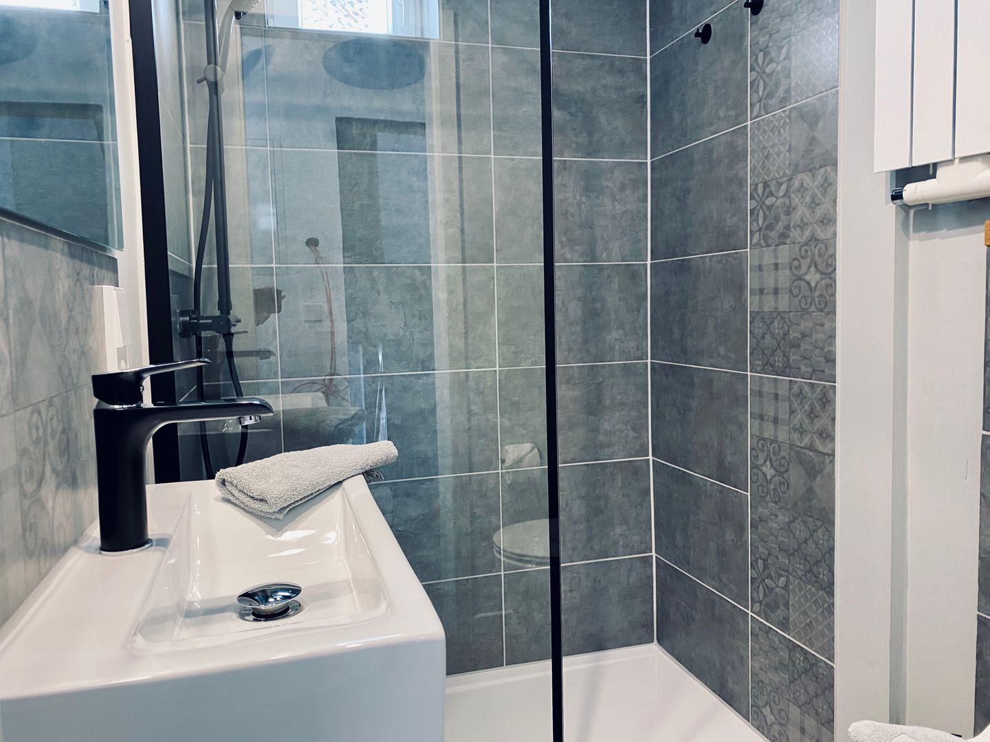 Das schicke Badezimmer verfügt neben ebenerdiger Regendusche, Waschtisch und WC über Föhn und Kosmetikspiegel. Im Wohn-/Schlafzimmer