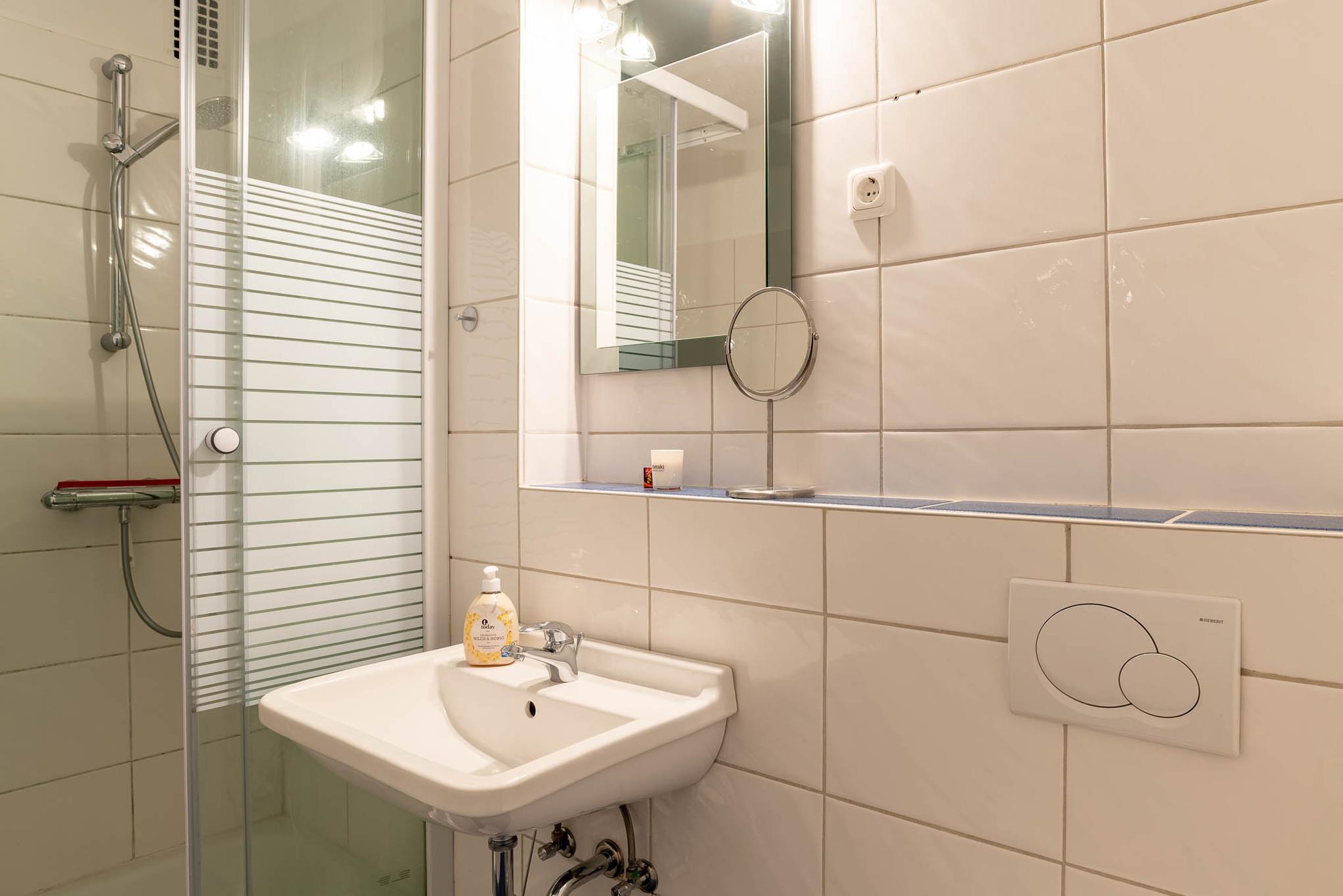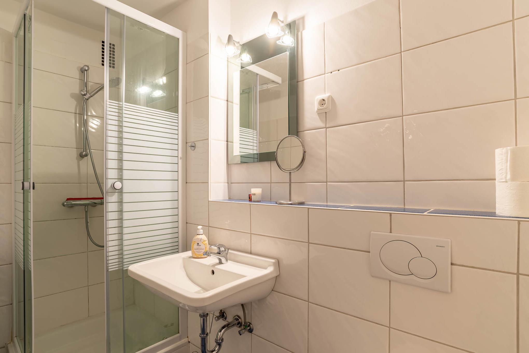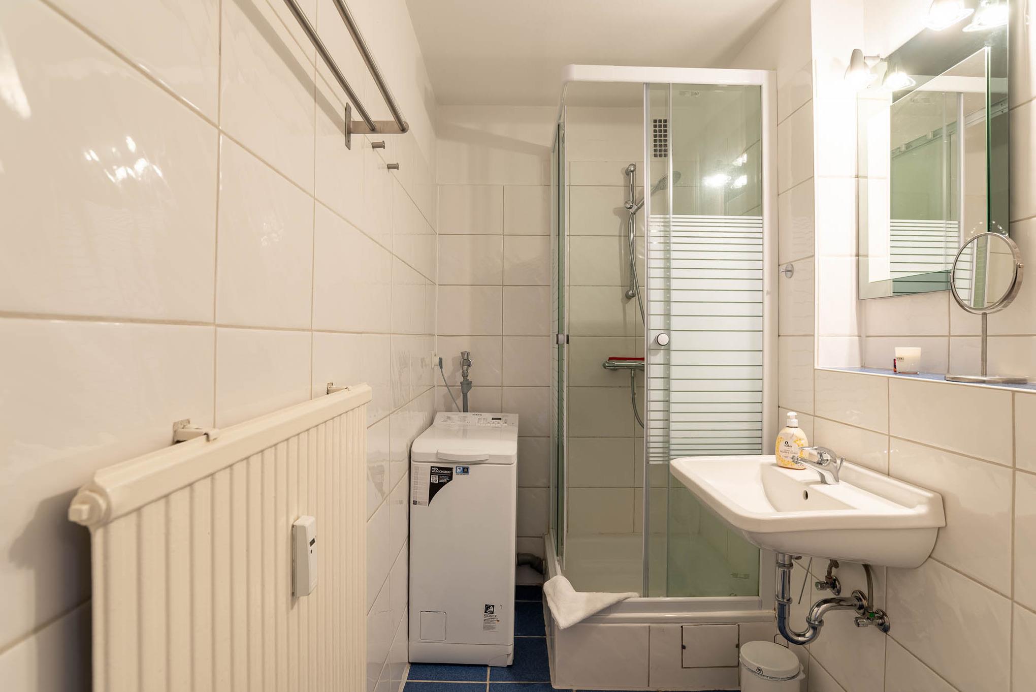 Das helle Badezimmer verfügt über eine Eckdusche, ein Waschbecken mit WC und einer kleinen Waschmaschine.