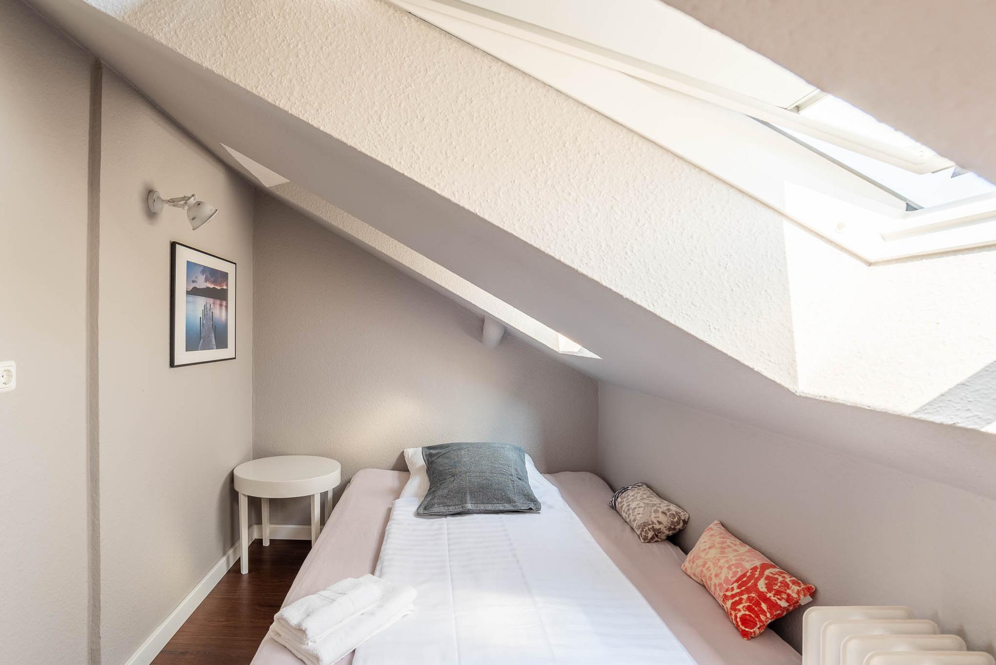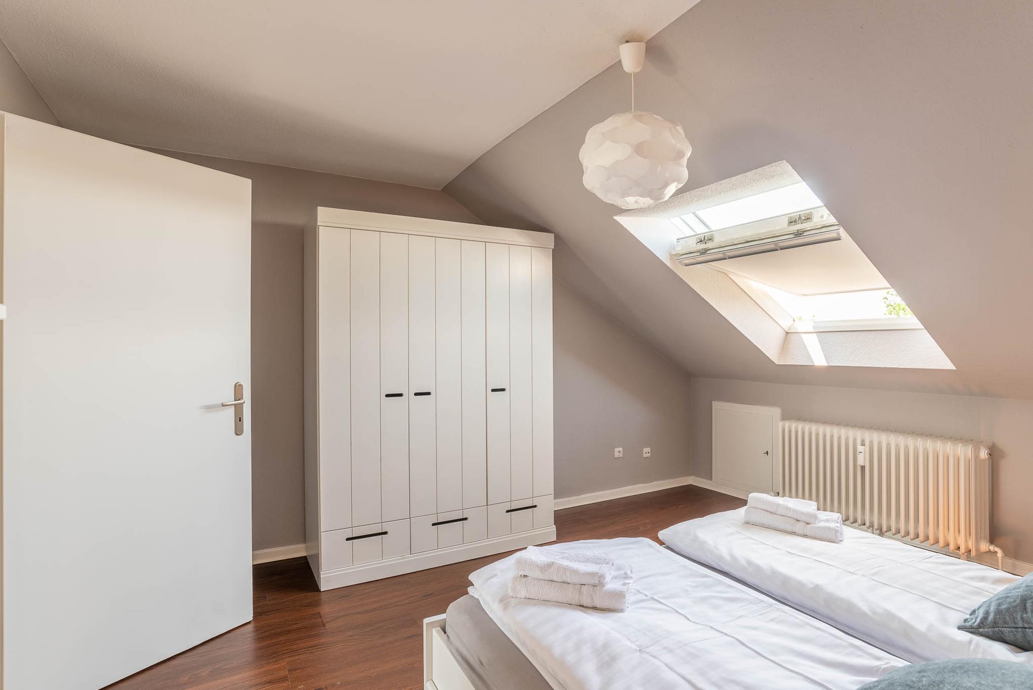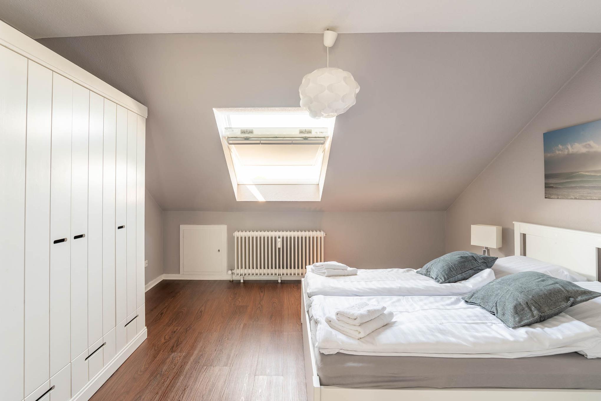 Für den erholsamen Schlaf stehen im oberen Geschoss zwei separate Schlafzimmer zur Verfügung. Sie gelangen über die Holztreppe im Wohnzimmer ins obere Stockwerk. Das größere Schlafzimmer wirkt durch die weißen Möbel hell und einladend. Nachtschränkchen, der Kleiderschrank sowie die Kommode runden die cleane Einrichtung ab. Das Veluxfenster in der Dachschräge lässt sich mit einer Jalousie abdunkeln. Neben dem Doppelbett mit den Maßen 160x200 cm, befindet sich im anderen Schlafzimmer ein weiteres Bett mit der Größe 140x200 cm.