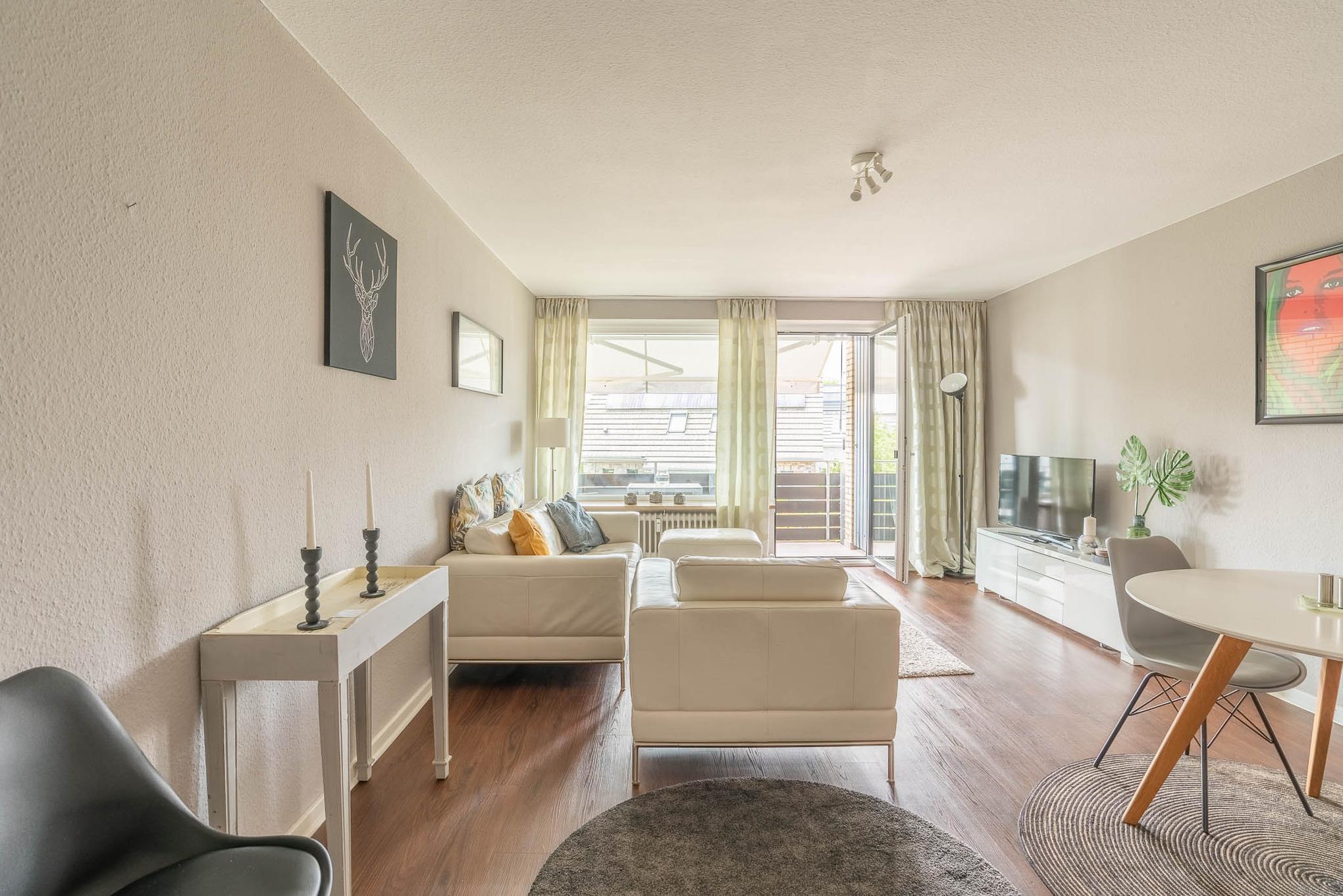 Das Wohnzimmer wirkt durch die bodentiefe Fenster und dem angrenzenden Balkon sehr hell und freundlich. Zwei Couchelemente und ein großer Fernseher laden zum Verweilen ein. In der gesamten Wohnung steht Ihnen kostenloses WLAN zur Verfügung. Der Essbereich besteht aus einem runden Esstisch und vier Stühlen. Das Zimmer lässt dich mit Vorhängen abdunkeln.