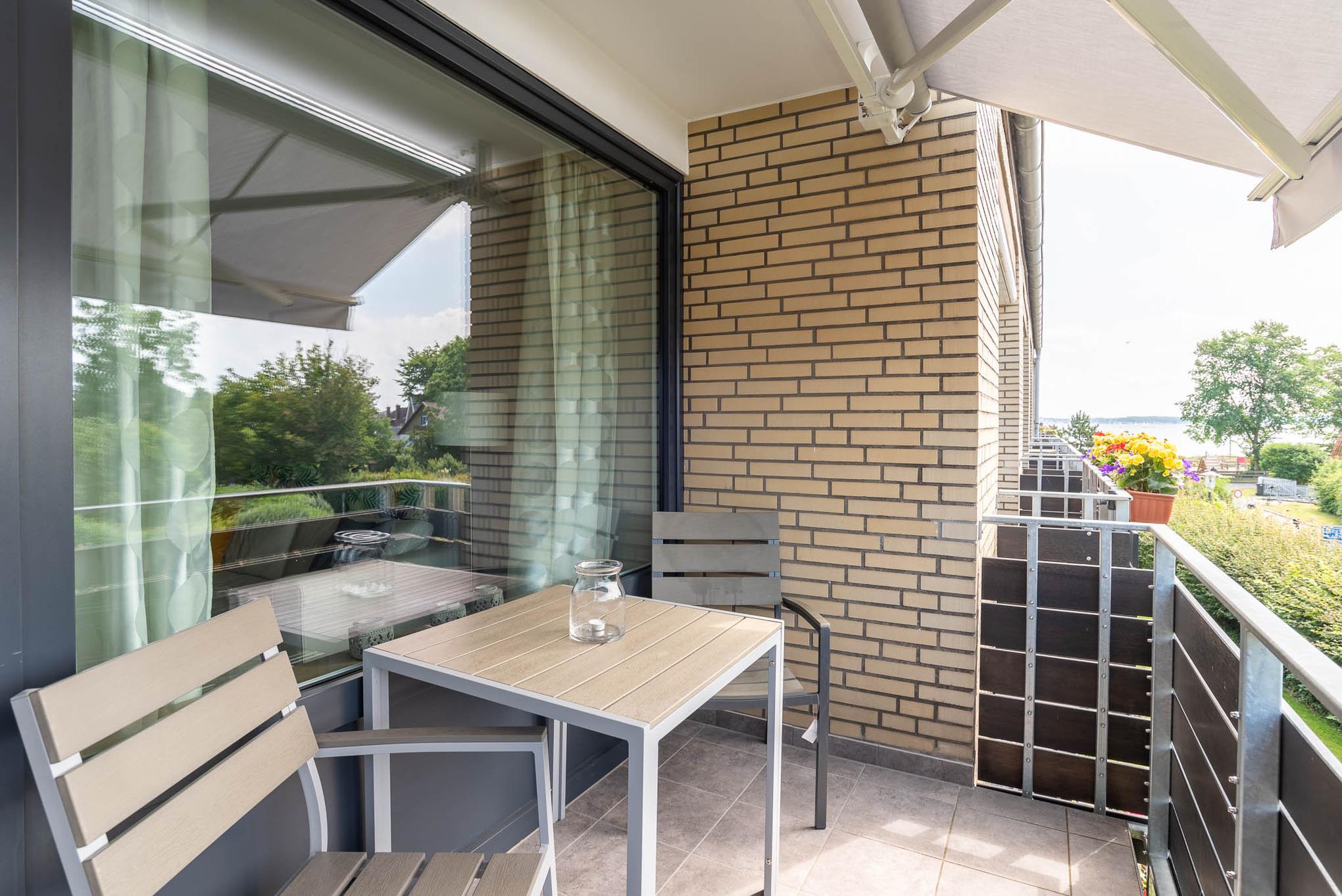 Treten Sie direkt aus dem Wohnzimmer auf den Südwest-Balkon und genießen Sie den traumhaften Ausblick. Denn von dort aus blicken Sie in Richtung Schilksee und auf die Kieler Förde. Auf dem Balkon stehen Balkonmöbel und eine ausfahrbare Markise zur Verfügung.
