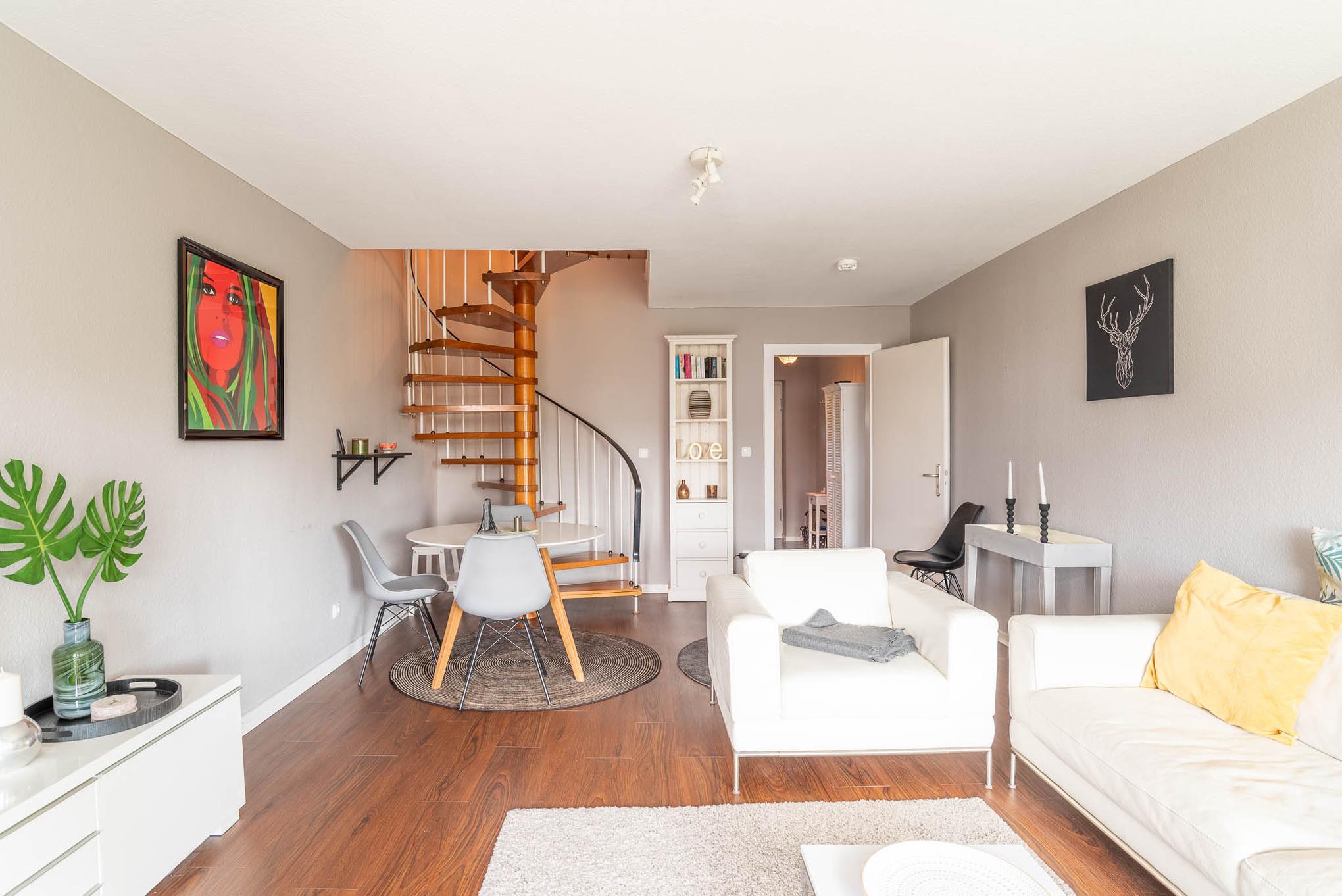 Im unteren Geschoß befindet sich vom geräumigen Flur abgehend zum einen der geschmackvoll eingerichtete Wohnbereich, zum anderen das Badezimmer, sowie die separate Küche. Die kleine Küche verfügt über ein Fenster und ist vollständig ausgestattet mit einem Kühlschrank (inklusive Gefrierfach), Cerankochfeld mit Backofen, einem Geschirrspüler und einer Mikrowelle. Neben einer Kaffeemaschine und einem Toaster, steht für Sie auch ein Wasserkocher für den alltäglichen Gebrauch.
