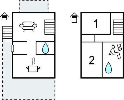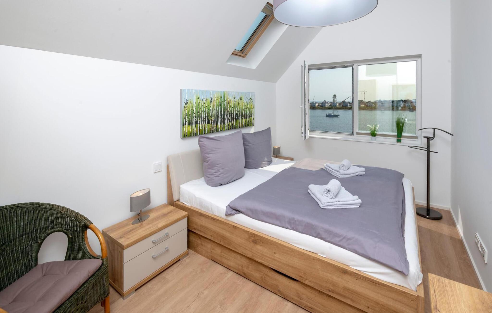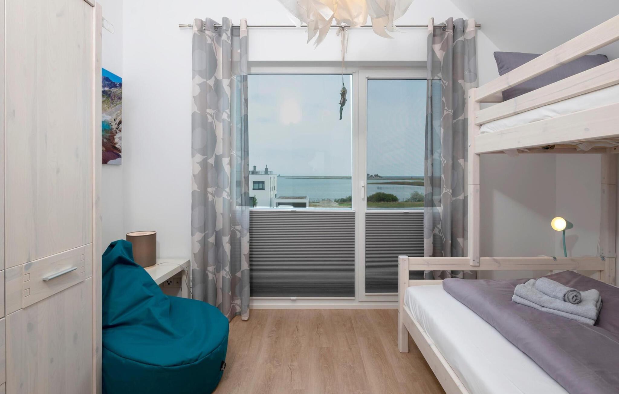 Ferieboligens afslapningsområde er på anden etage. Det store soveværelse har en fantastisk udsigt over havnen. Fald i søvn under stjernerne, et ovenlys giver jer ikke kun mulighed for at se stjernehimlen, men også de drømmeagtige skyformationer, der er så karakteristiske for norden. Yderligere tre sovepladser er tilgængelige i det andet soveværelse med udsigt over østersøfjorden Slien. Her indbyder en hyggelig, ekstra stor køjeseng (liggeområde under: 140 cm, liggeareal over: 90 cm) til at sove. Der er også et andet fjernsyn tilgængeligt her. Begge soveværelser er udstyret med mørklægningsgardiner.
