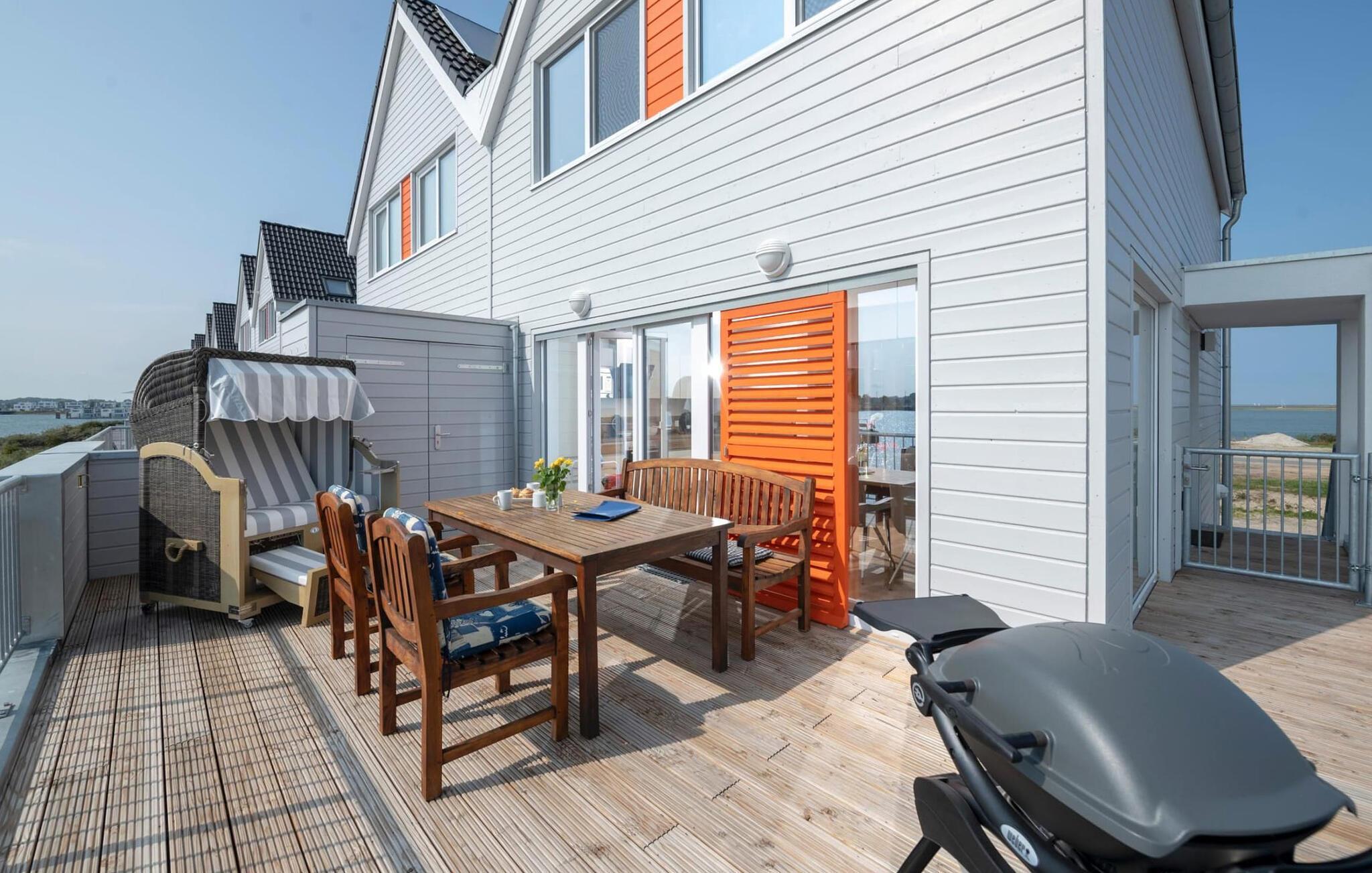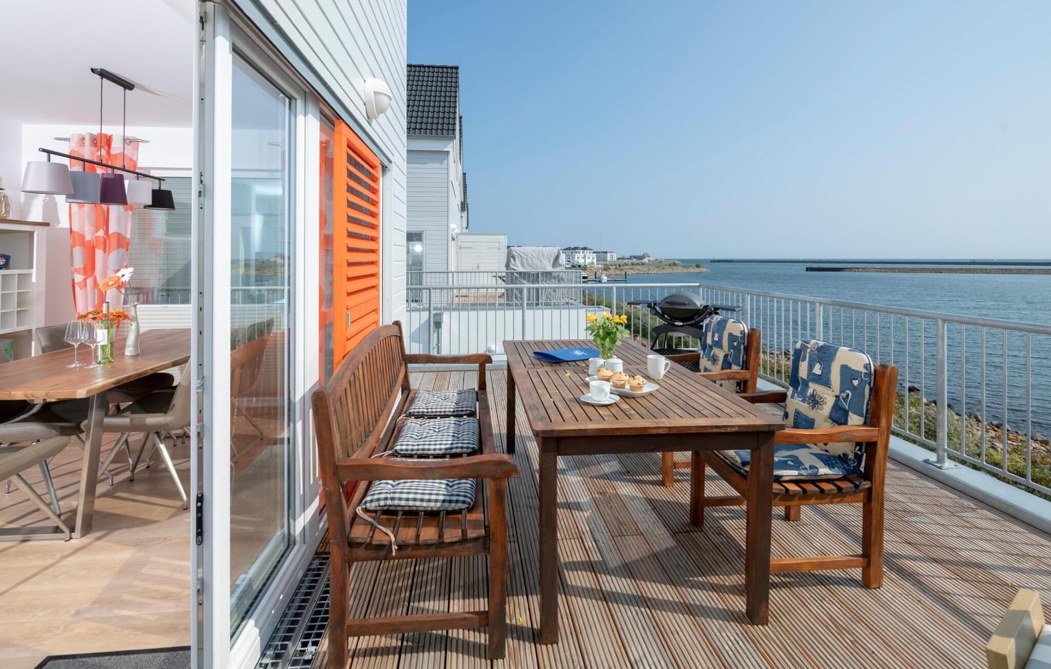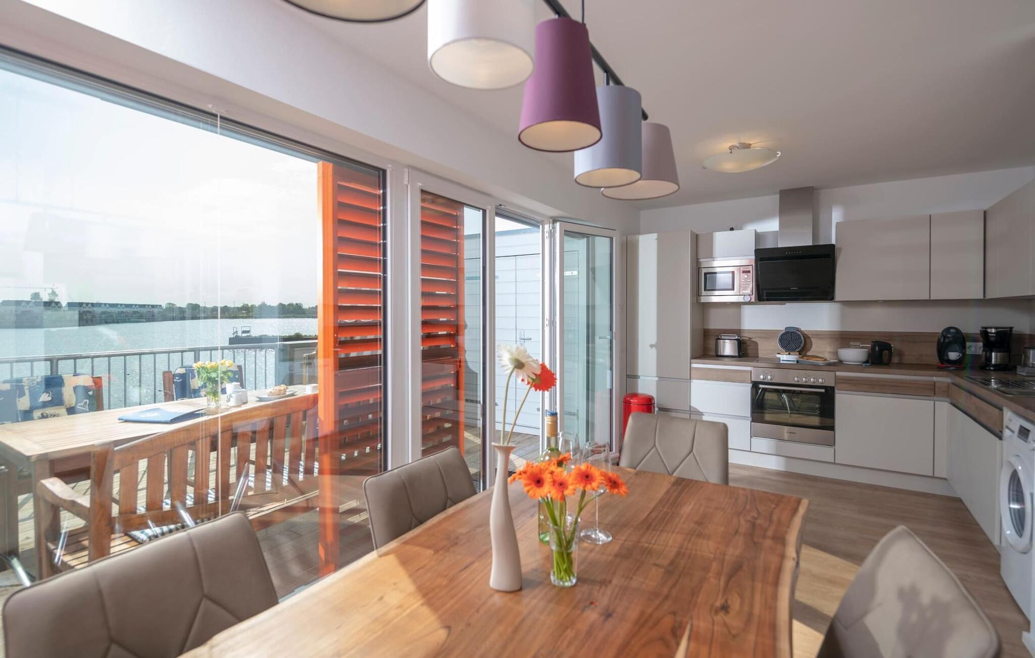 Sommerhusets opholds- og spisestue er oversvømmet med lys og har panoramavindue fra gulv til loft, der fører til de tilstødende terrasser på begge sider. En fantastisk udsigt åbner op på terrassen ved siden af ??spisepladsen med udsigt over sejler- og sportsbådhavnen i OstseeResort Olpenitz. Uanset om det er en romantisk middag i levende lys eller en hyggelig grillfest, er en havnebiograf og en fantastisk solrig udsigt garanteret. På ferien er der tid til kreativ madlavning, det fuldt udstyrede køkken-alrum lader intet tilbage at ønske. Udstyret ned til mindste detalje, fra det rummelige køleskab med BioFresh-rum til bagegrejet, er alt der.