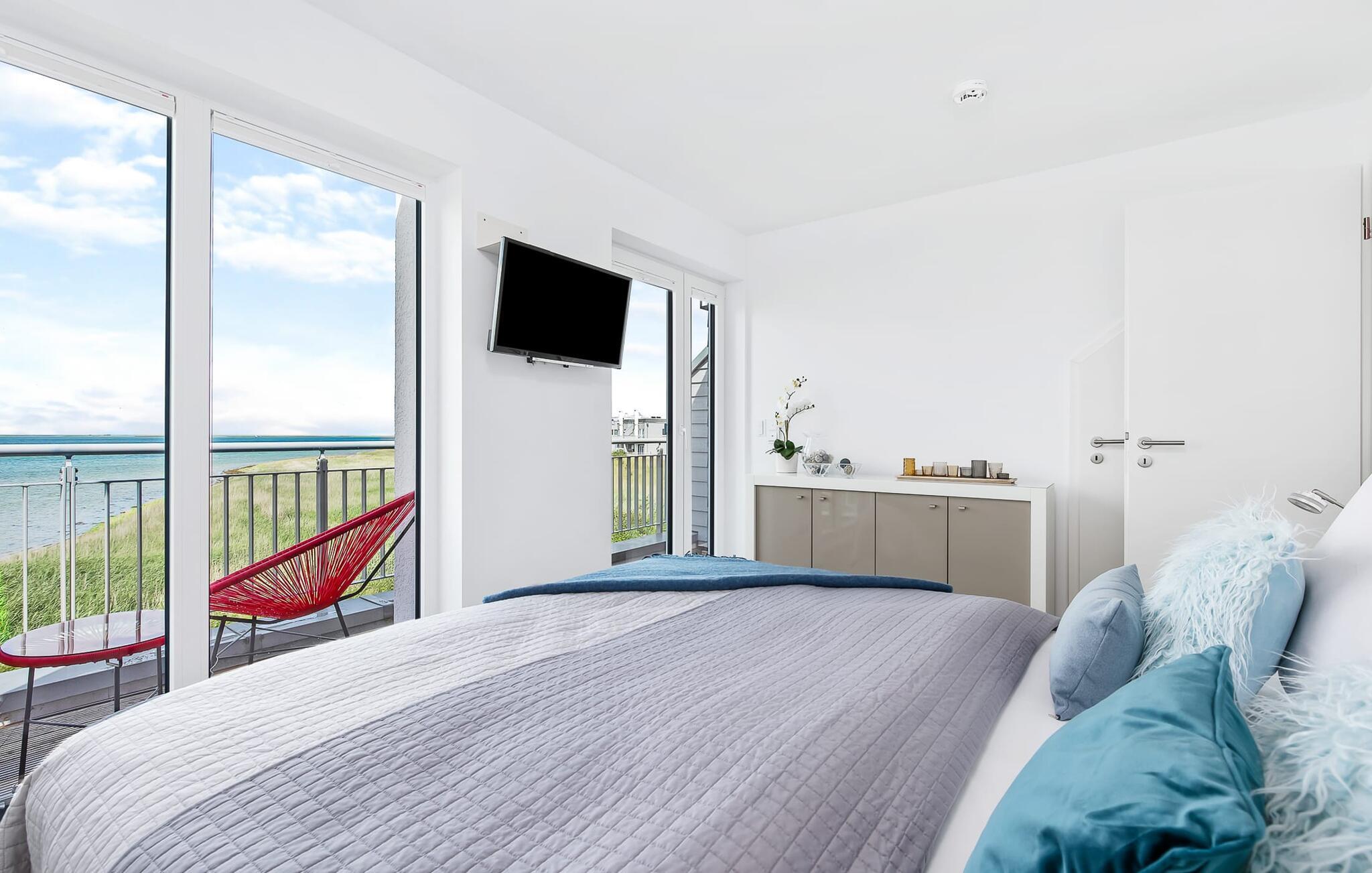 Fra stuen fører en bred trappe til første sal, hvor der er to soveværelser og badeværelse. Det store soveværelse med dobbeltseng og fjernsyn har også en balkon, hvorfra I kan se de smukkeste solnedgange for to. Ren romantik! Walk-in-closet i dette rum tilbyder ren komfort.