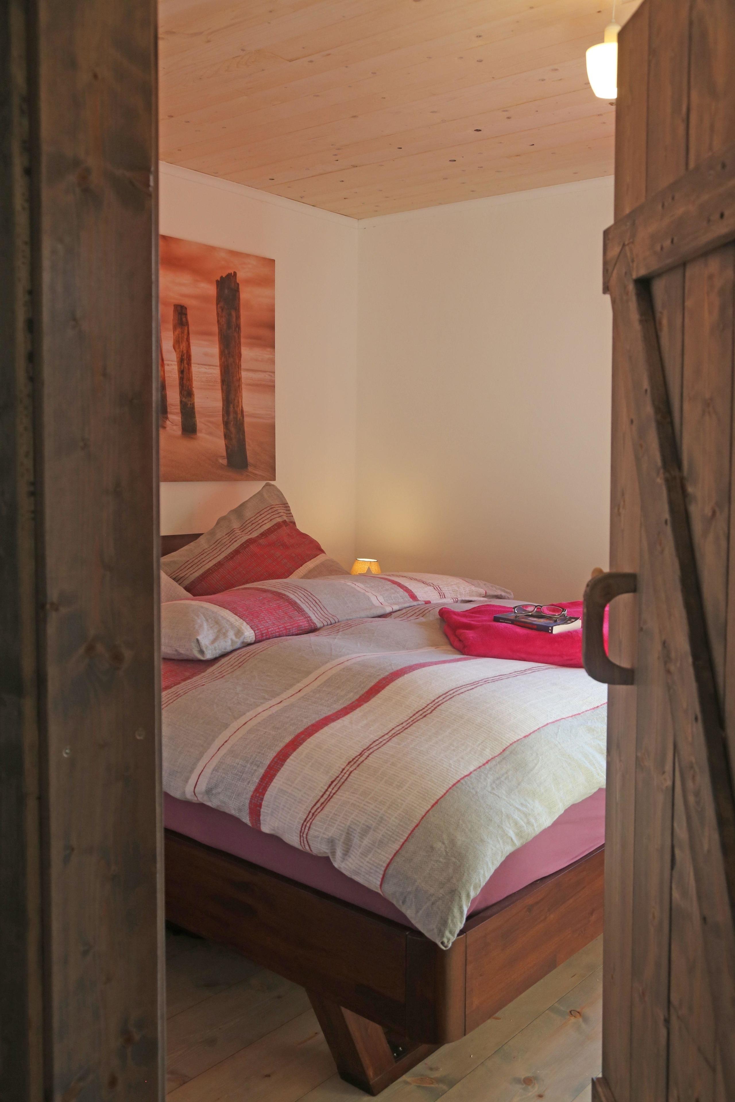 Unser Ferienhaus ist innen mit Naturmaterialien aus Holz und Rotkalkputz gebaut um Ihnen ein gesundes und wohliges Raumklima zu bereiten. Das grosse Wohnzimmer hat ein gemütliches Schlafsofa. Das Badezimmer ist sehr geräumig und die beiden Schlafzimmer sind jeweils mit 1 Doppelbett oder 2 Einzelbetten ausgestattet. Die Küche ist Ihr Mittelpunkt, und verbindet Wohnzimmer mit Terasse und Garten.