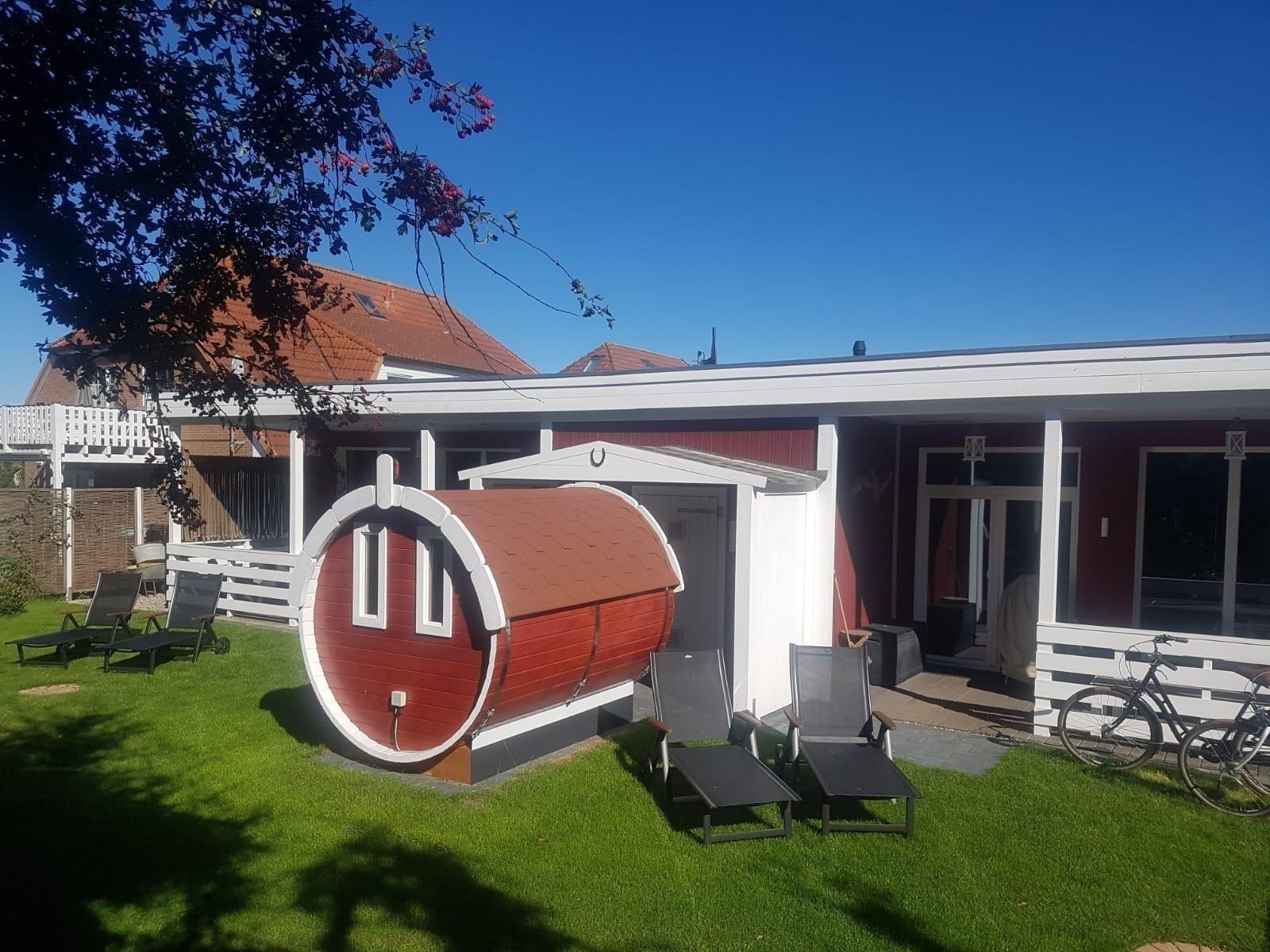 In Frühjahr 2020 haben wir ein Saunafass im Garten für unsere Gäste in den 2 Häusern gebaut. Genießen Sie einen entspannenden Saunagang nach einem Spaziergang am Meer oder einen aktiven Tag am Wasser. Es gibt einen Münzautomaten für die Saunanutzung.