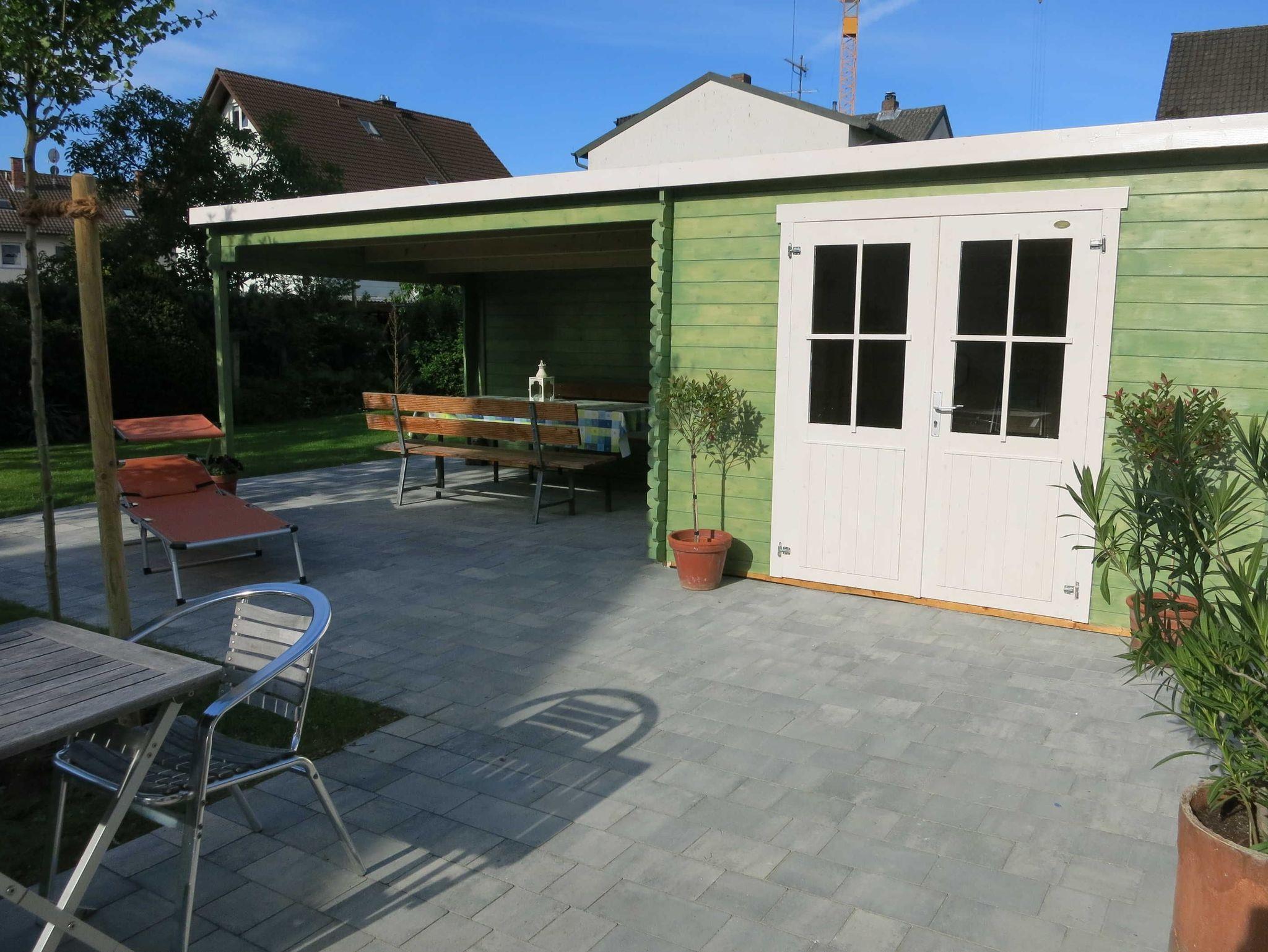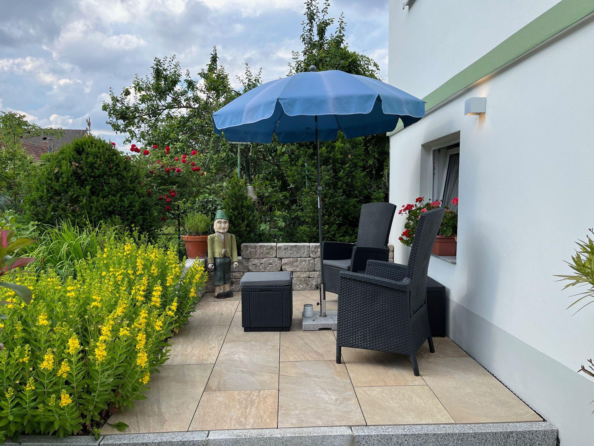 Unser kernsaniertes, helles Ferien-Apartment liegt im 1. OG eines kleinen Hauses auf unserem Anwesen, zurückgesetzt in unserem weitläufigen Bauerngarten. Von allen Fenstern blicken Sie ins Grüne, und auf der Westseite des Gebäudes steht Ihnen eine schöne Sonnenterrasse zur Verfügung. Neben dem Häuschen mit Ihrer Ferienwohnung befindet sich ein überdachter Freisitz, der vor zu viel Sonne und Regen schützt.
