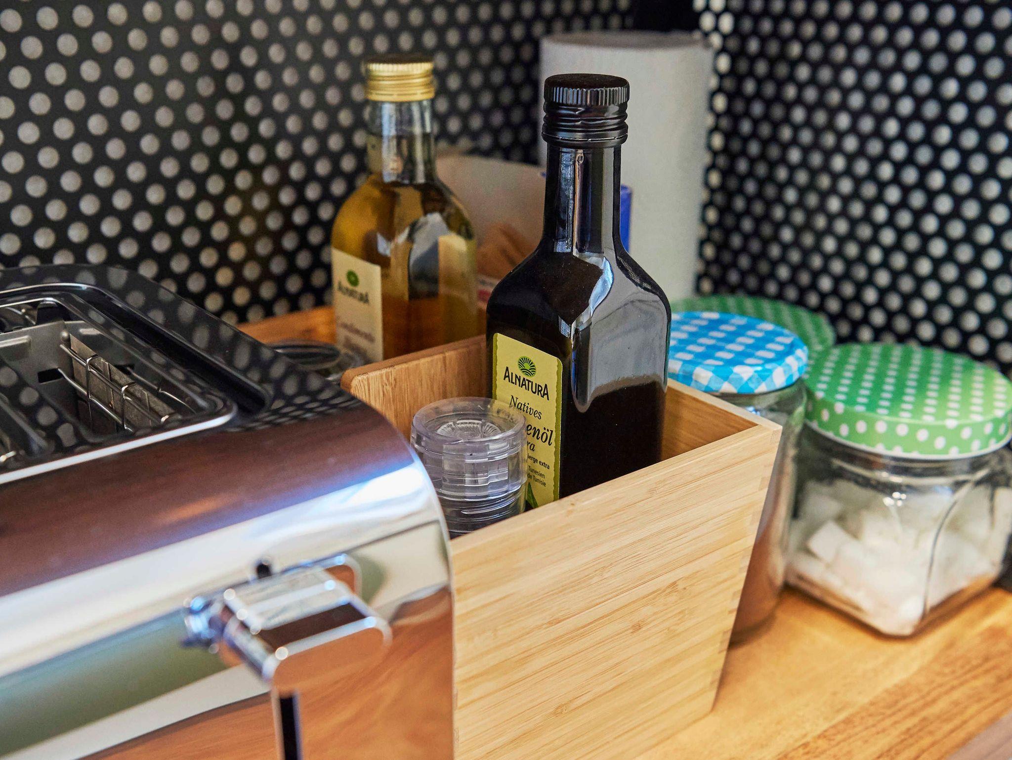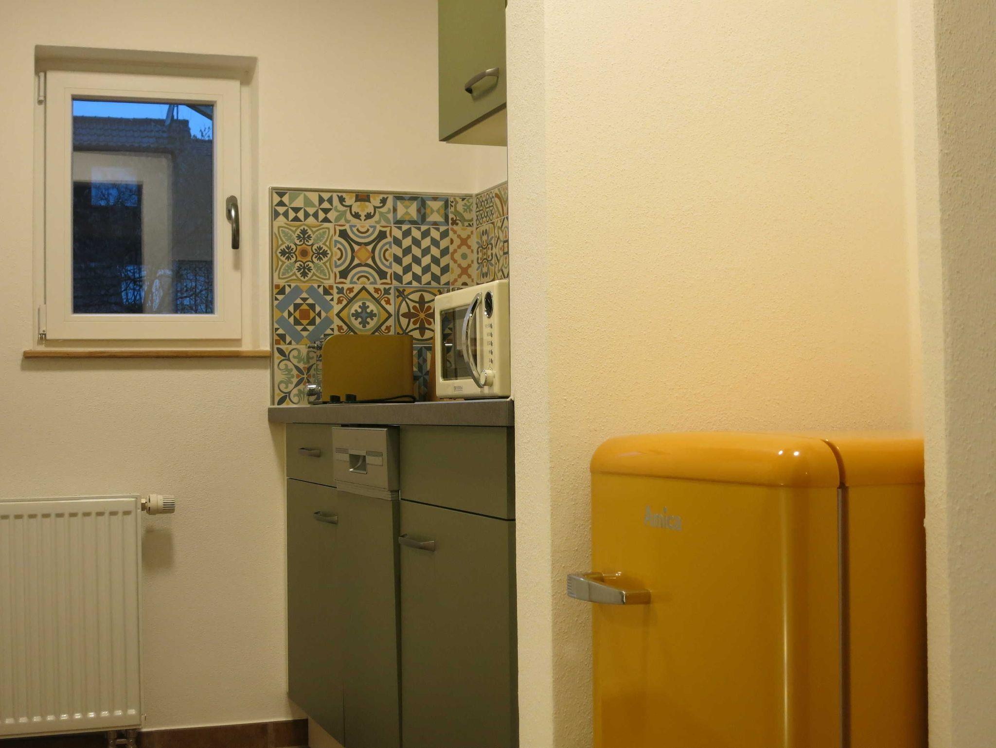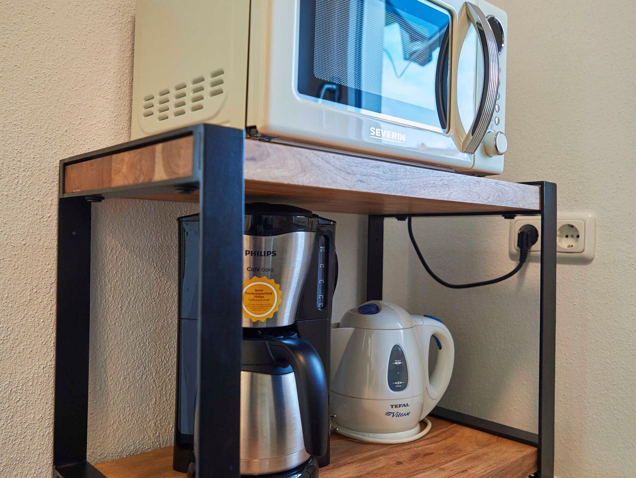Die Küche mit Fenster Richtung Westen bietet eine Küchenzeile mit Cerankochfeld (2 Platten), Spülmaschine, Spülbecken, Unter- und Oberschränken, Mikrowelle mit Grill und Heißluft-/Backfunktion, Kühlschrank mit Eisfach, Kaffeemaschine, Toaster, Wasserkocher. Zur Grundausstattung gehören Salz und Pfeffer, Essig und Öl, Kaffee/Kaffeefilter, Tee, Zucker, Spül- und Reinigungsmittel sowie Geschirrtücher.