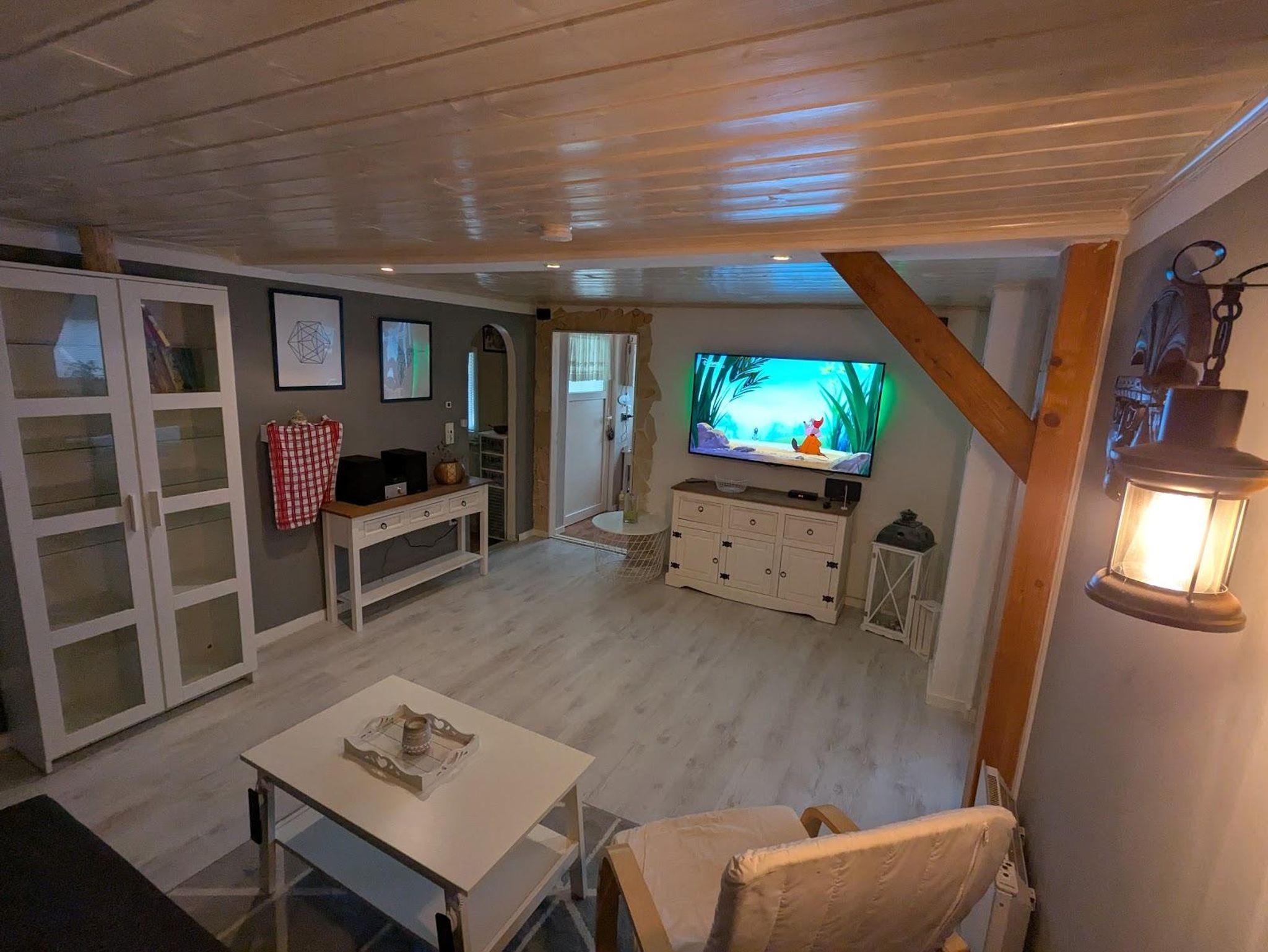 Das gemütliche Wohnzimmer ist mit einem 65 Zoll Flachbild-TV inkl. Freenet TV und einer Sitzgruppe eingerichtet.