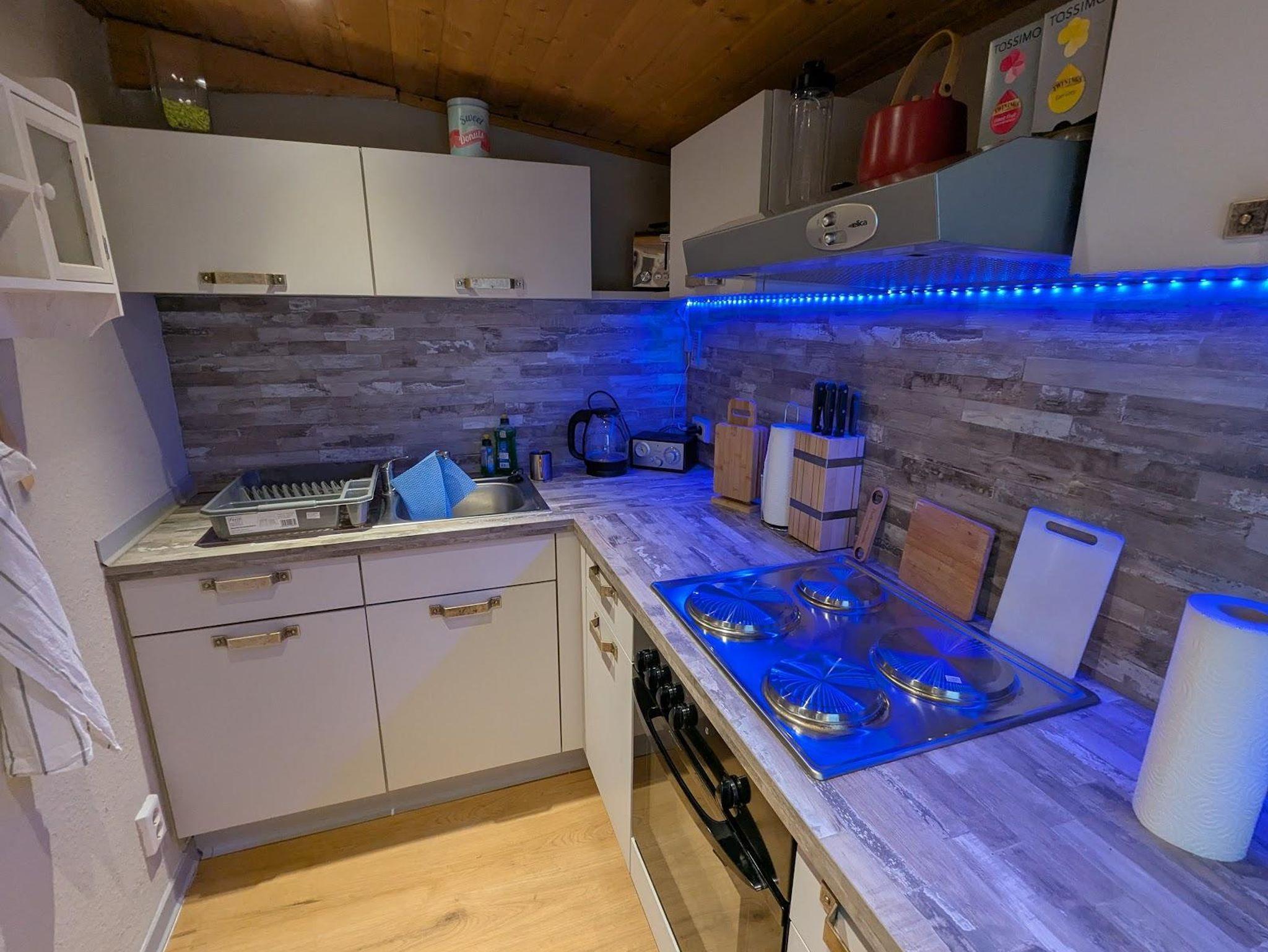 Die voll ausgestattete Küche mit Backofen, Kaffeemaschine, Toaster und Wasserkocher lässt keine Wünsche offen, um Ihre Mahlzeiten zuzubereiten.