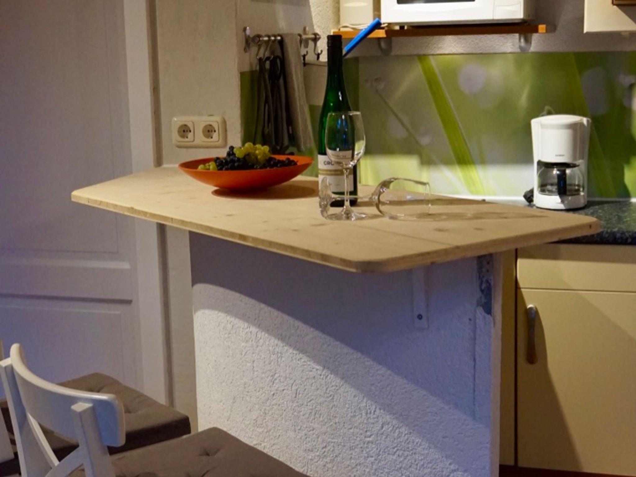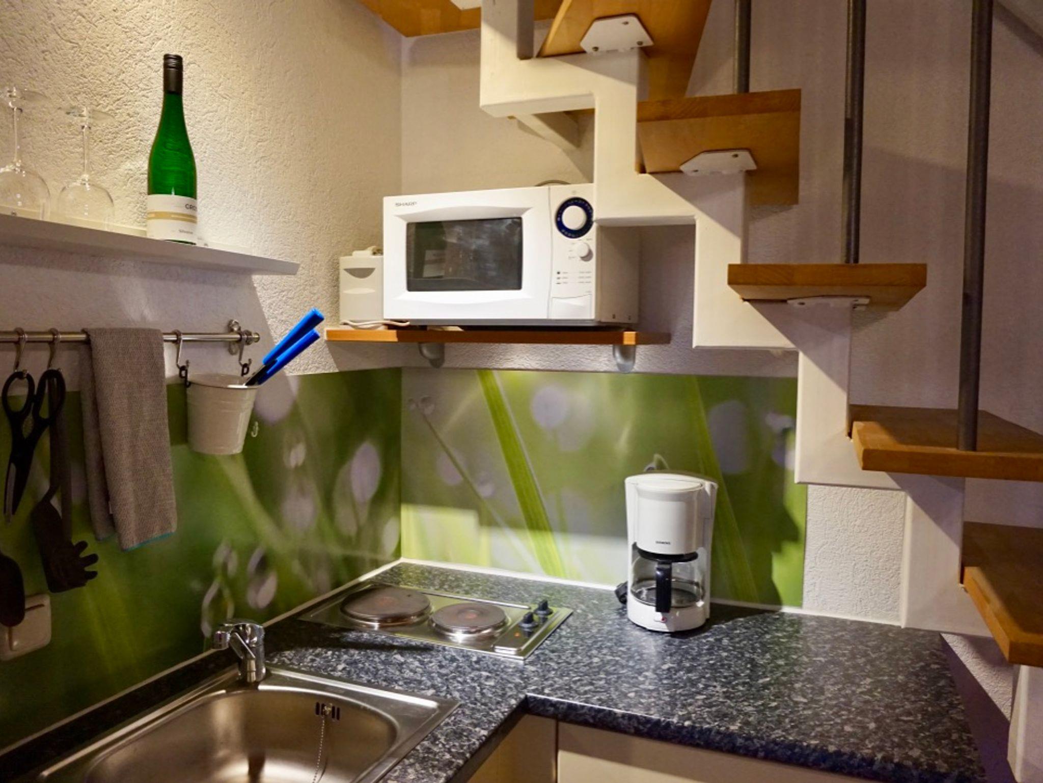 Die Küchenzeile bietet eine Mikrowelle, einen Herd mit 2 Kochfeldern und einen Kühlschrank. Kaffeemaschine, Wasserkocher und Toaster gehören zur Grundausstattung.