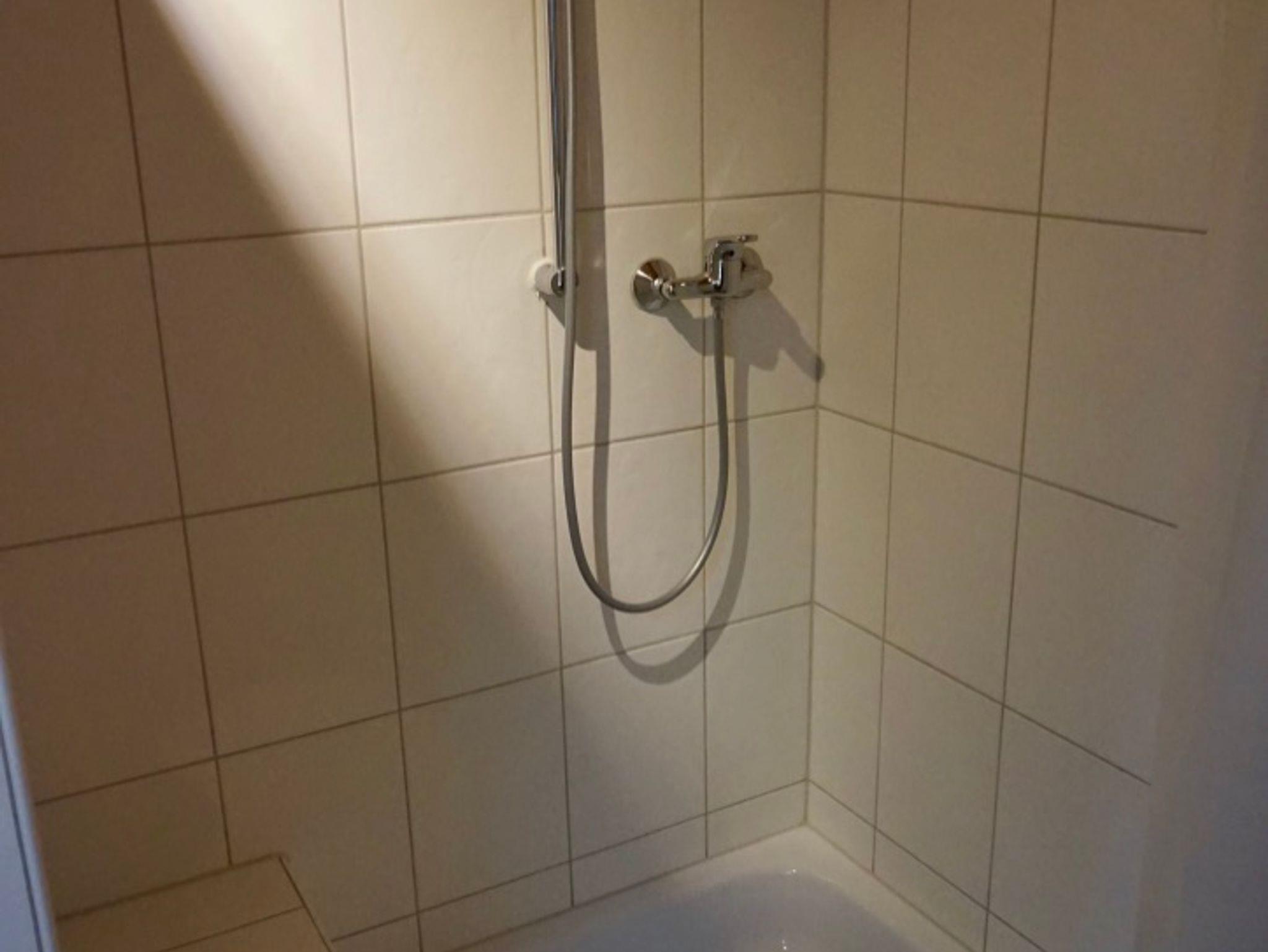 Im hellen, freundlichen Bad befinden sich eine Dusche, ein WC, ein Waschtisch sowie ein Haartrockner.