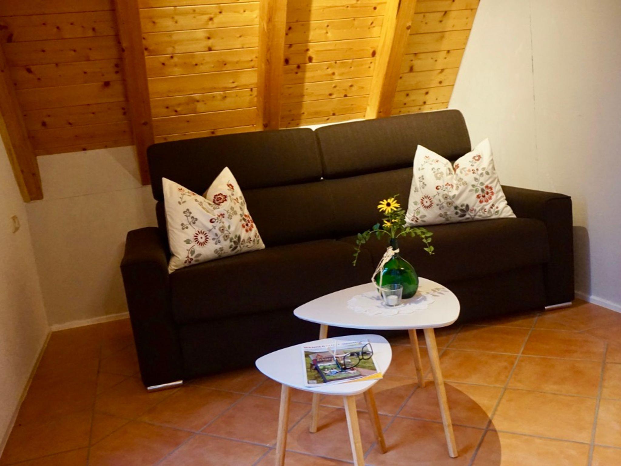 Der gemütliche Wohn-/Schlafraum mit Fliesenboden besteht aus einem Schlafsofa mit ausziehbaren Matratzen (1,60m x 2,00m), einem Essplatz, Garderobe, Flachbild-TV, W-Lan.