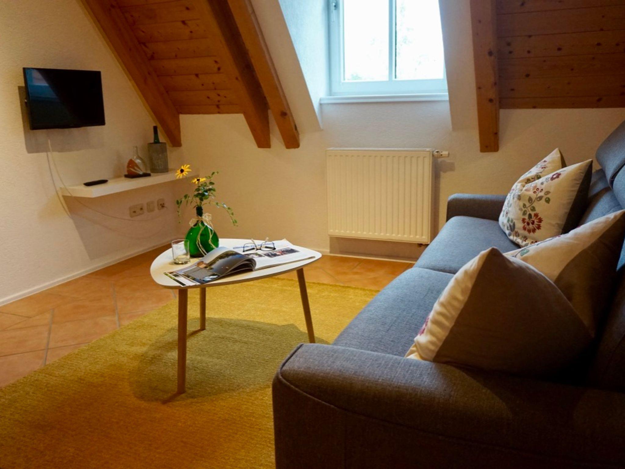 Der gemütliche Wohn-/Essraum mit Fliesenboden besteht aus einem Schlafsofa mit ausziehbaren Matratzen (1,60m x 2,00m), einem Essplatz, Garderobe, Flachbild-TV, W-Lan.