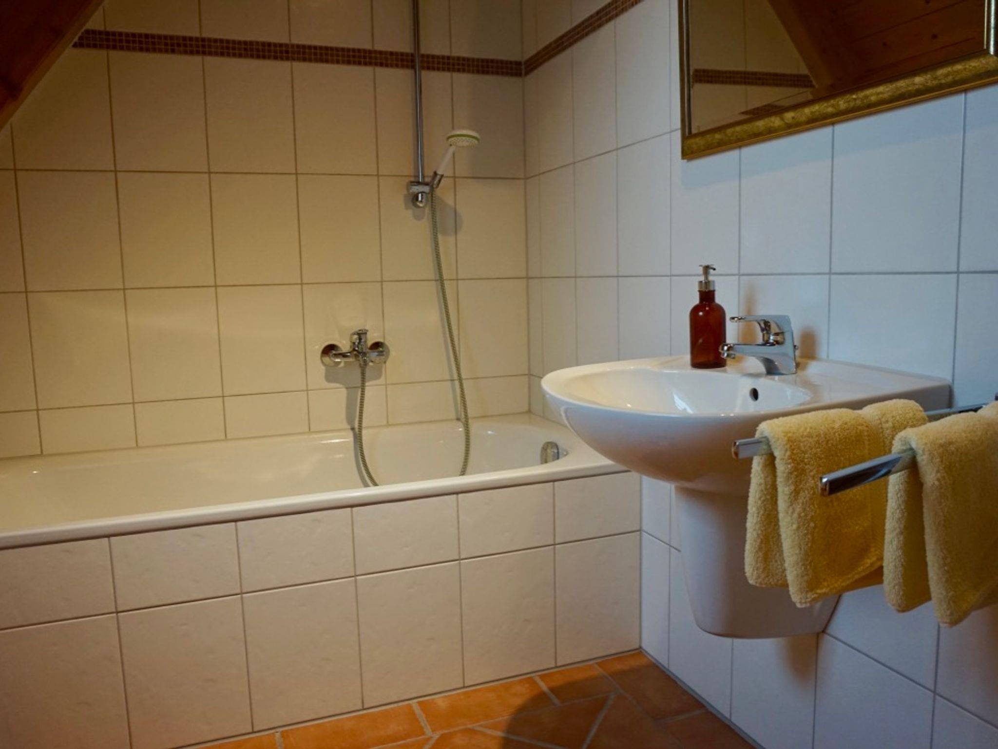 Im hellen, freundlichen Bad befinden sich eine Badewanne, ein WC, ein Waschtisch sowie ein Haartrockner.