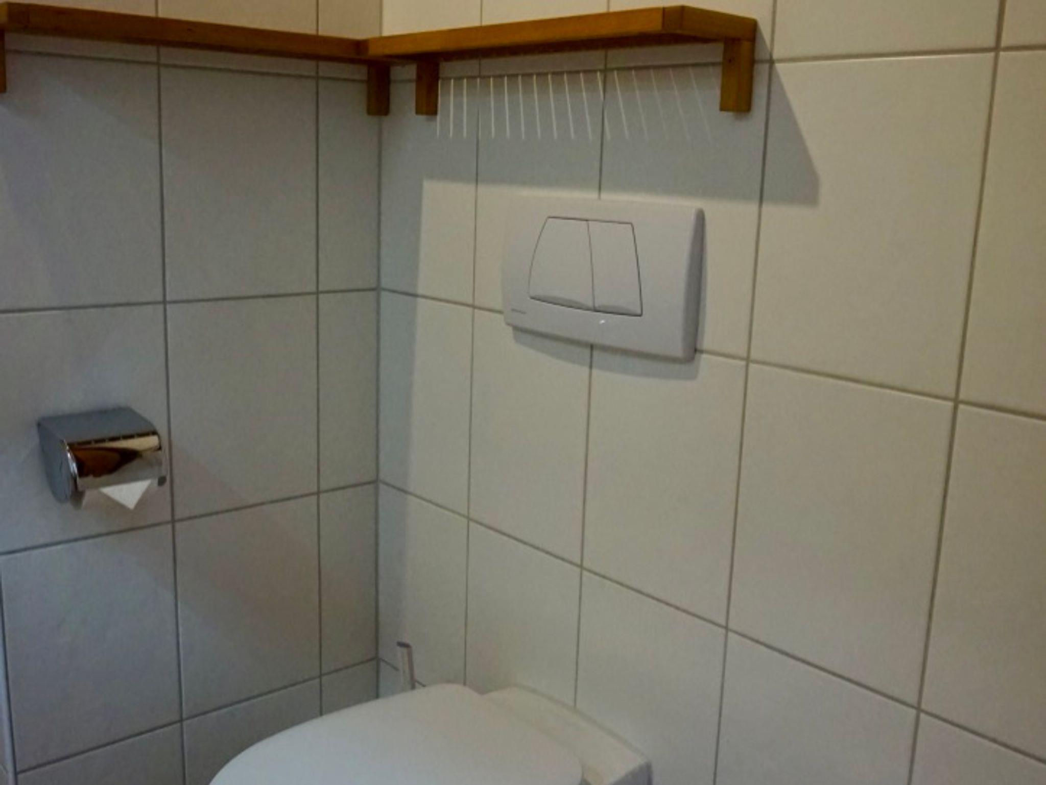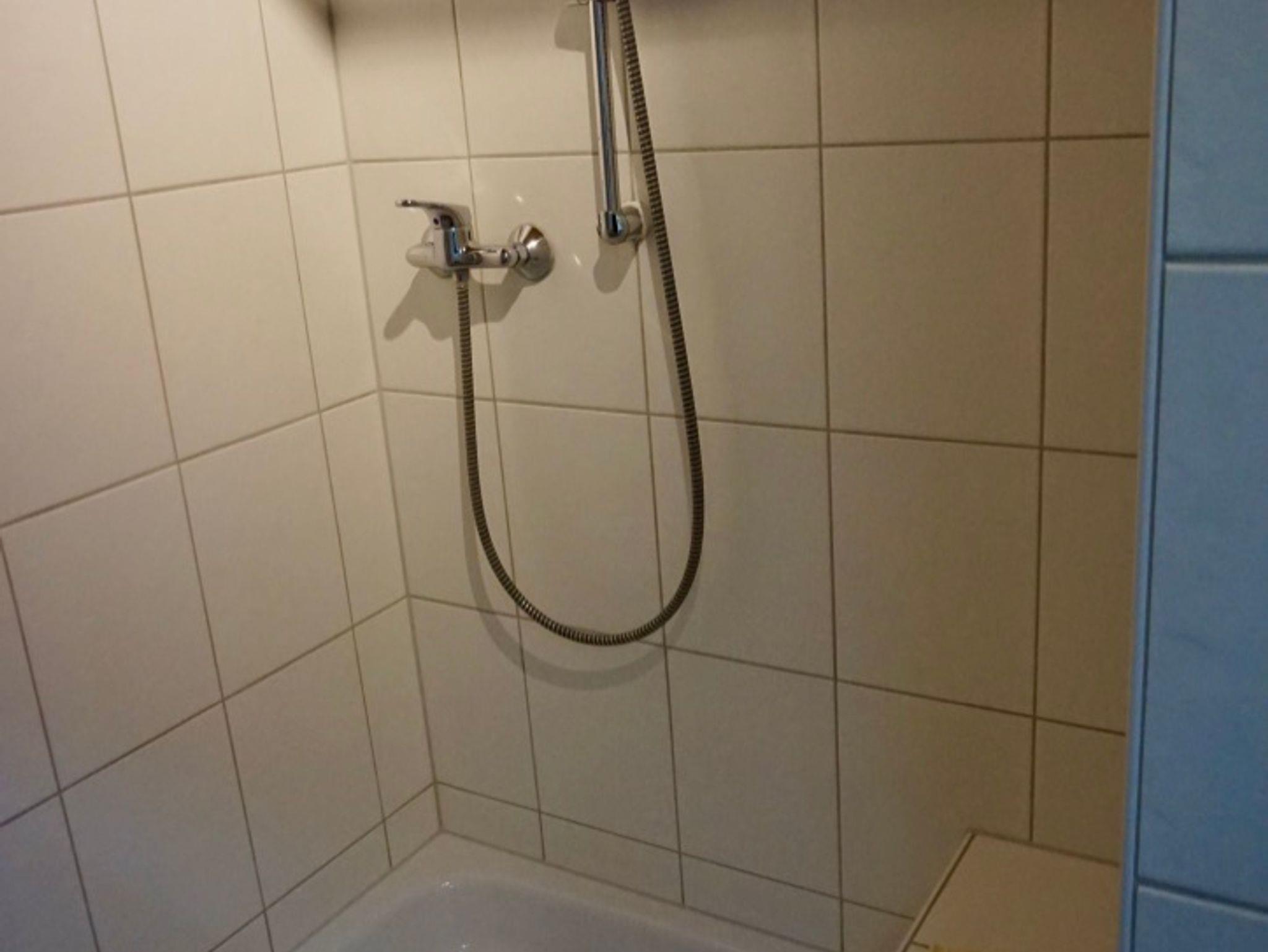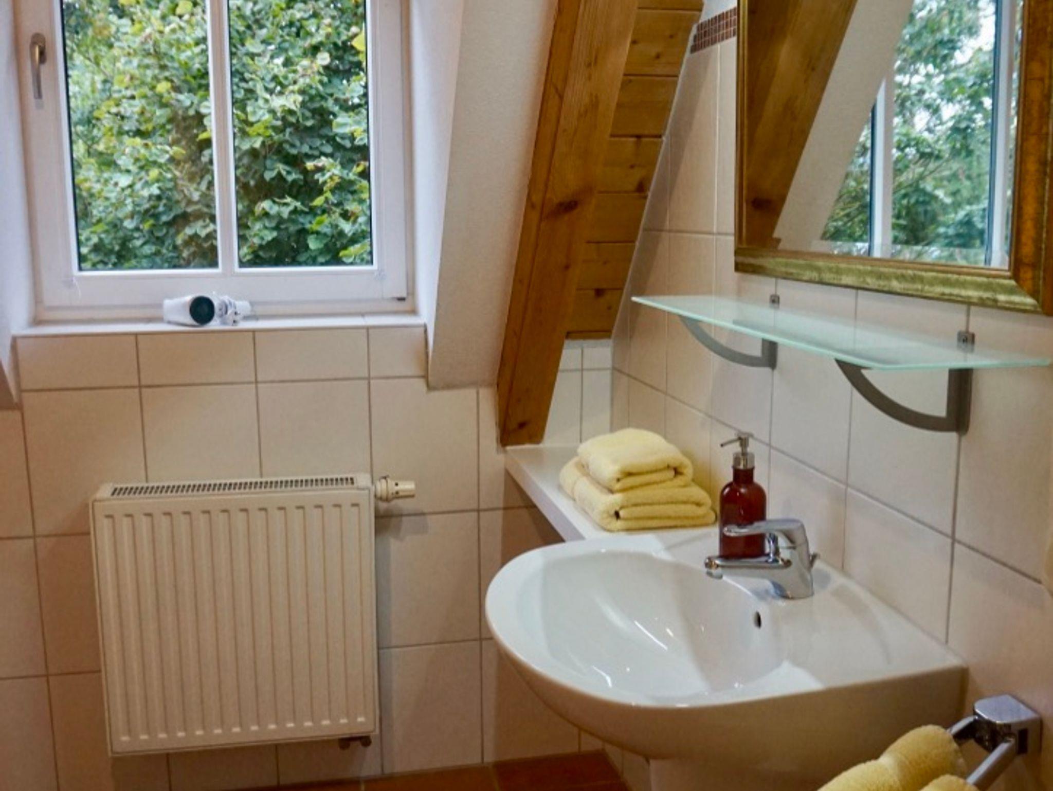 Im hellen, freundlichen Bad befinden sich eine Dusche, ein WC, ein Waschtisch sowie ein Haartrockner.