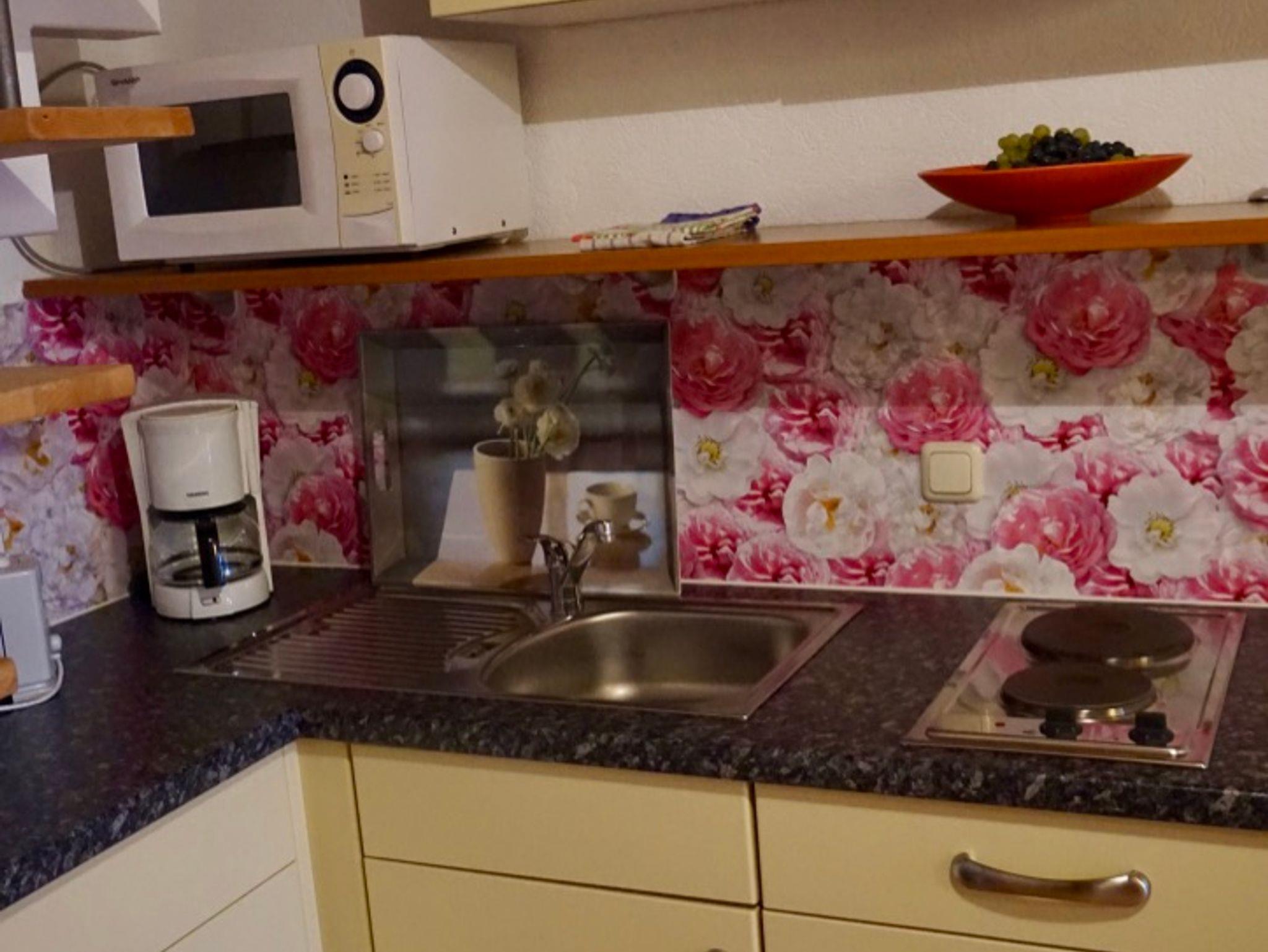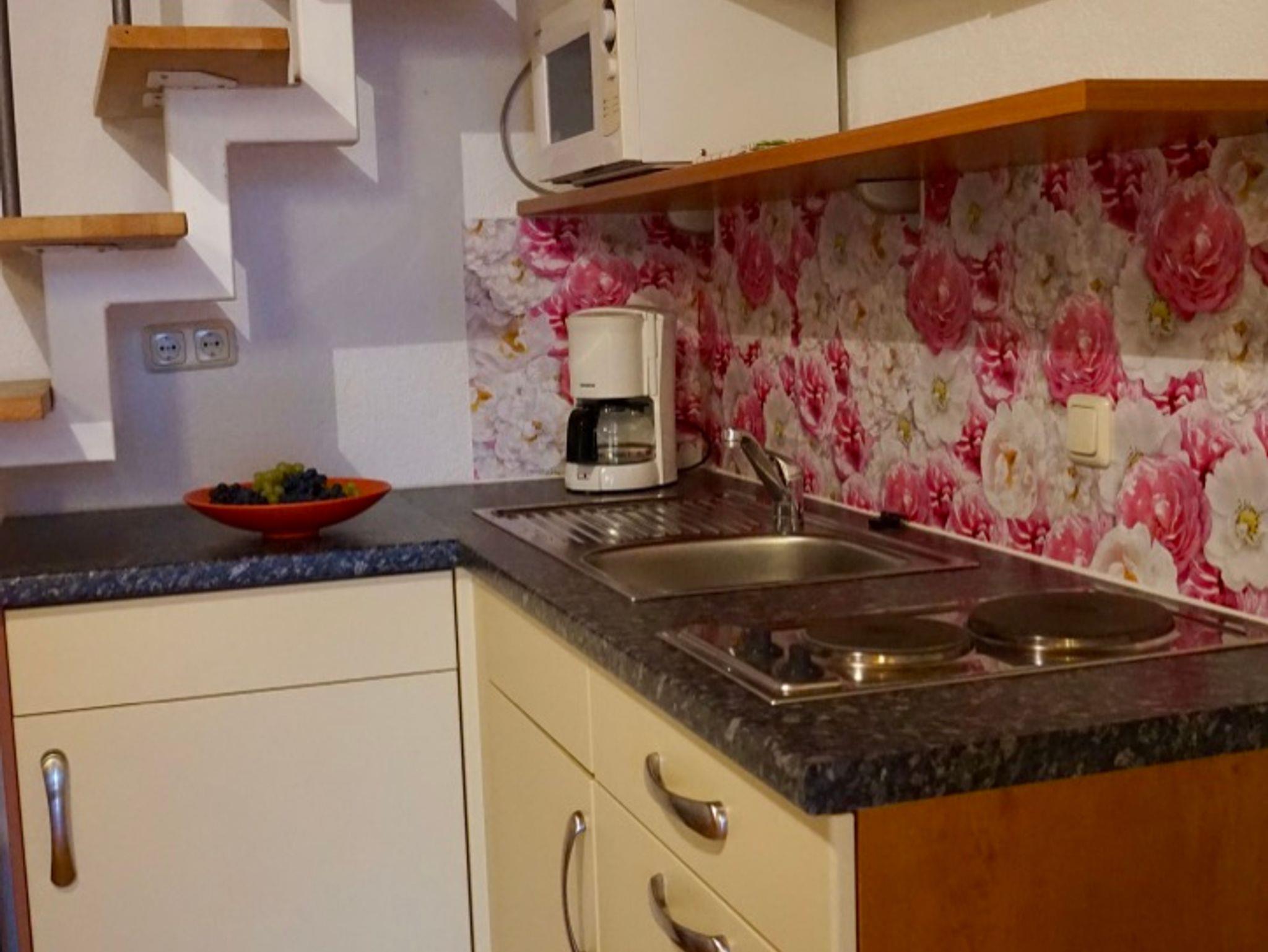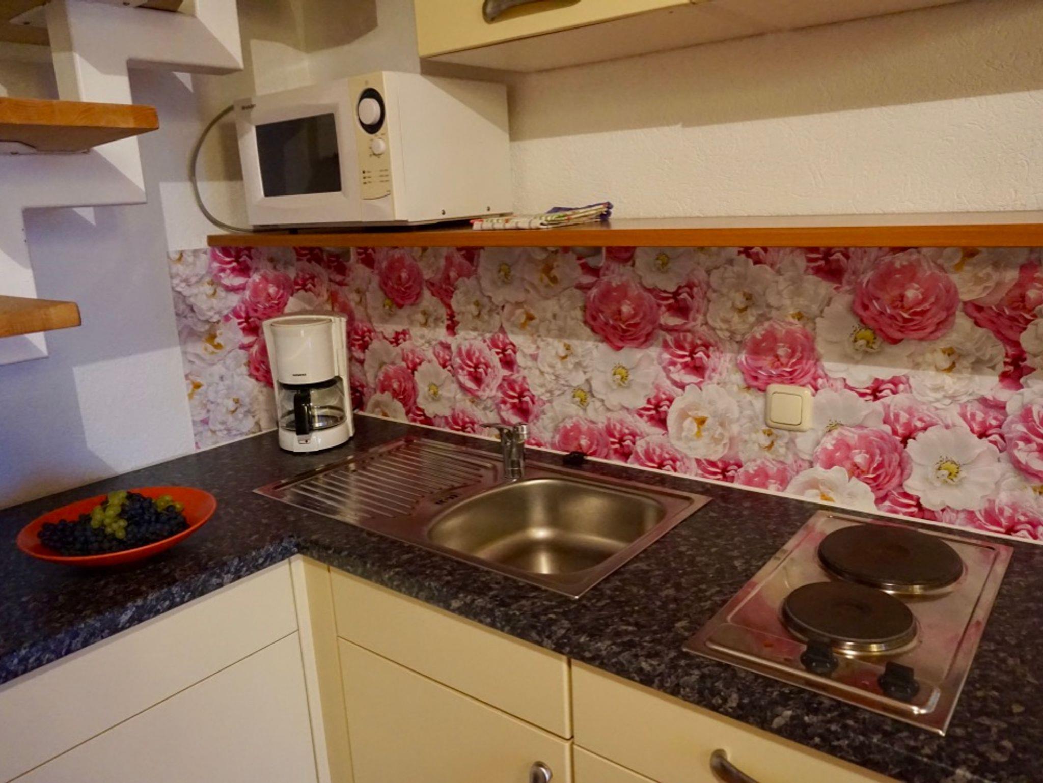 Die Küchenzeile bietet eine Mikrowelle, einen Herd mit 2 Kochfeldern und einen Kühlschrank. Kaffeemaschine, Wasserkocher und Toaster gehren zur Grundausstattung.