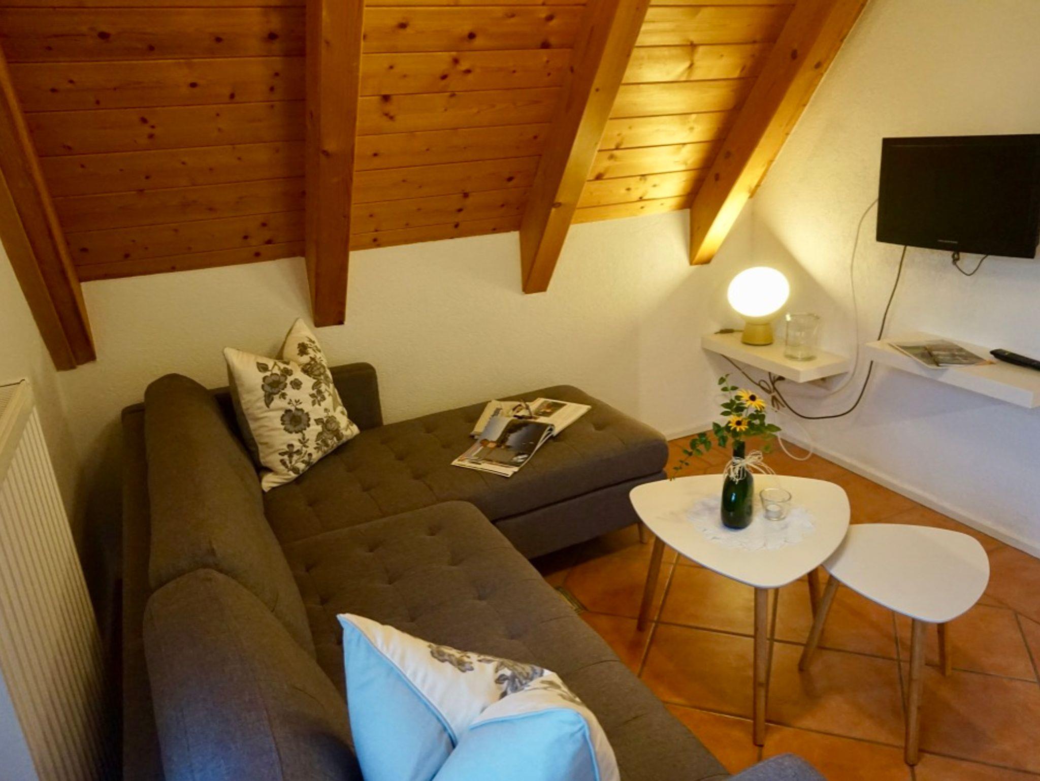 Der gemütliche Wohn-/Essbereich mit Fliesenboden besteht aus einer 2-Sitzer Couch, einem Essplatz, Garderobe, Flachbild-TV, W-Lan.