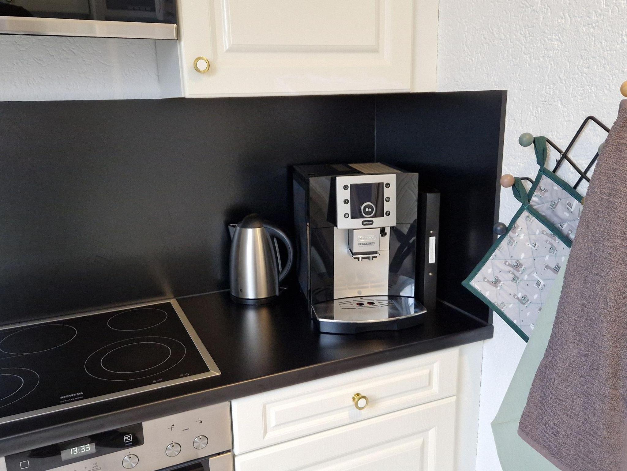 Die voll eingerichtete Küche ist mit Spülmaschine, Mikrowelle, und diversen Elektrogeräten ausgestattet.
