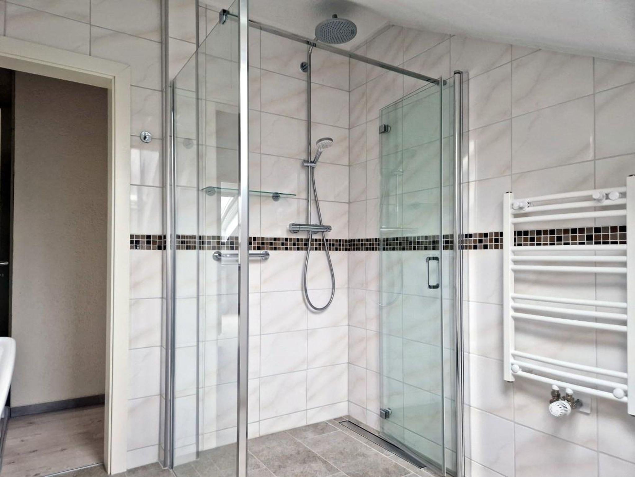 Das Bad hat eine Ganzglasdusche mit Kopfbrause und ebenerdigem Einstieg.