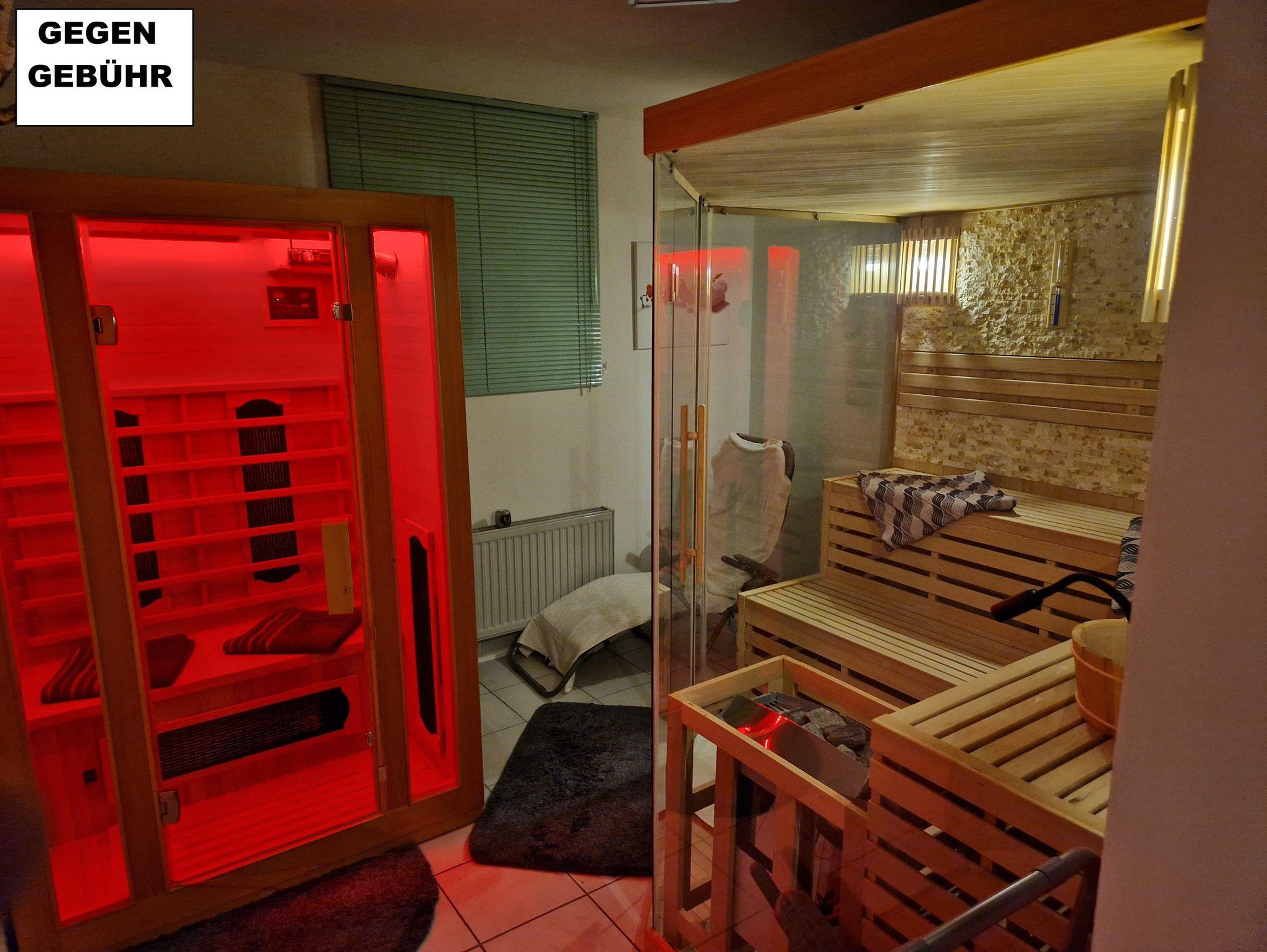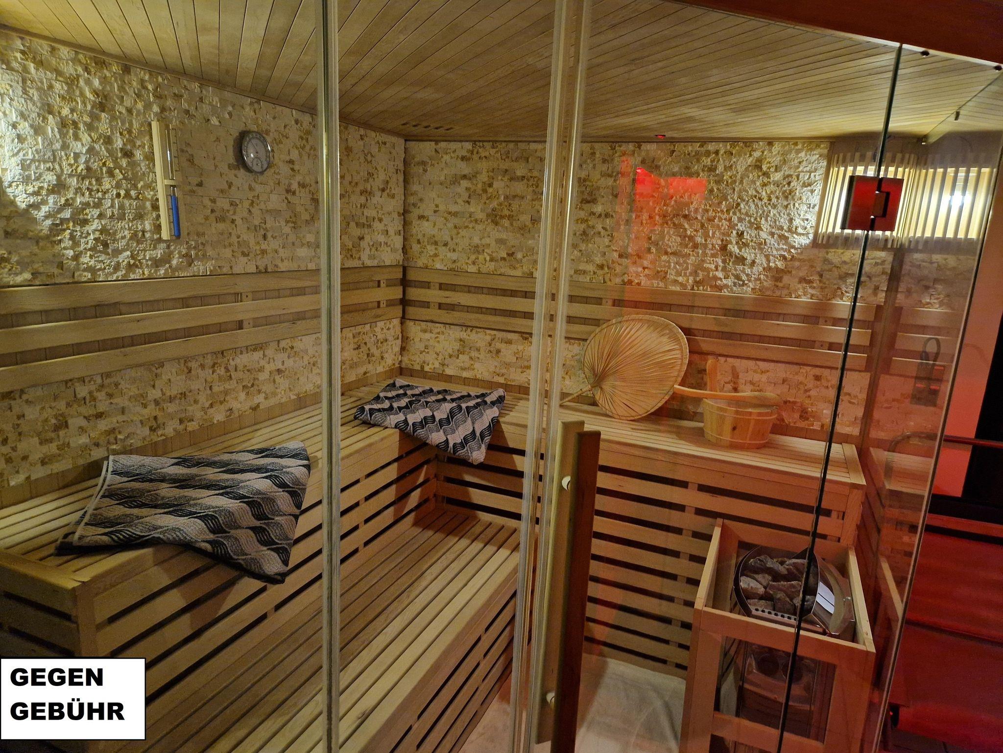 Im Untergeschoß können Sie in einer Panorama-Sauna und einer Infrarot-Wärmekabine gegen Gebühr relaxen. Die Benutzung ist zeitnah mit dem Vermieten abzusprechen, Auch hier sind zwei Liegen aufgestellt.