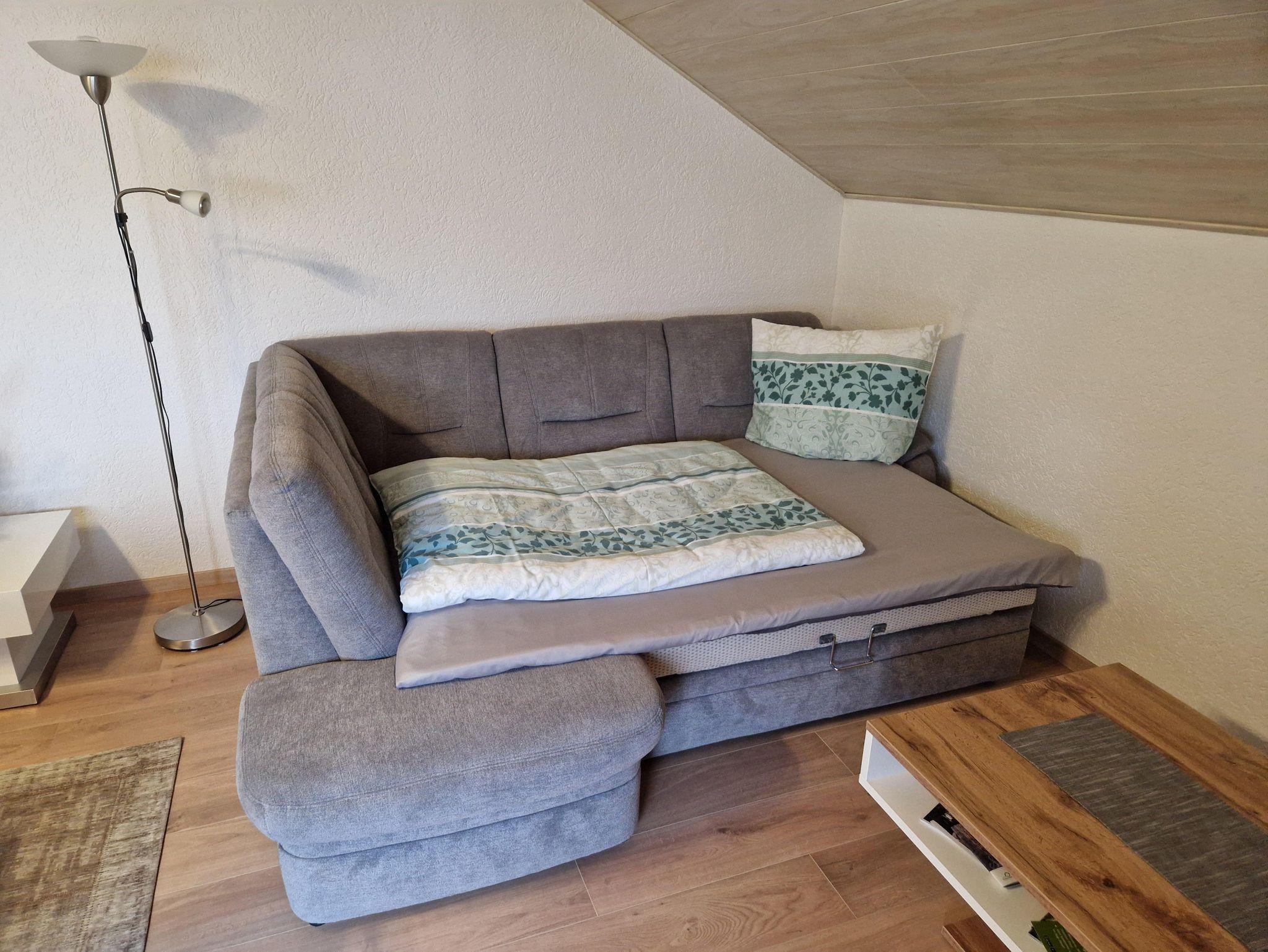 Im Wohn-Esszimmer befindet sich ein Tisch mit vier Stühlen, ein Highboard und Couch mit Bettfunktion, ein Couchtisch, eine Komode mit TV.