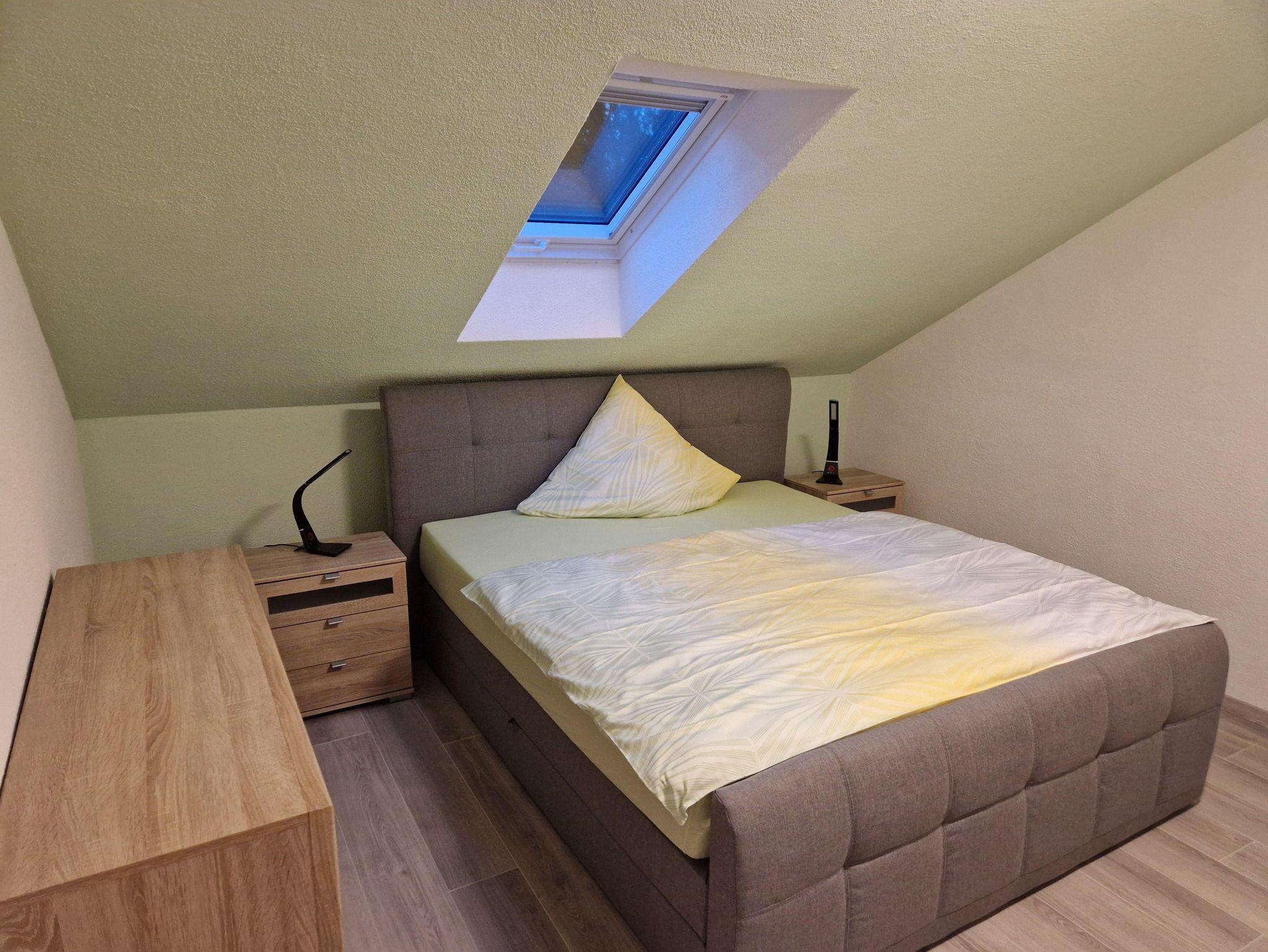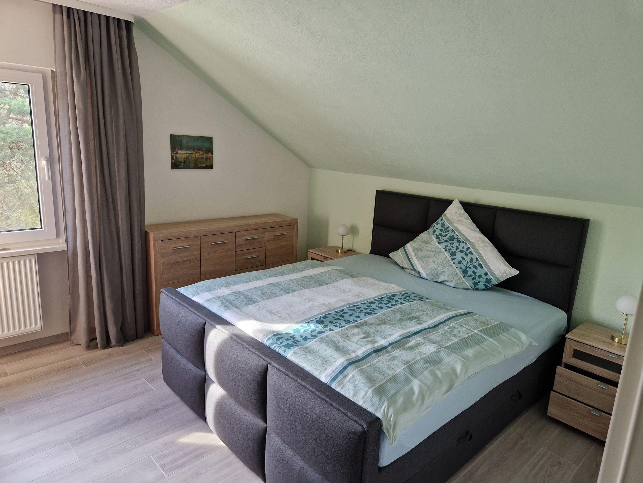 Die 85 m² große Ferienwohnung hat zwei Schlafzimmer mit Boxspringbetten(1,80 X 2,00), Schlafzimmer 1 mit viertürigem Kleiderschrank, Komode und Nachtschränke. Schlafzimmer 2 mit Schwebetürenschrank, Komode, Nachtschränke und Tisch.