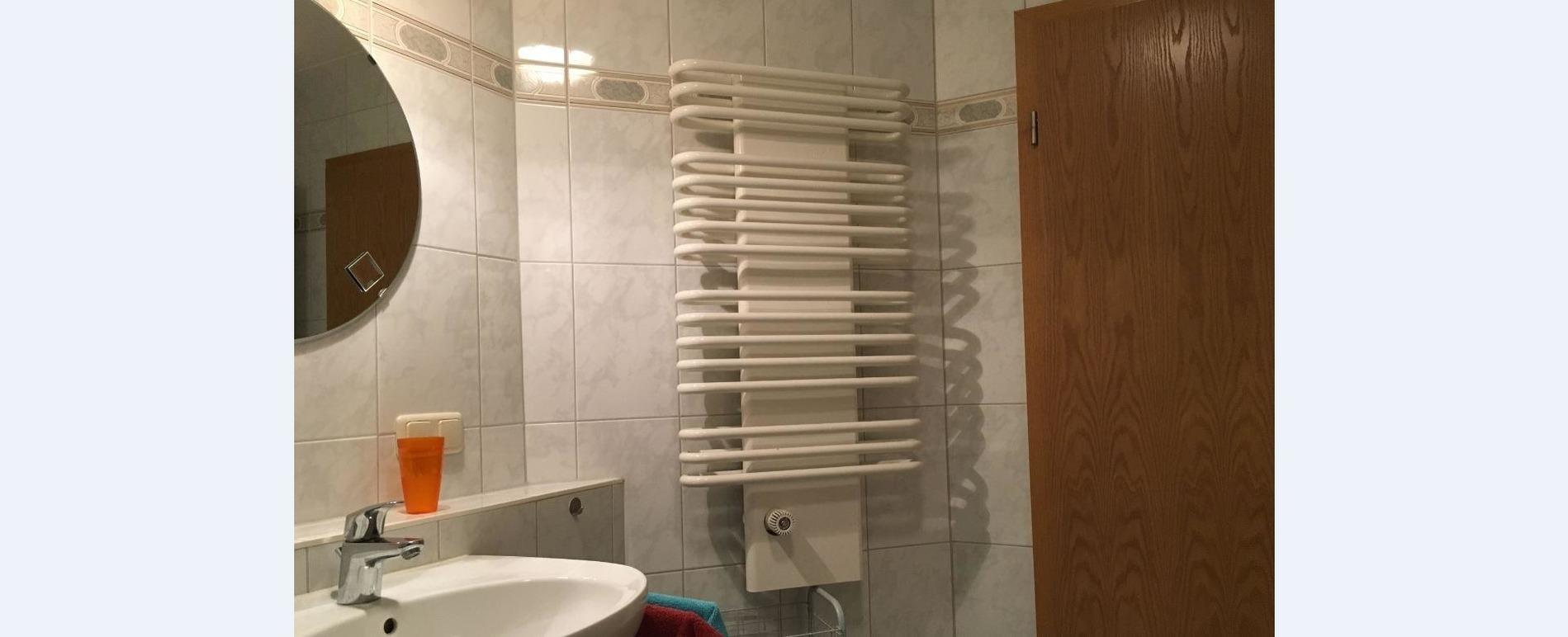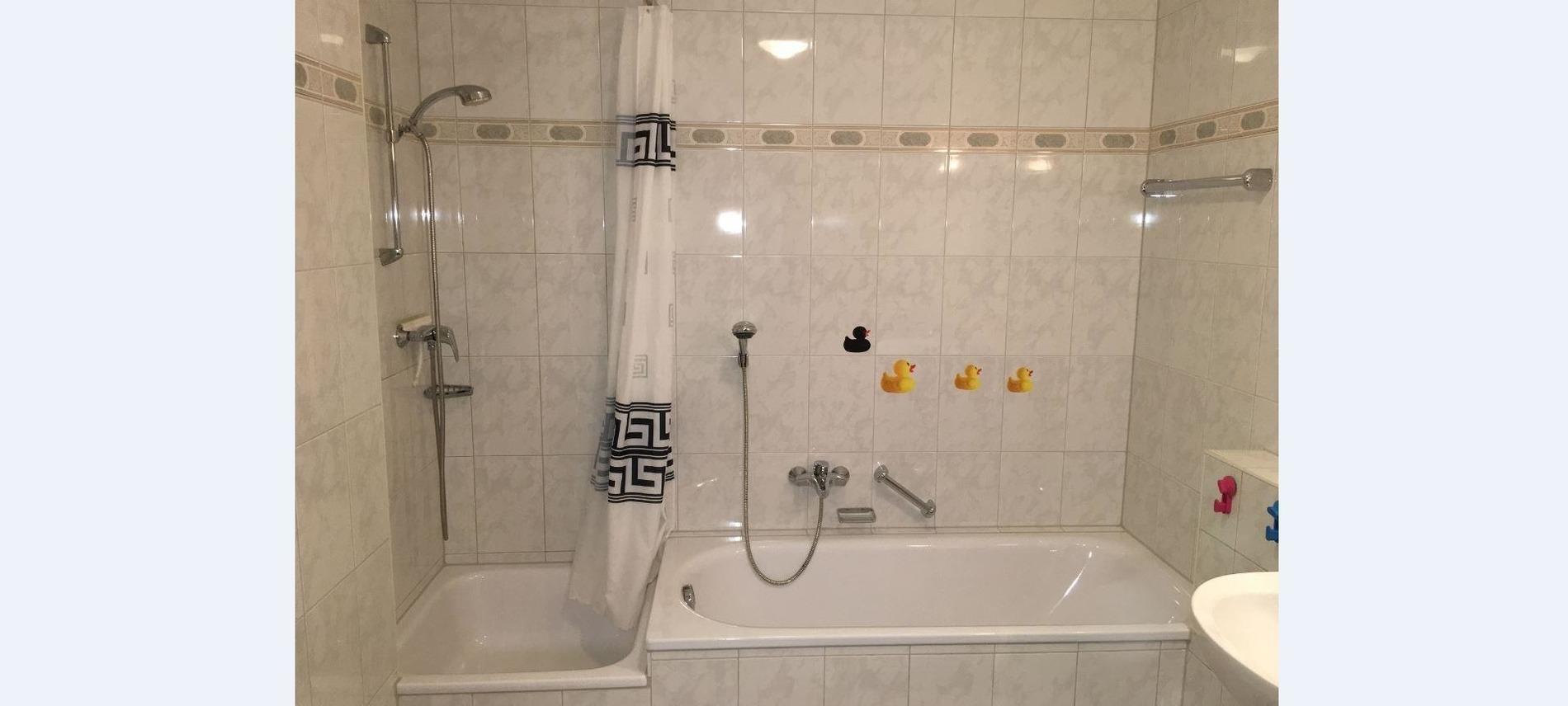 Das Bad und der Flur der hellen Wohnung sind gefliest. Im Wohn- und im Schlafzimmer ist Parkett verlegt. Das Doppelbett im Schlafzimmer ist mit Taschenfederkernmatratzen ausgestattet und die Liegefläche des Verwandlungssofa mit Federkern.