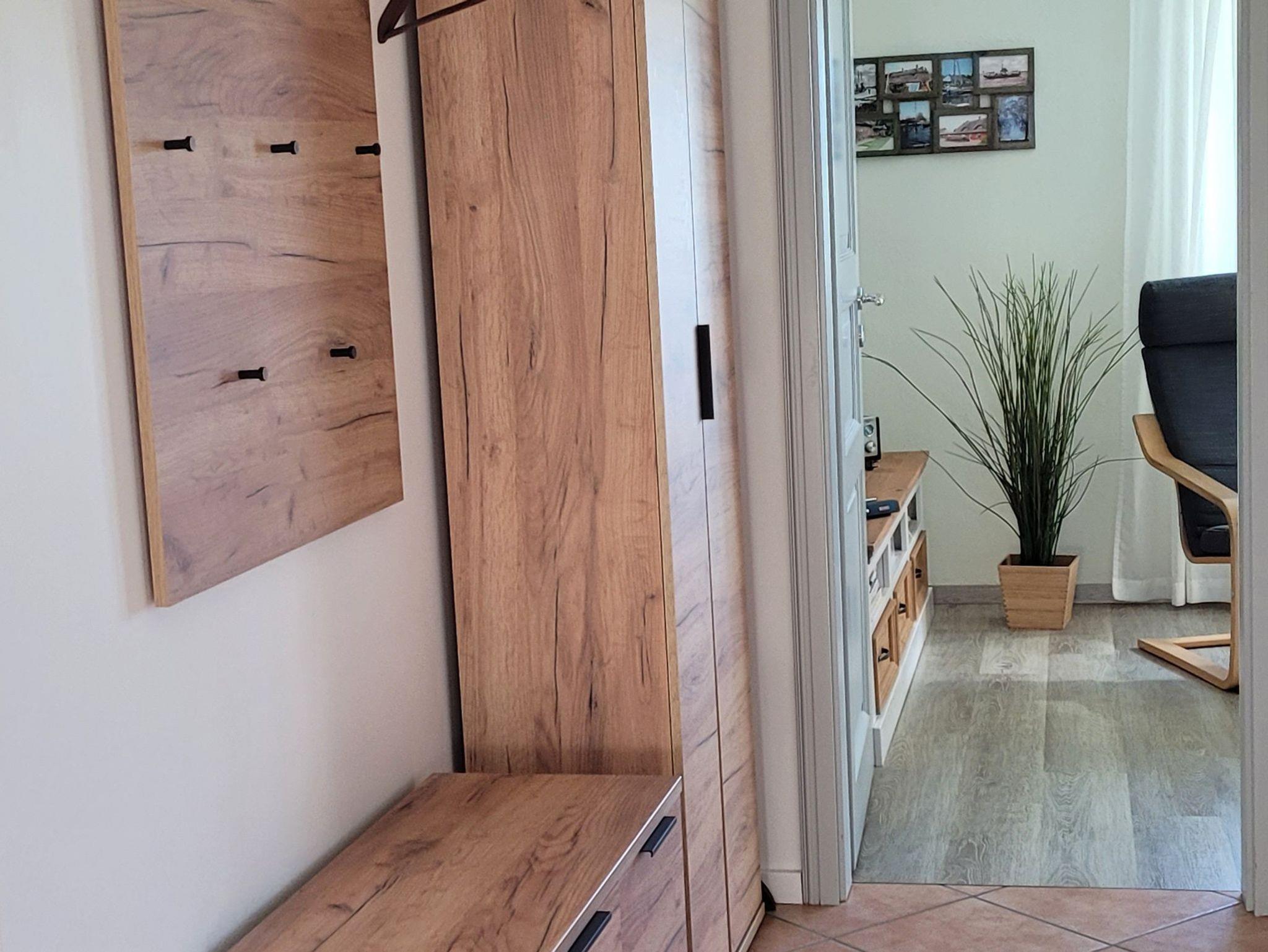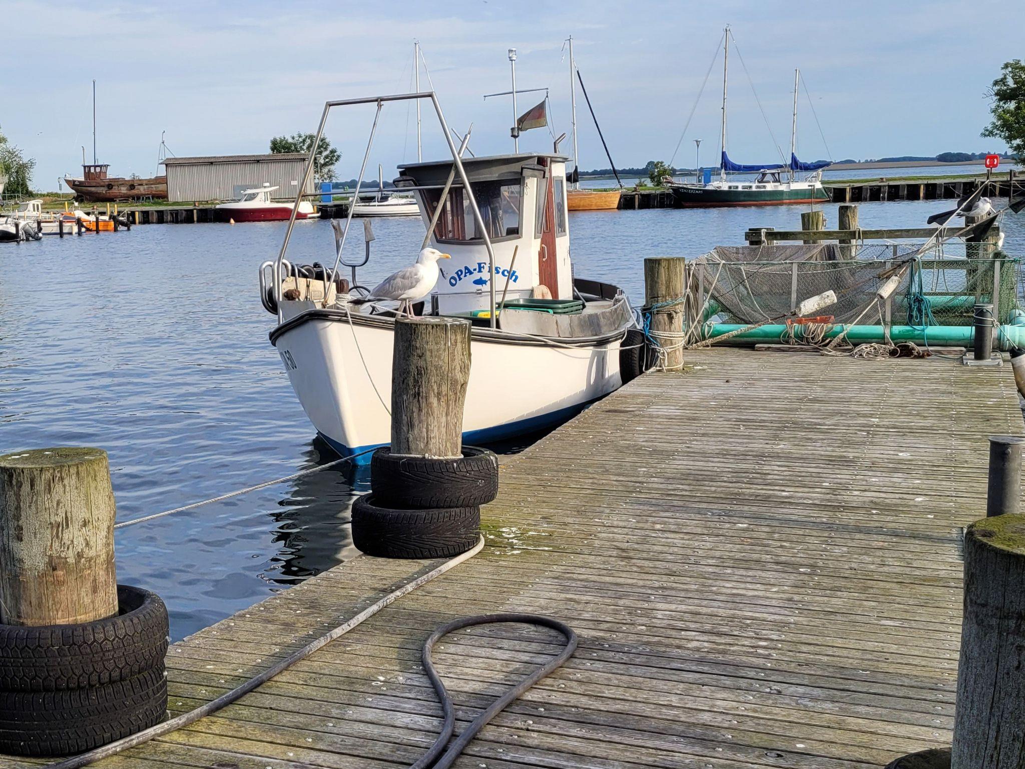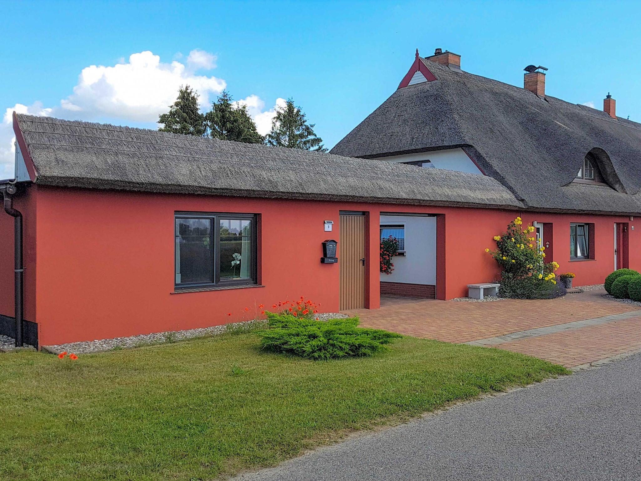Die Ferienwohnung ist 45m² groß, ebenerdig und befindet im Anbau eines reetgedachten Hauses in Stahlbrode mit separatem Eingang. Die gemütlich und modern eingerichtete Ferienwohnung verfügt über ein Schlafzimmer, Wohnzimmer, Küche und einem Bad mit Dusche und WC. Im Schlafzimmer befindet sich ein Doppelbett (160x200) mit Nachtschränken, Kommode, Sitzbank und kleinem Kleiderschrank. Vom gemütlichen Wohnzimmer mit Ecksofa, Schwingsessel, Schreibtisch, Fernseher und Radio, haben Sie einen Blick über die Felder und im Frühjahr und Herbst sogar bis zum Wasser. Die Küche ist ausgestattet mit einer Küchenzeile, Herd mit Backofen, Kühlschrank mit Gefrierfach, Mikrowelle, Kaffeemaschine, Wasserkocher, Toaster, Eierkocher und einem Esstisch für zwei Personen. Der Garten sowie die Sitzecke und Grill können mitbenutzt werden. Vor dem Haus ist ein Pkw-Stellplatz vorhanden. In dieser Ferienwohnung wird Strom (auch Elektroheizung) vor Ort nach Verbrauch abgerechnet.