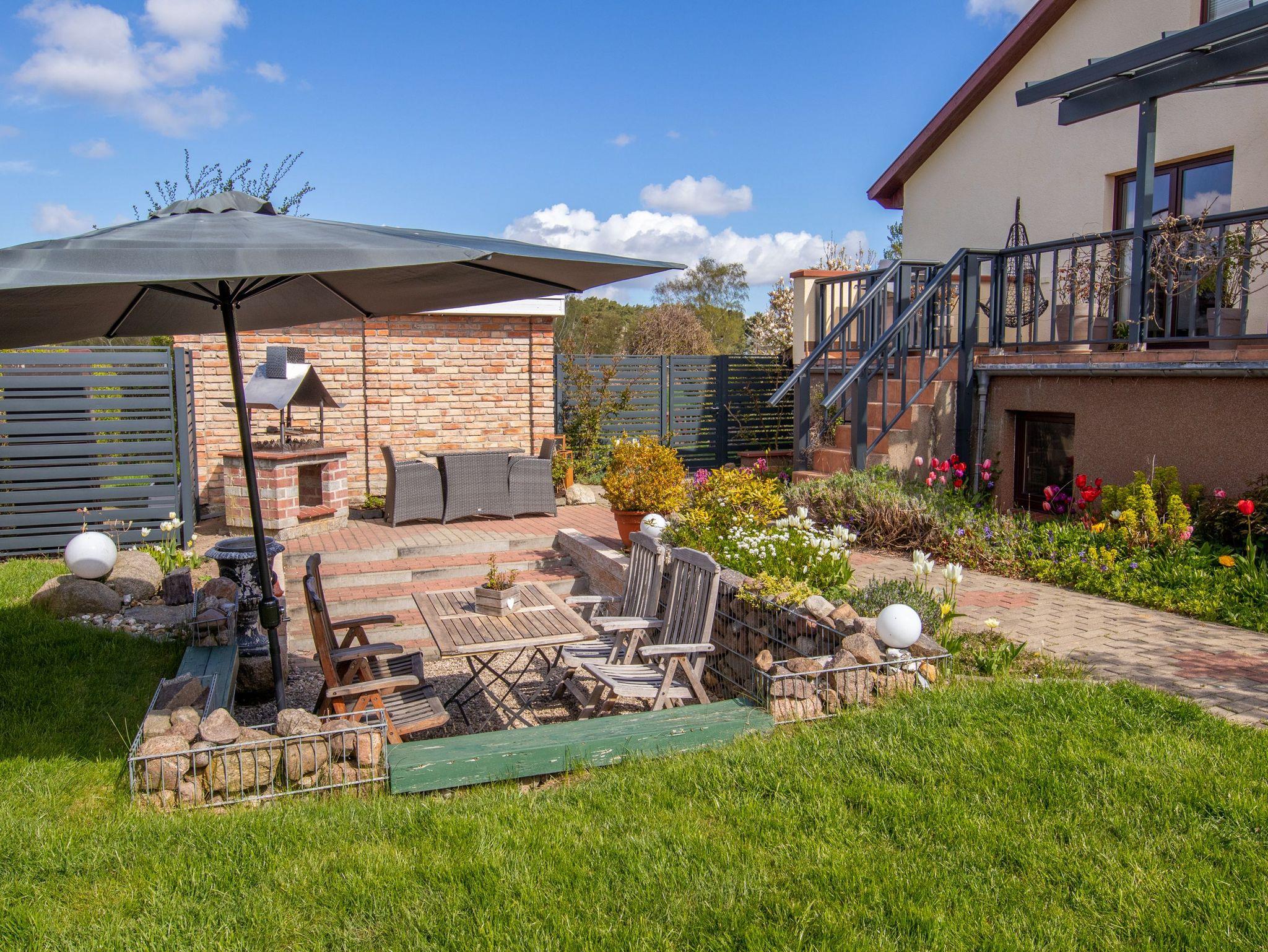 Zur Ferienwohnung gehören ein Pkw-Stellplatz direkt vor dem Haus, ein eigener Gartenbereich mit großzügiger Gartenterrasse und ein Grillkamin, die bei schönem Wetter zum Grillen und Verweilen einladen.