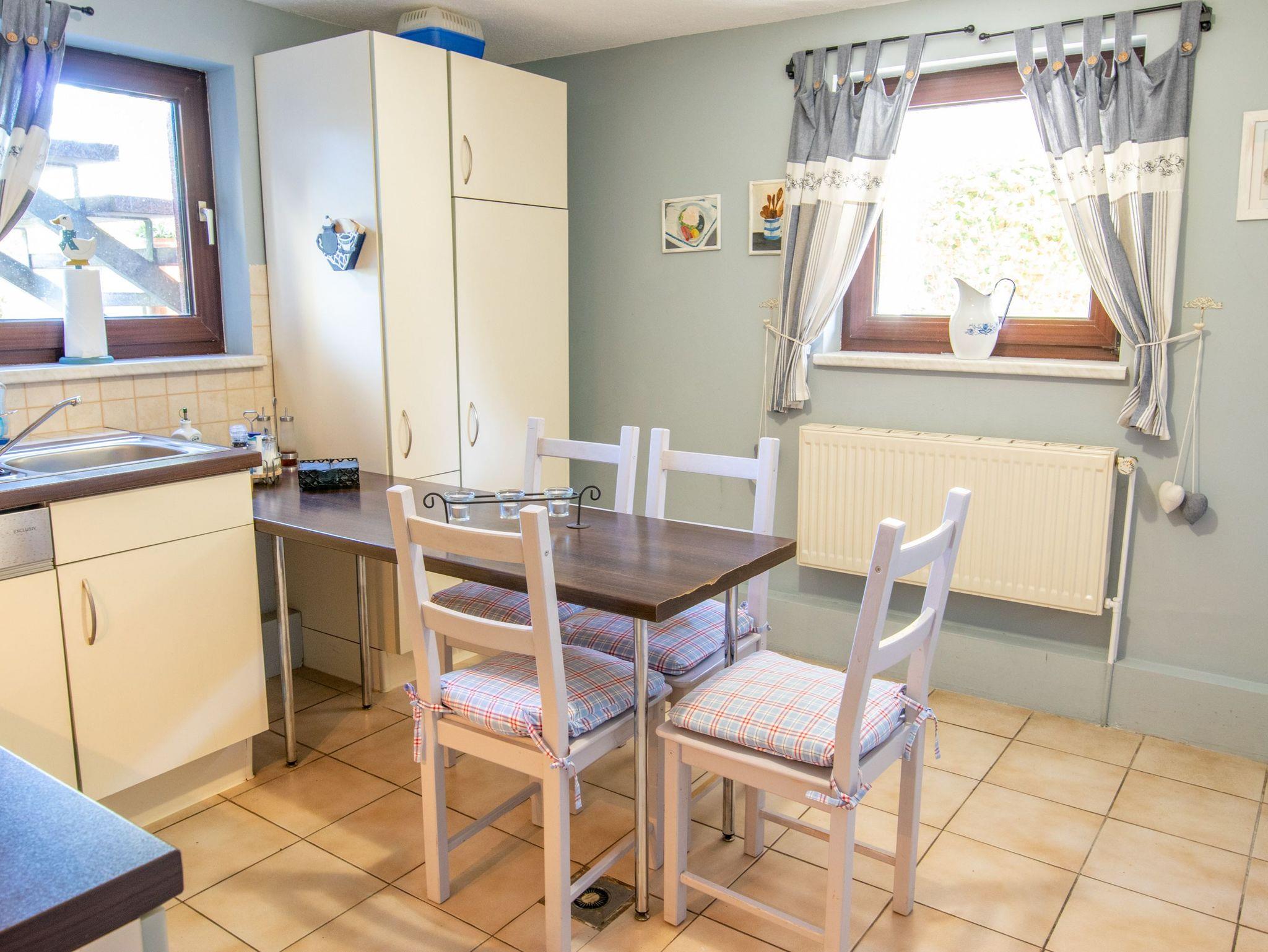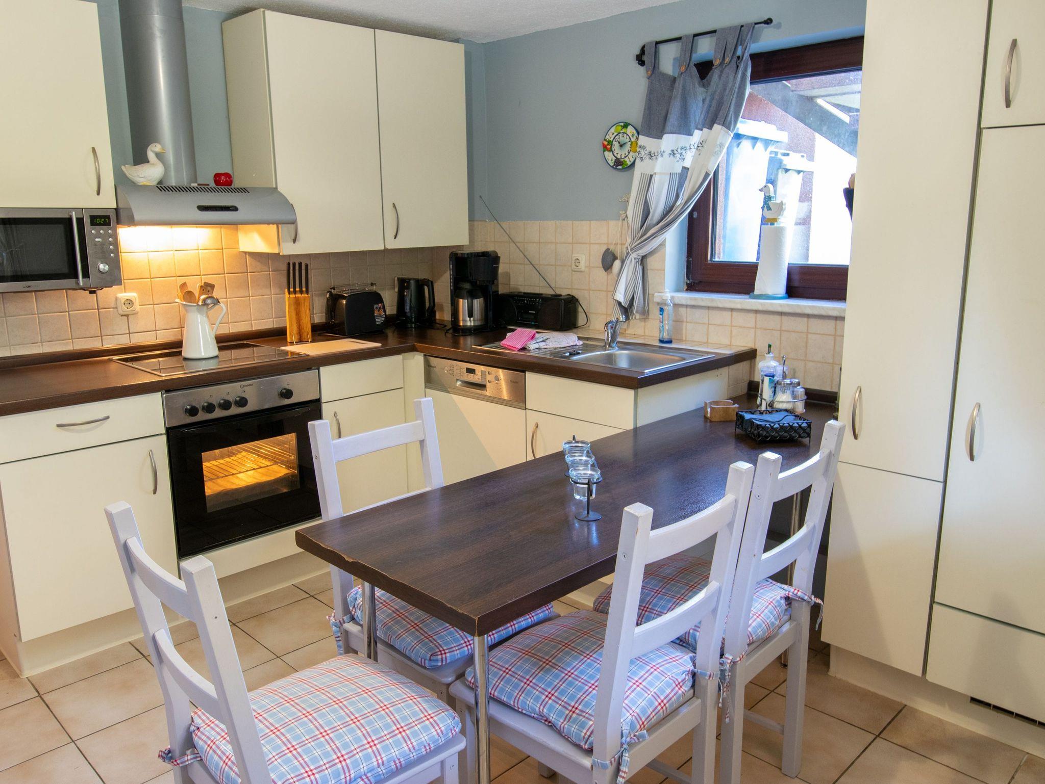 Die geräumige Wohnküche ist ausgestattet mit einer kompletten Einbauküche (Backofen, Ceran-Kochfeld, Kühl- und Gefrierschrank, Mikrowelle, Spülmaschine, Kaffeemaschine etc.) und einer gemütlichen Sitzecke. Das Bad verfügt über Dusche und WC und Fön. Kinderbett und Kinderhochstuhl sind vorhanden.
