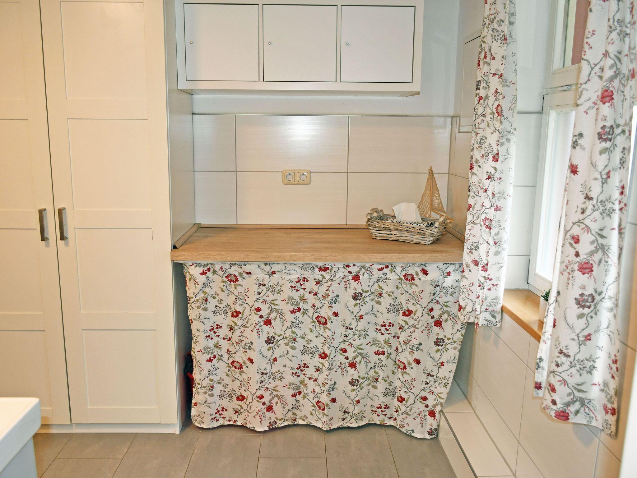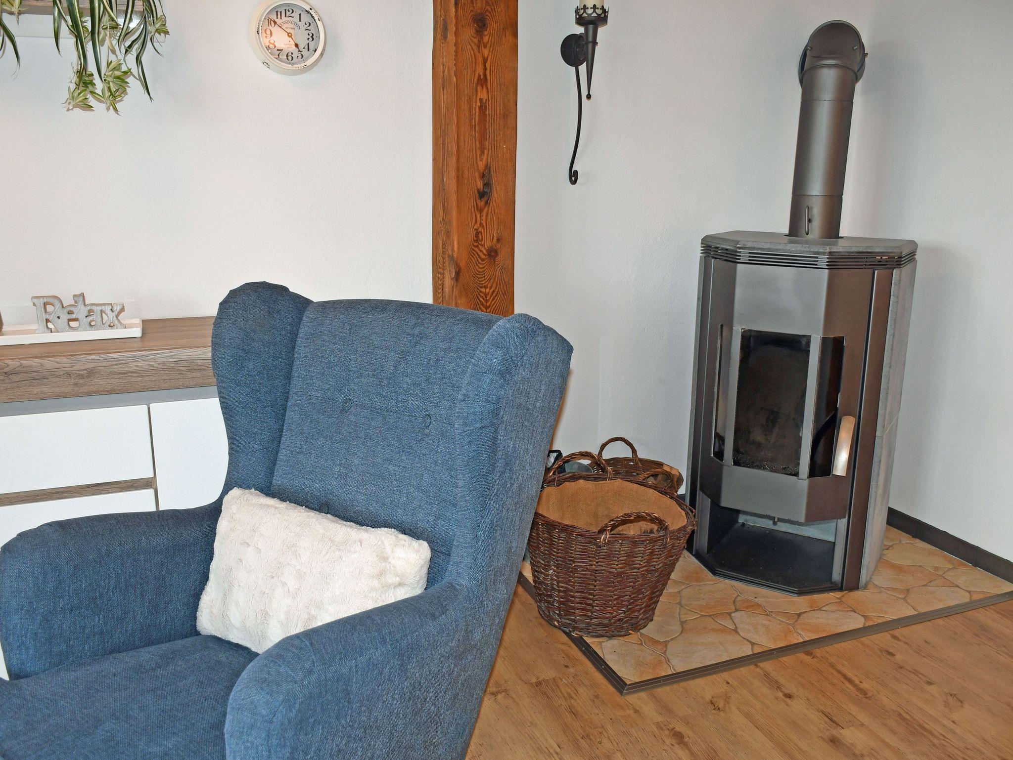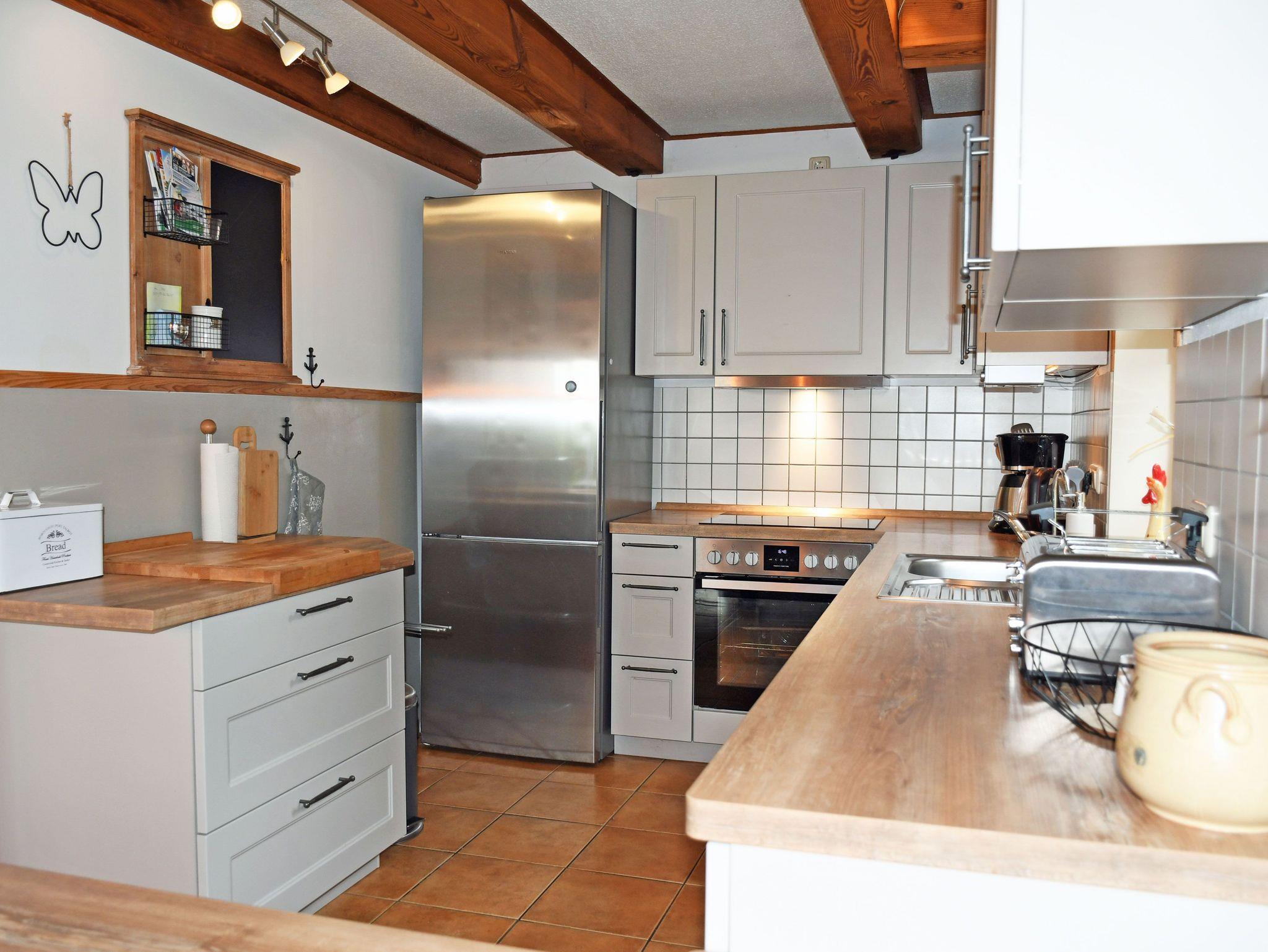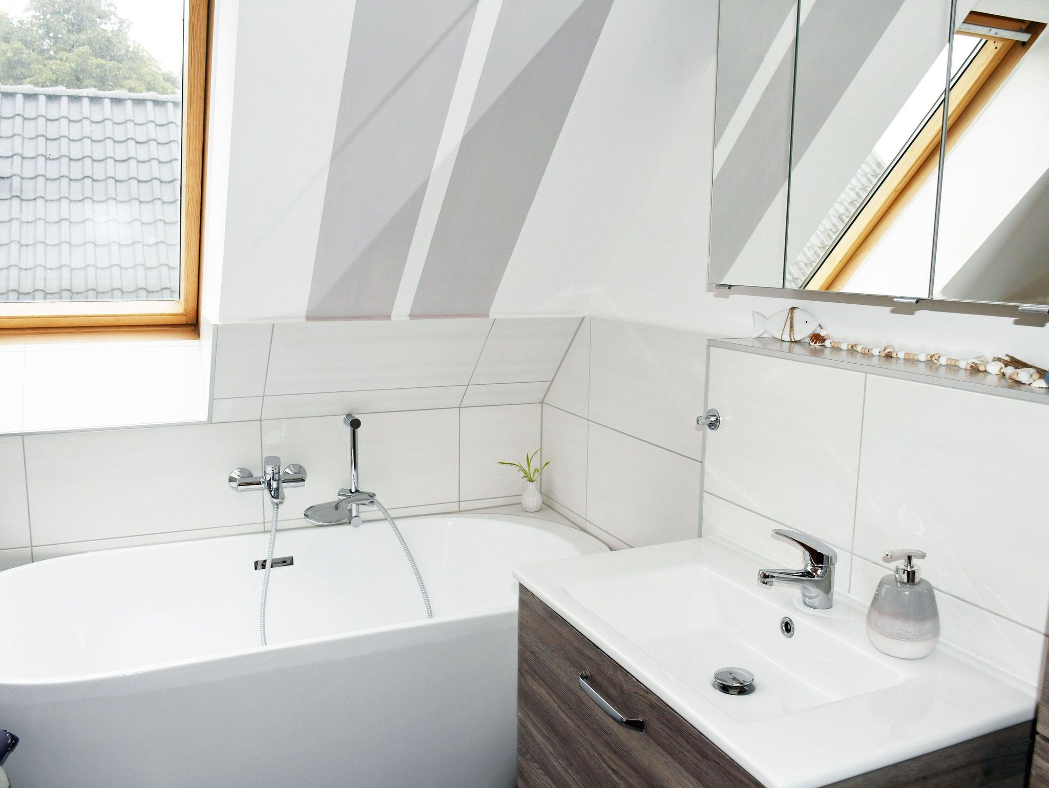 Im unteren Bereich finden sie den Eingangsbereich mit der Treppe, eine große Wohnküche mit dem Familienzimmer und das große Duschbad. Alles ist ebenerdig und mit einer Fußbodenheizung ausgestattet. Einen Kamin können sie in den Wintermonaten natürlich auch nutzen. Das Dachgeschoß verfügt über 3 Schlafräume. Zwei sind mit Doppelbetten (1,80 m und 1,60m breit) ausgestattet und eins mit einem Bett (90 x 200 cm), welches auch zu einem Doppelbett ausgezogen werden kann. Ein Kinderbett und ein Hochstuhl stehen kostenfrei zur Verfügung. Im Obergeschoß gibt es außerdem ein Bad mit Wanne.