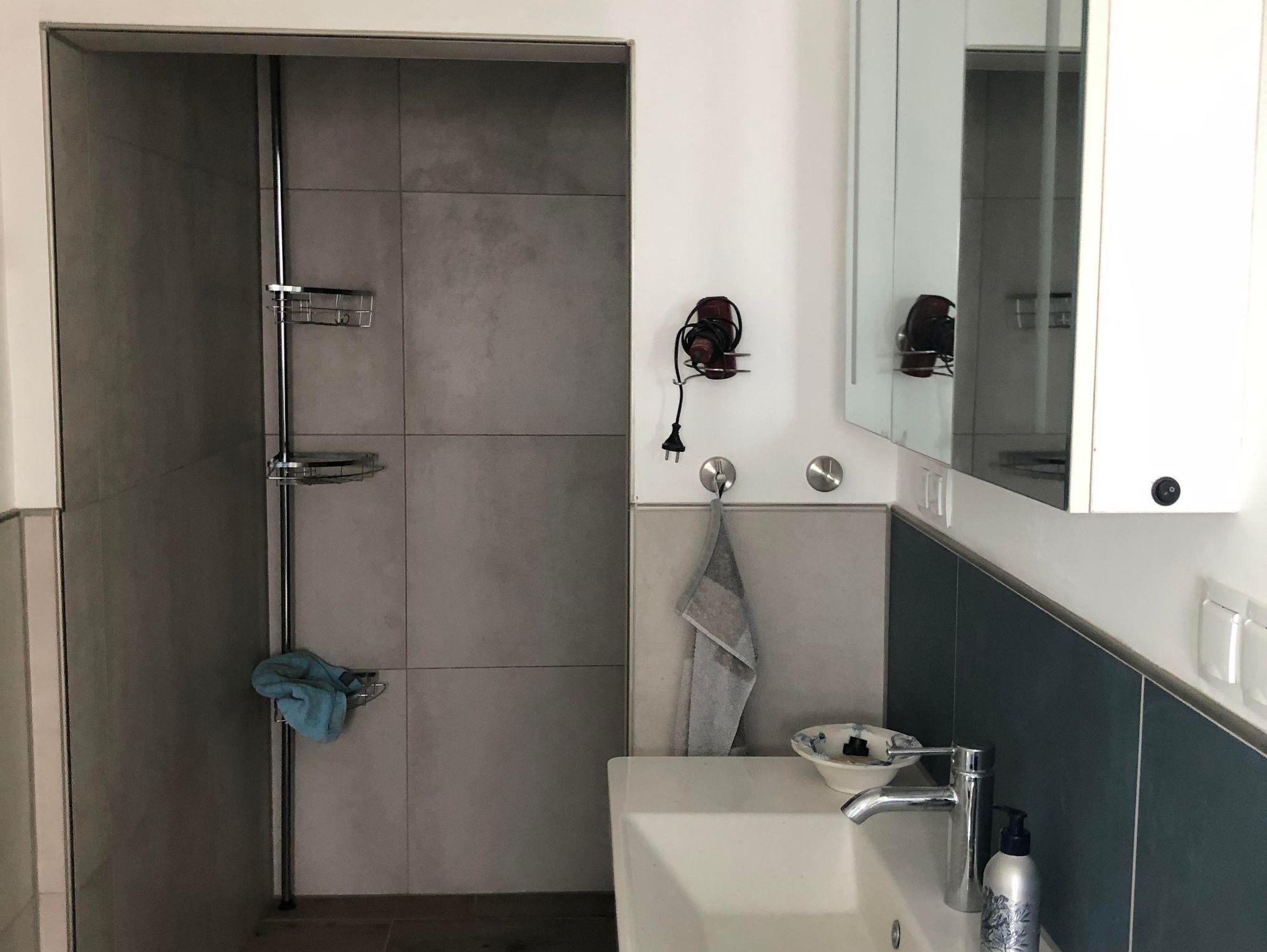 Das Badezimmer ist modern und hat eine begehbare Dusche.