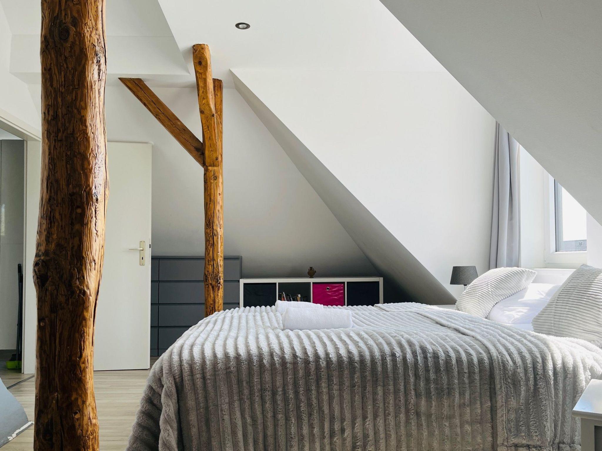 New, luxurious loft flat for up to 6 people.the 85sqm is individually and high quality designed and can be used by families, friends or couples.the flat offers an open kitchen with inviting dining table, a living area with smart TV, a cosy maisonette area with two additional sleeping places and the large bedroom, also with smart TV.the highlight is the 25sqm balcony with a view of the garden over the roofs of Syke....and the whole thing 20 minutes from Bremen.